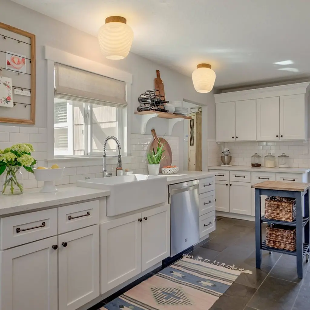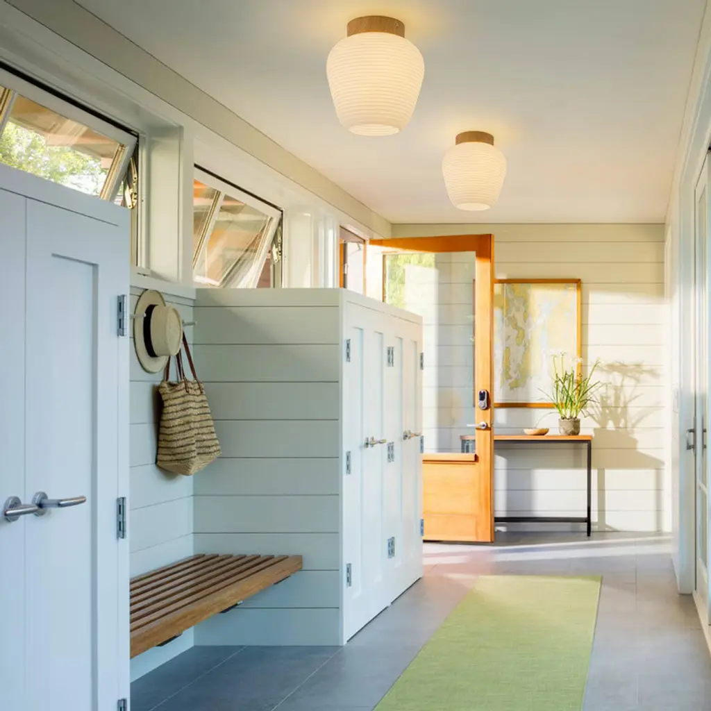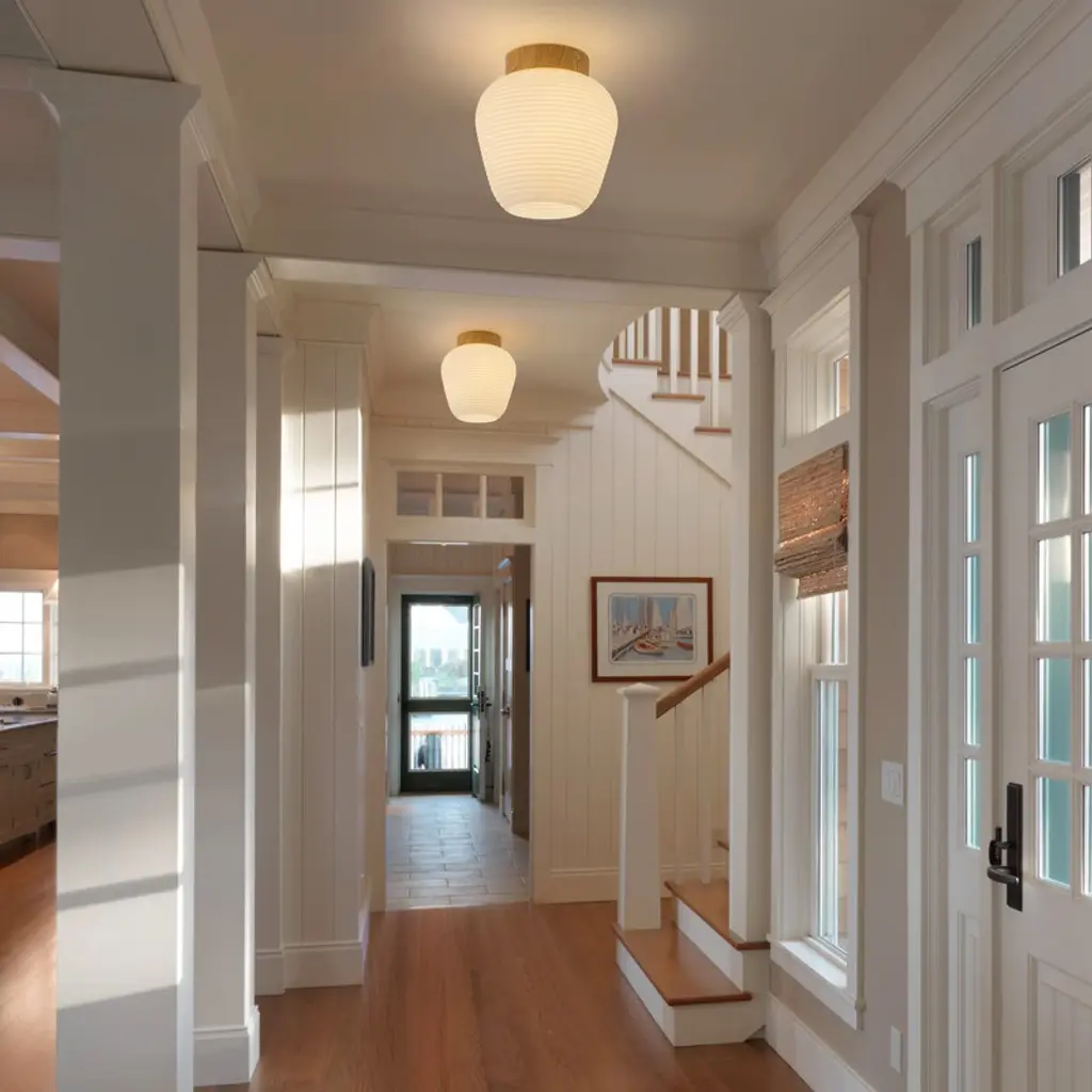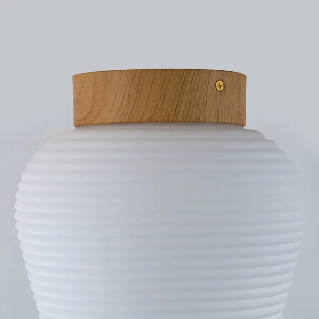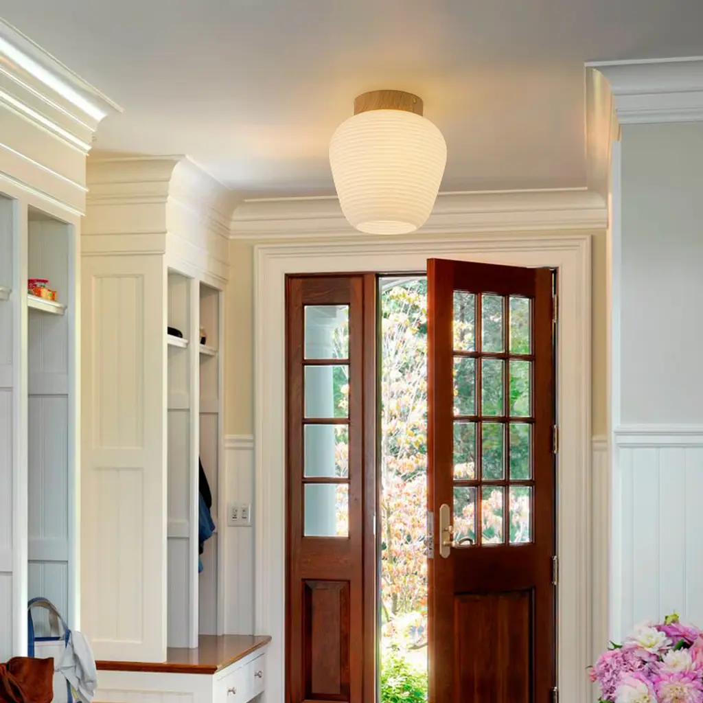 This flush mount ceiling light brings softness and subtle elegance to any room with its horizontally textured white jade glass shade. Inspired by the natural look of a silk cocoon, the design offers both organic texture and warm, diffused light. The compact fixture measures 7 3/4" wide x 7 1/2" high, with a total height of 8 3/5", making it ideal for low ceilings or smaller rooms such as entryways, hallways, or bedrooms. The faux wood grain ceiling plate (4 7/10" wide) adds a warm natural touch through a water-transfer finish. Fitted with a heat-resistant E26 ceramic socket, this light supports bulbs up to 60W (bulb not included).