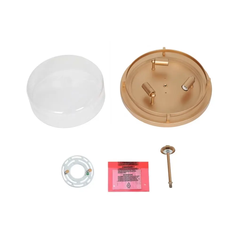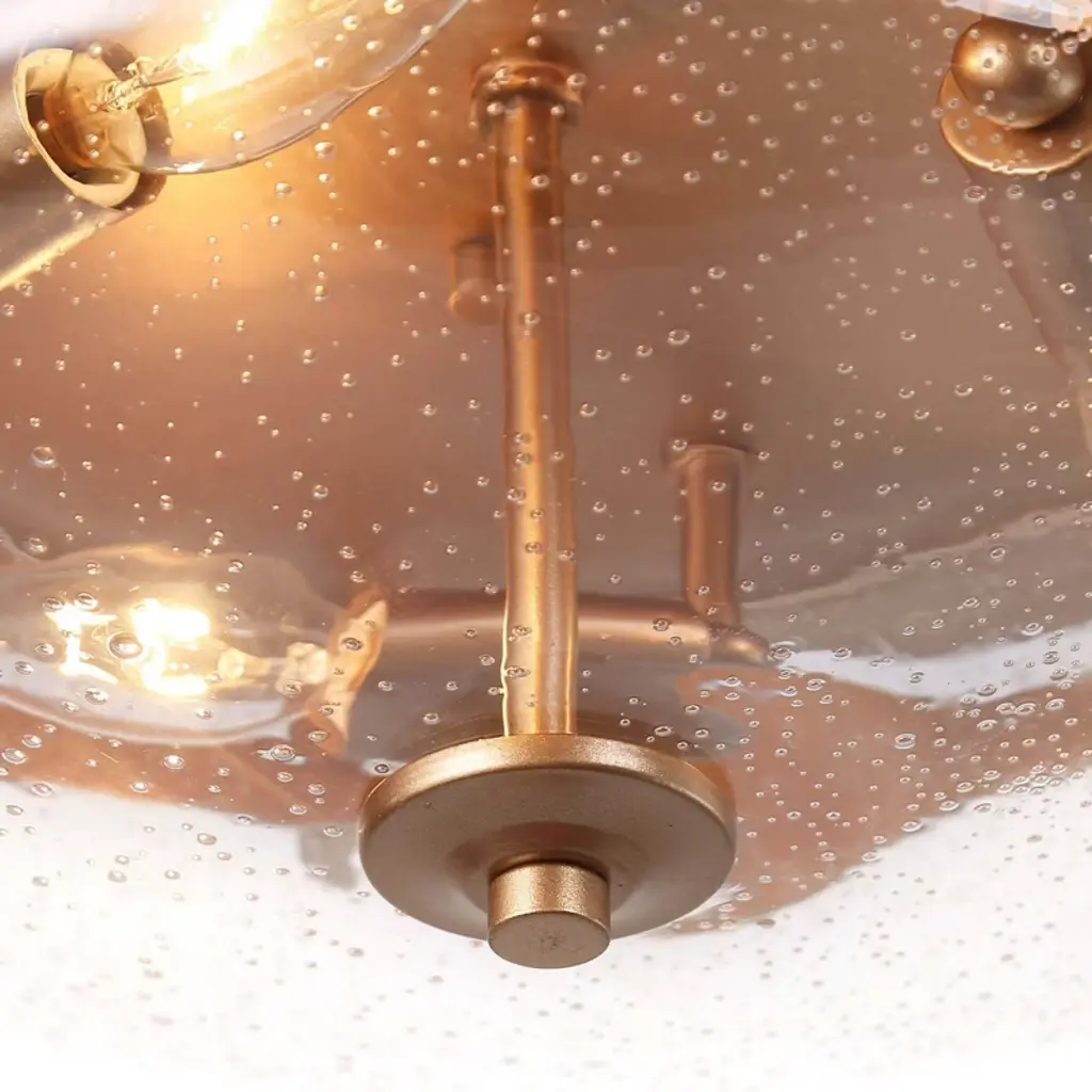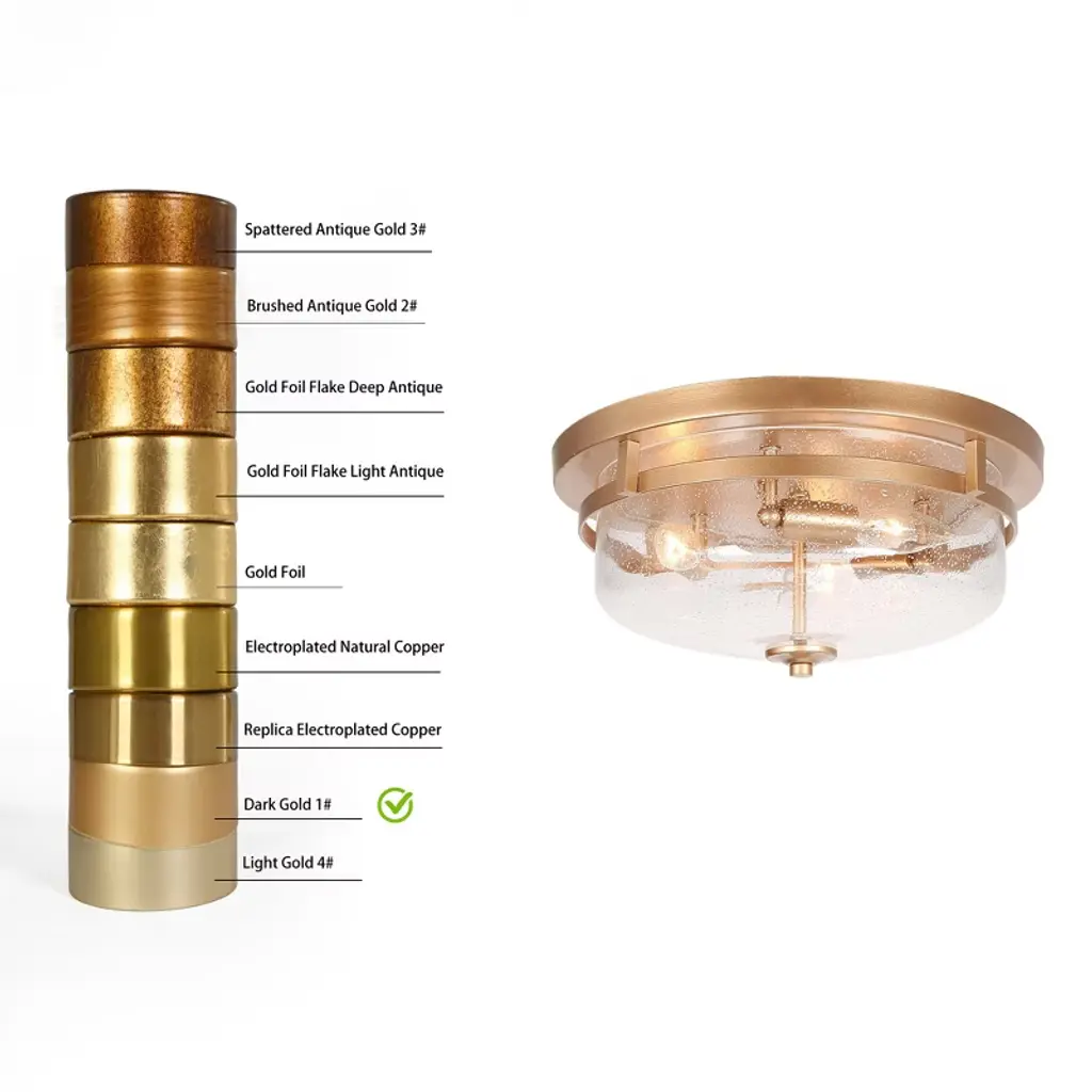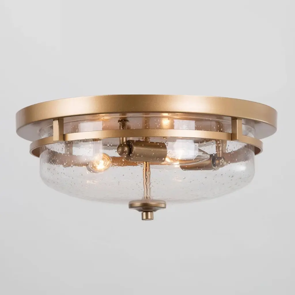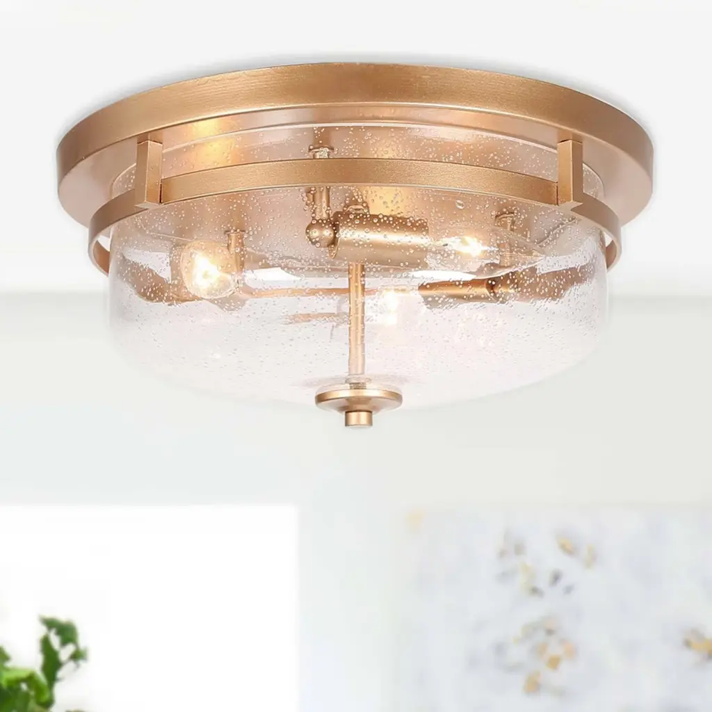 13.5-In matte gold round shape modern LED flush mount ceiling light features a high-end matte gold finish and clear seeded glass shade. The seeded glass adds a romantic touch to this light and makes it functional as well as beautiful. Perfect for the modern contemporary style of home decor. Recommend using at the foyer, kitchen, bedroom, staircase, hallways, etc.