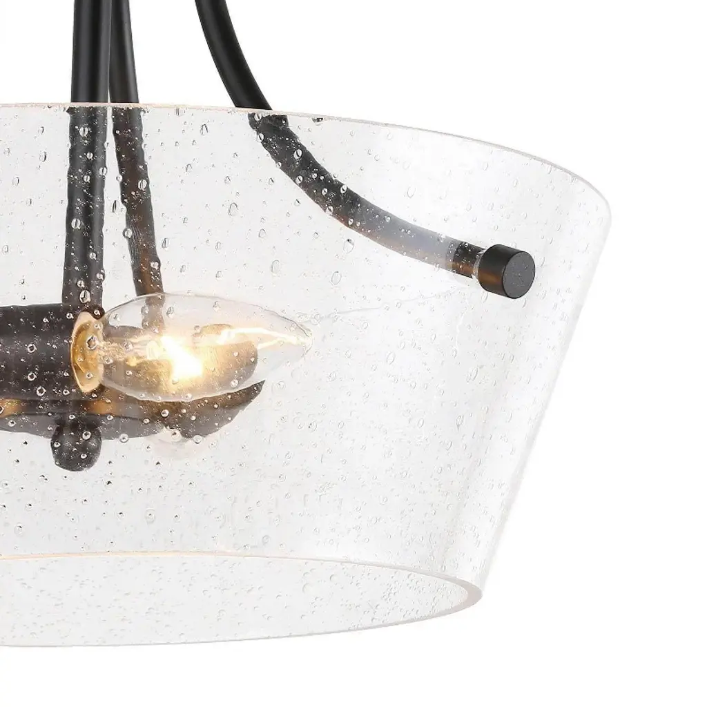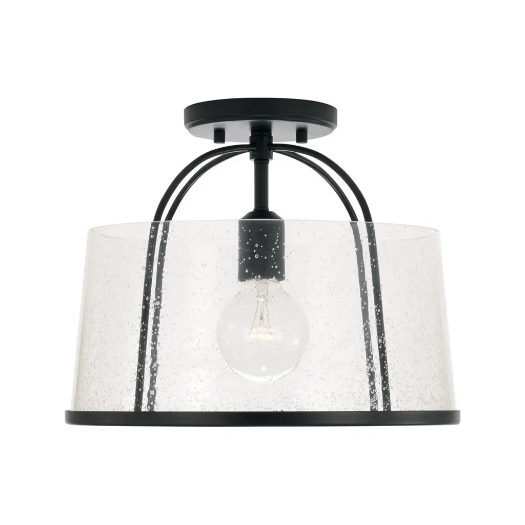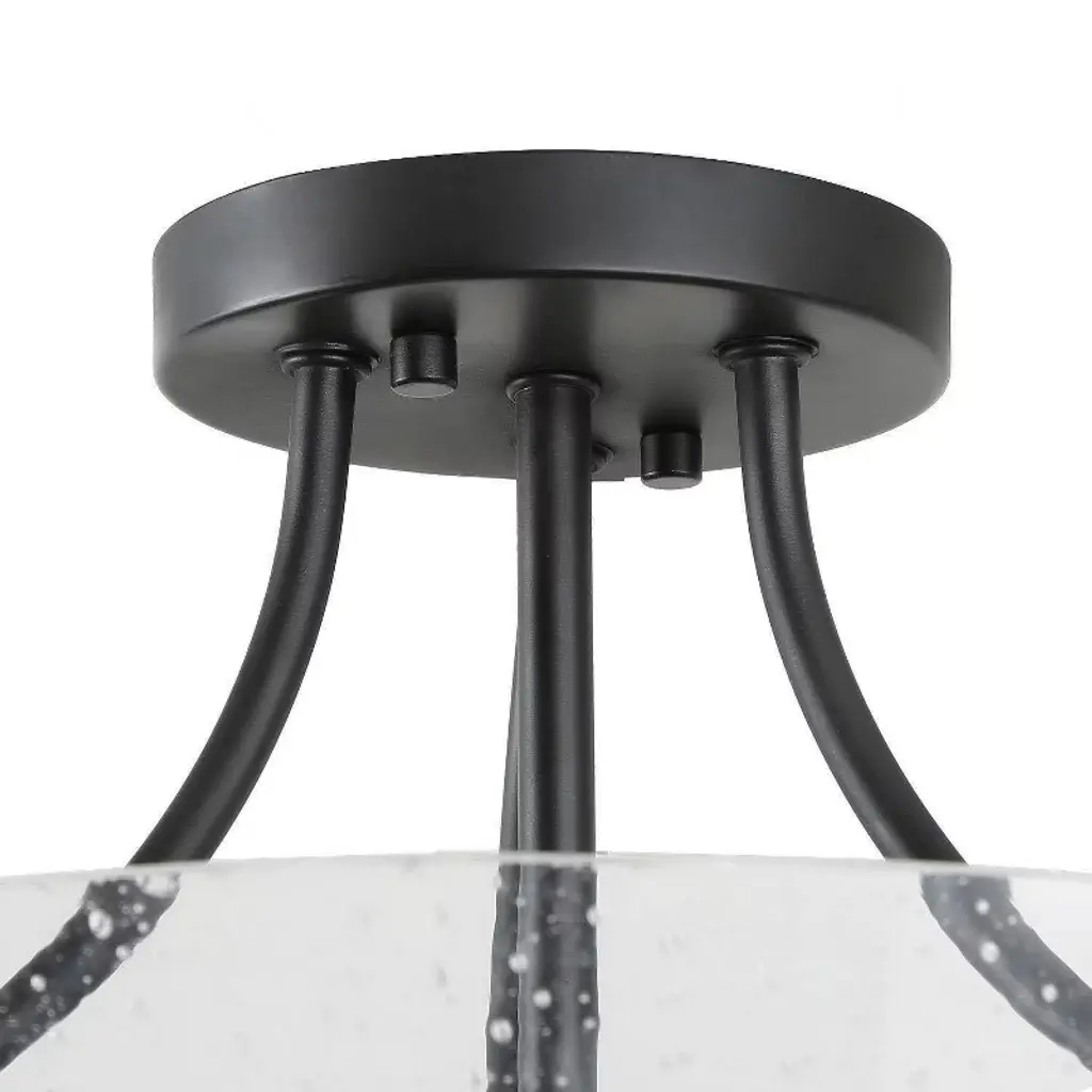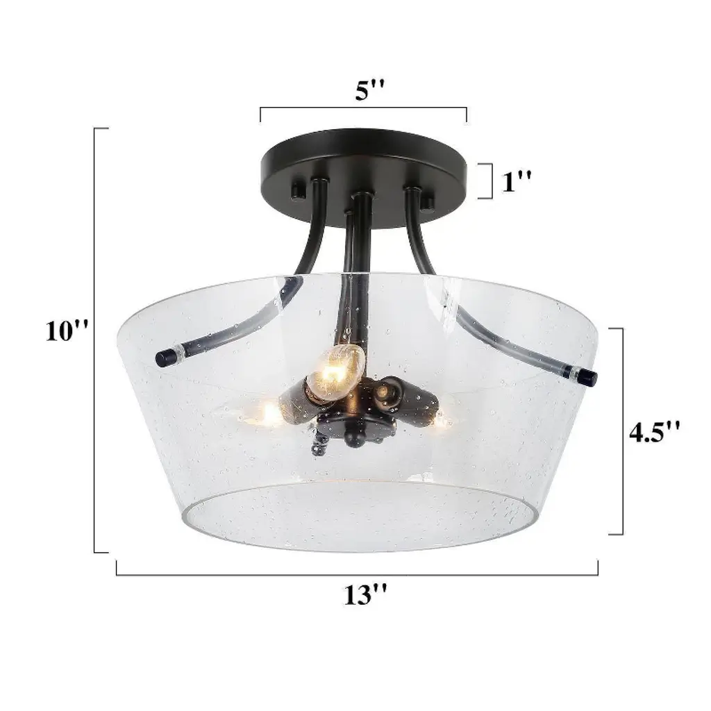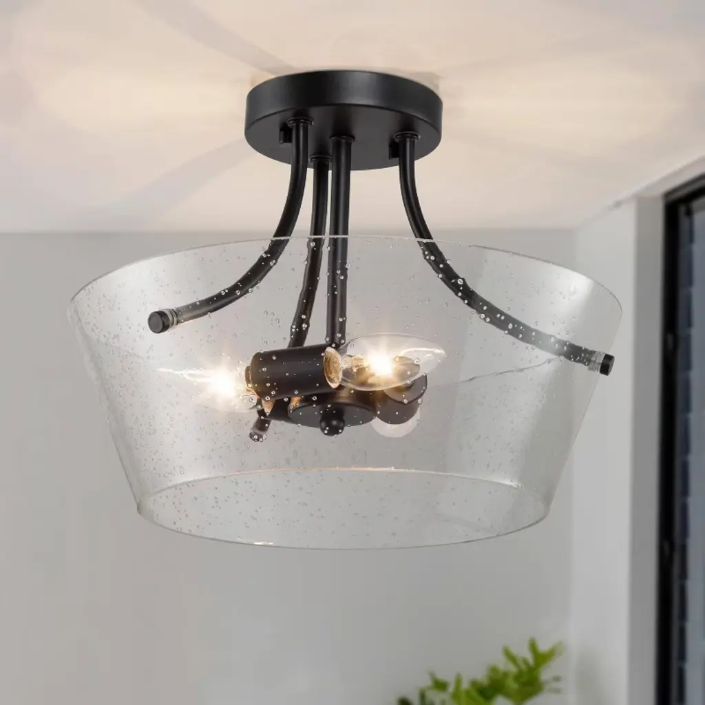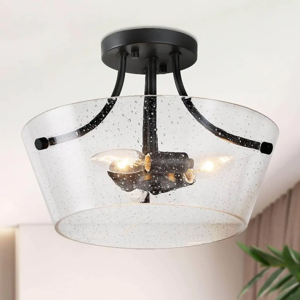 This 13-in transitional drum shape LED flush mount light from LNC is inspired with transitional metal and glass elements, with well painted matte black frame with seeded dreamy glass shade perfectly connected by two curve arms, this elegant and chic design flush mount light will provide effortless light into your kitchen, dining room, or back patio.