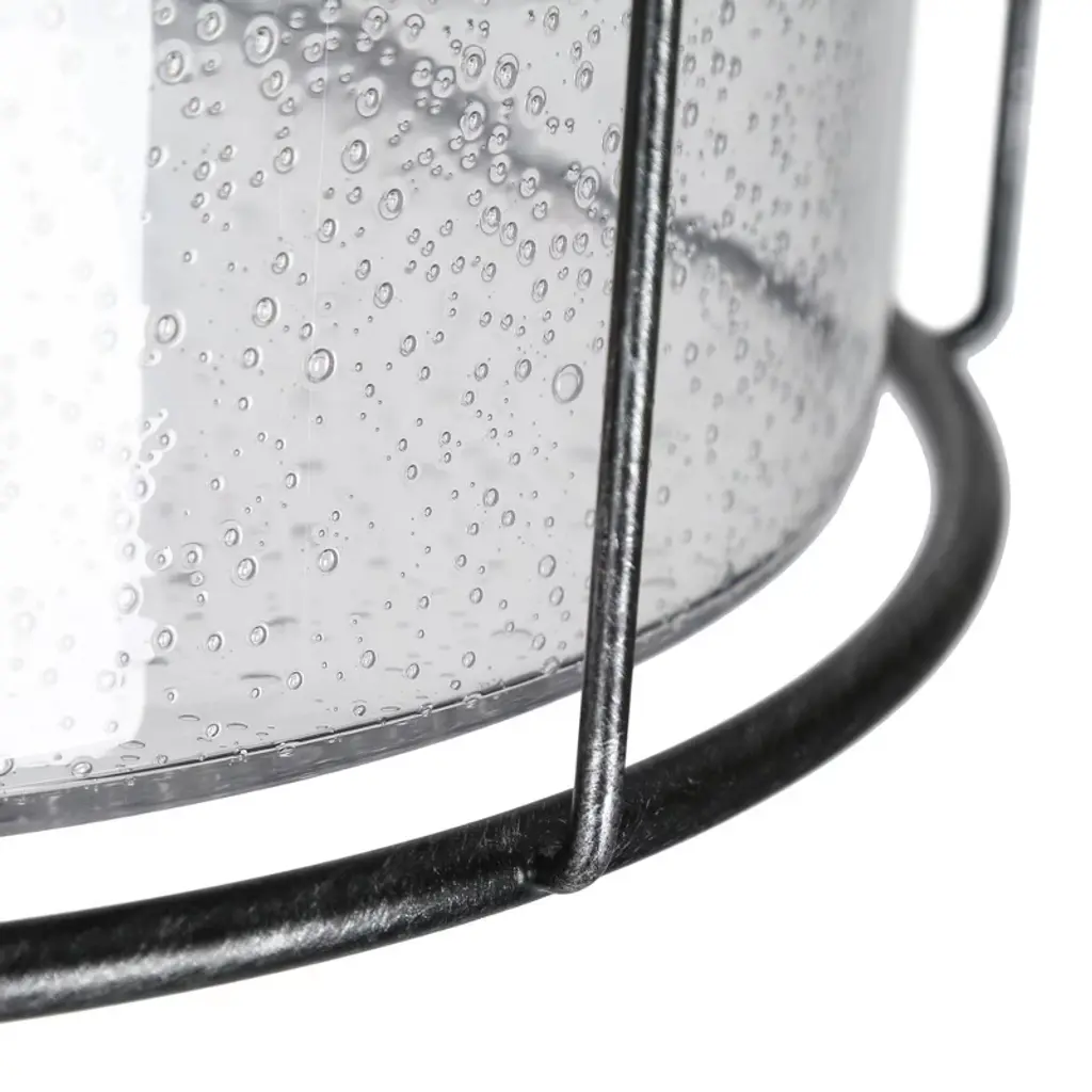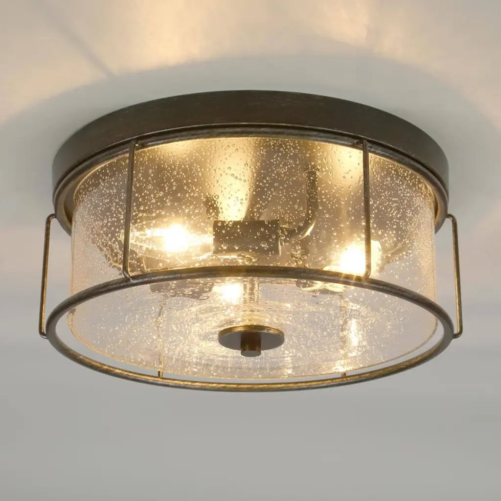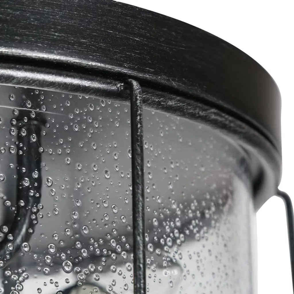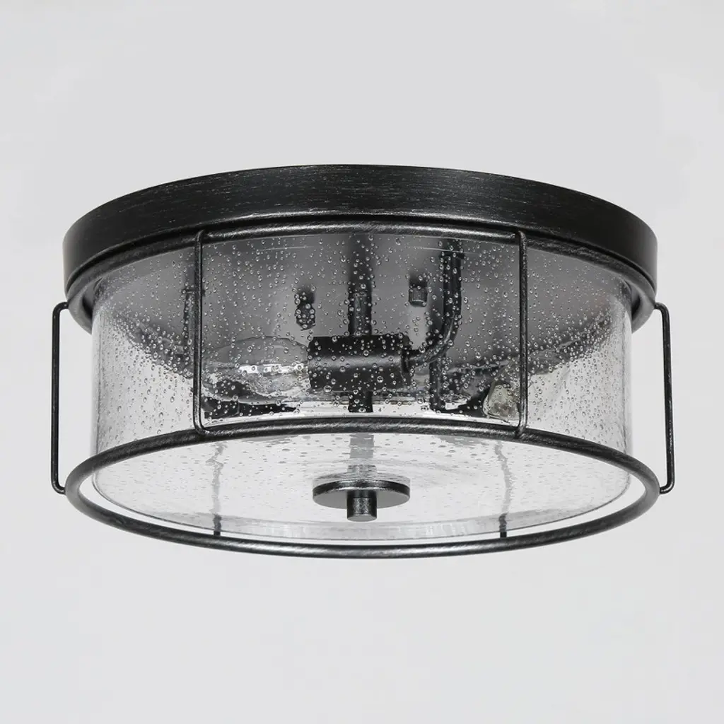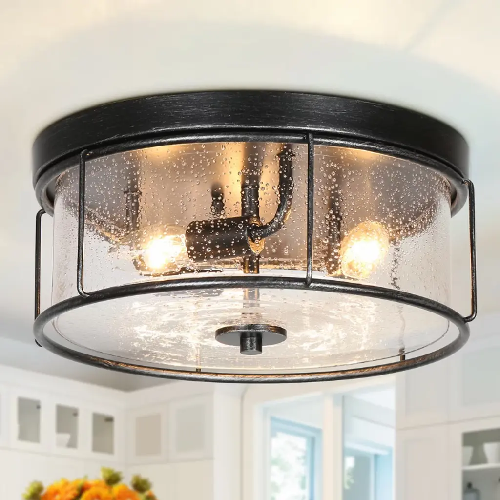 This 3-light brushed black cage seeded glass farmhouse round flush mount light adds texture and dimensionality to any decor. Perfectly accentuates rustic, vintage, transitional or modern industrial decor. With its clean lines and striking look, this design is perfect for adding curb appeal to your home, or use it indoors in an entryway.