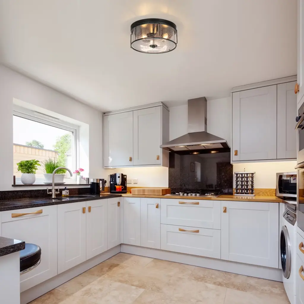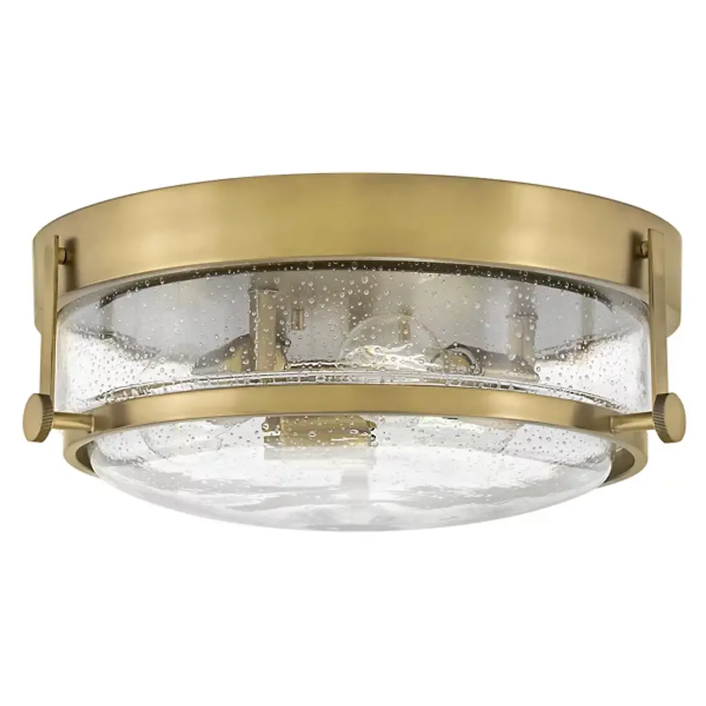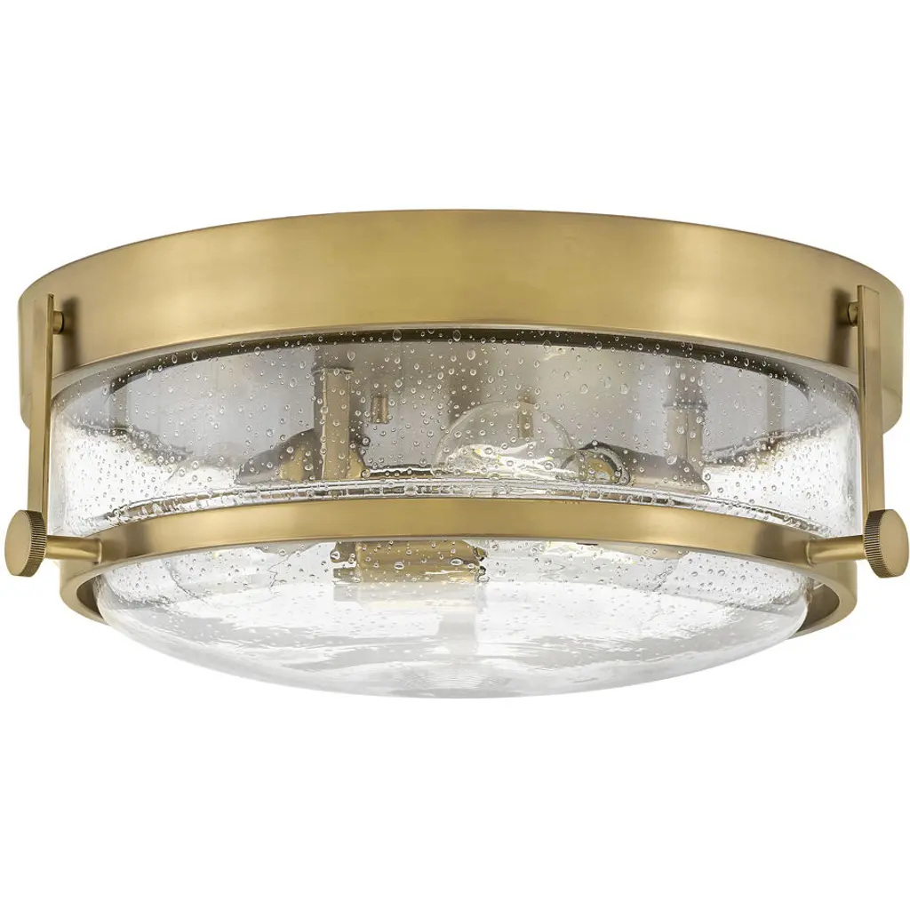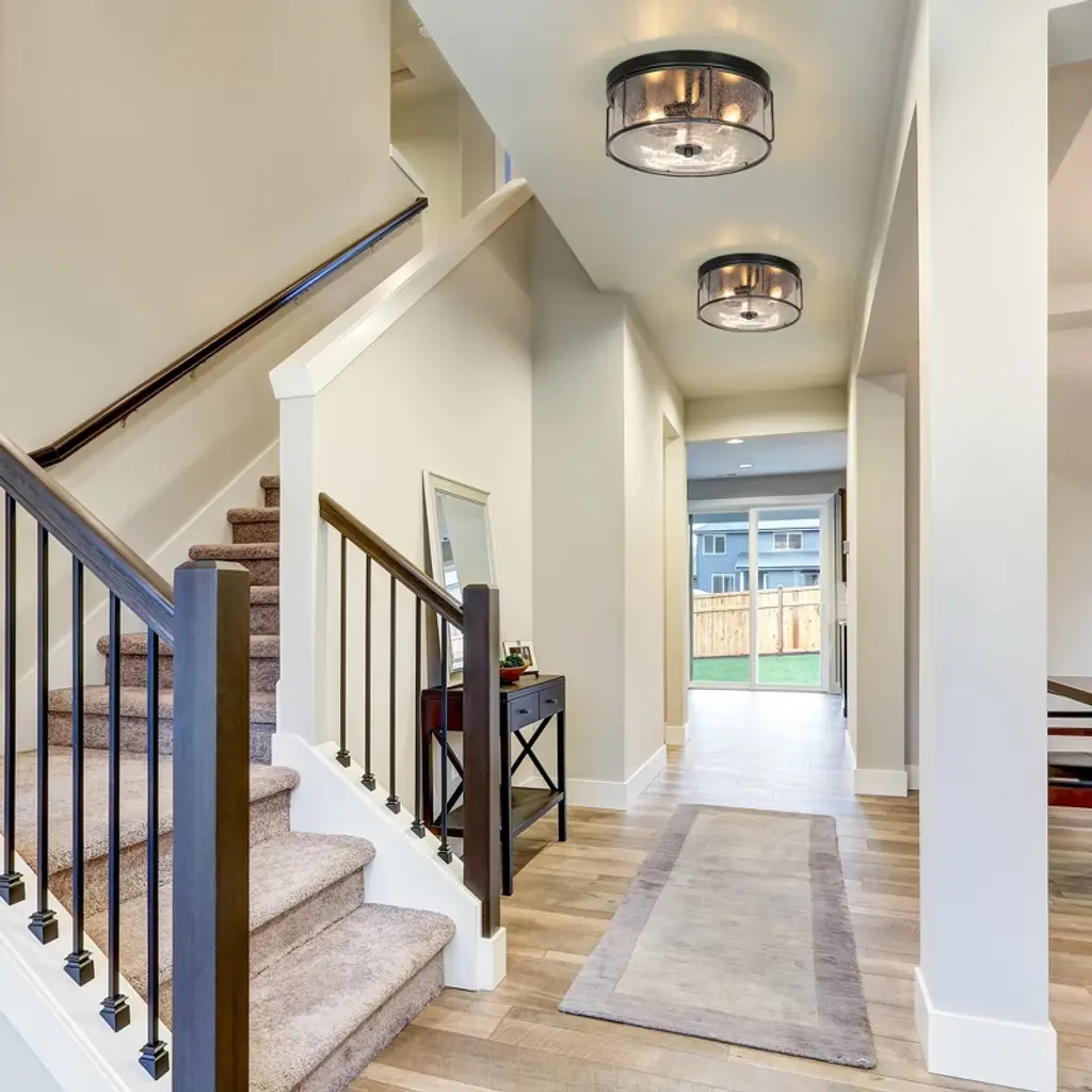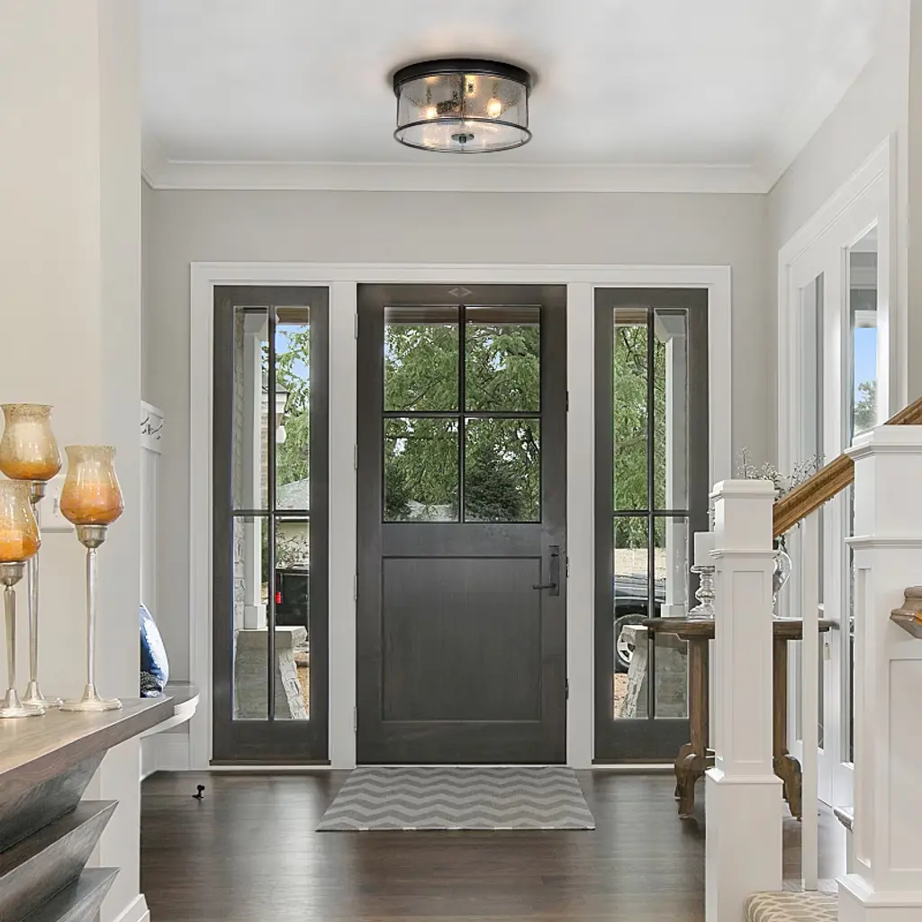 This 3-light brushed black cage seeded glass farmhouse round flush mount light adds texture and dimensionality to any decor. Perfectly accentuates rustic, vintage, transitional or modern industrial decor. With its clean lines and striking look, this design is perfect for adding curb appeal to your home, or use it indoors in an entryway.