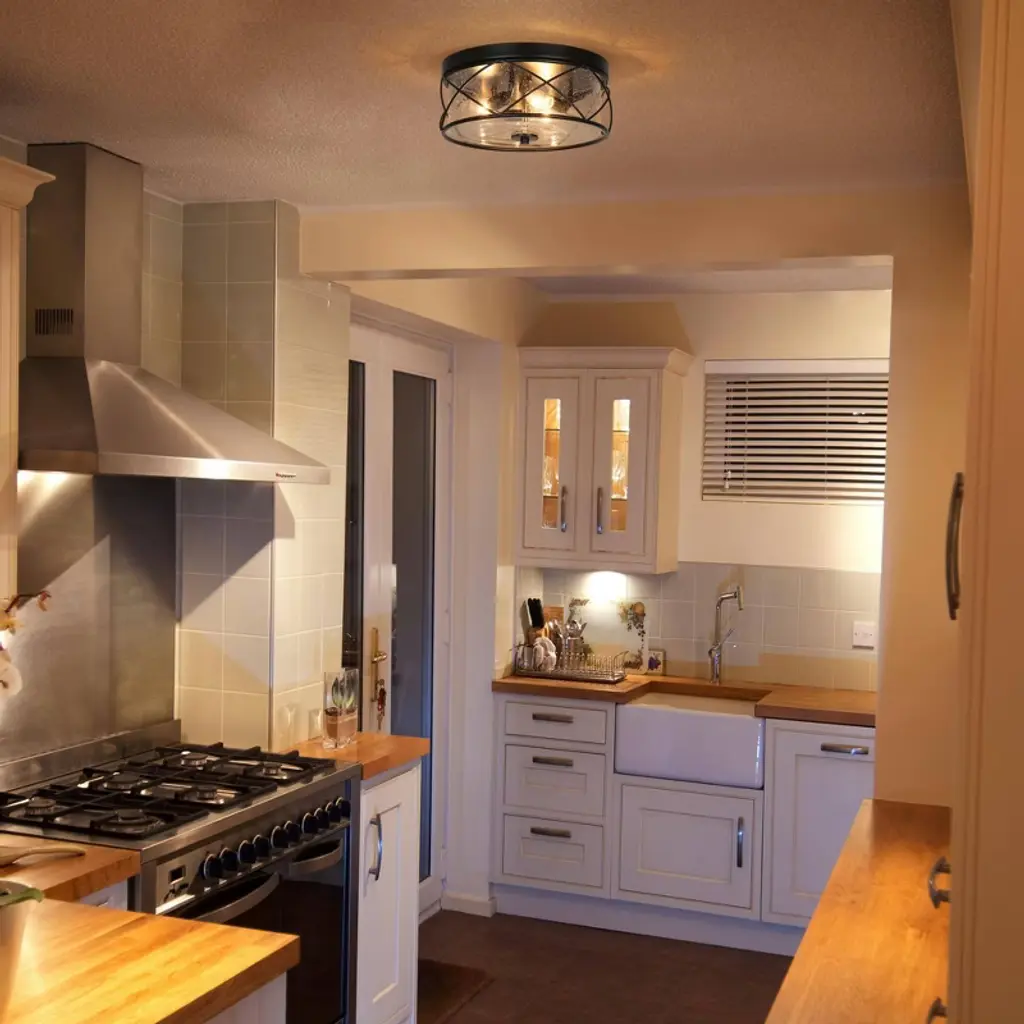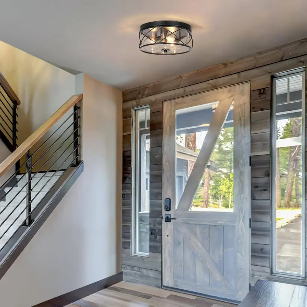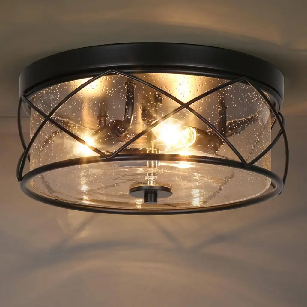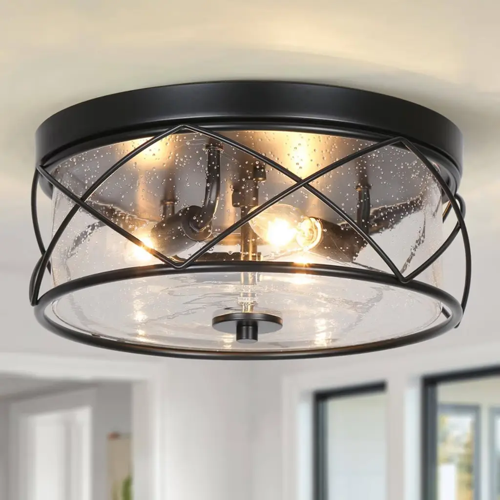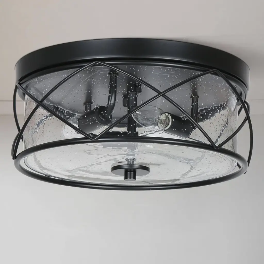 With its convenient flush mount design and gorgeous modern farmhouse style, the 3-lights matte black cage seeded glass farmhouse flush mount light is a versatile fixture. Its sleek, rustic and vintage appearance features a black steel frame surrounding a clear seeded glass shade that houses three bulbs. Use this special flush mount ceiling light to welcome contemporary and vintage spirit to your house.