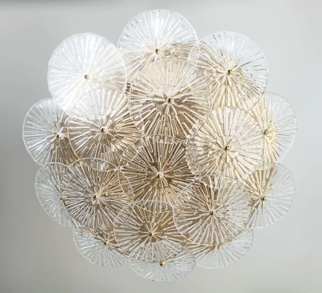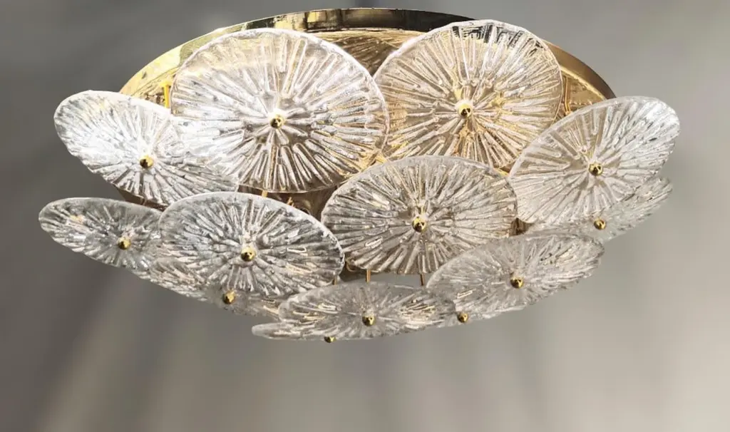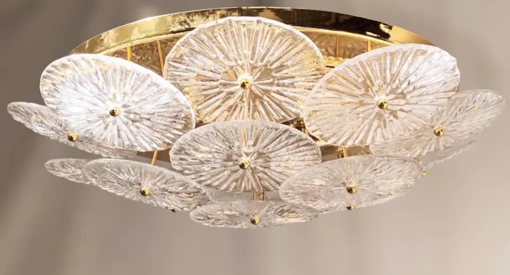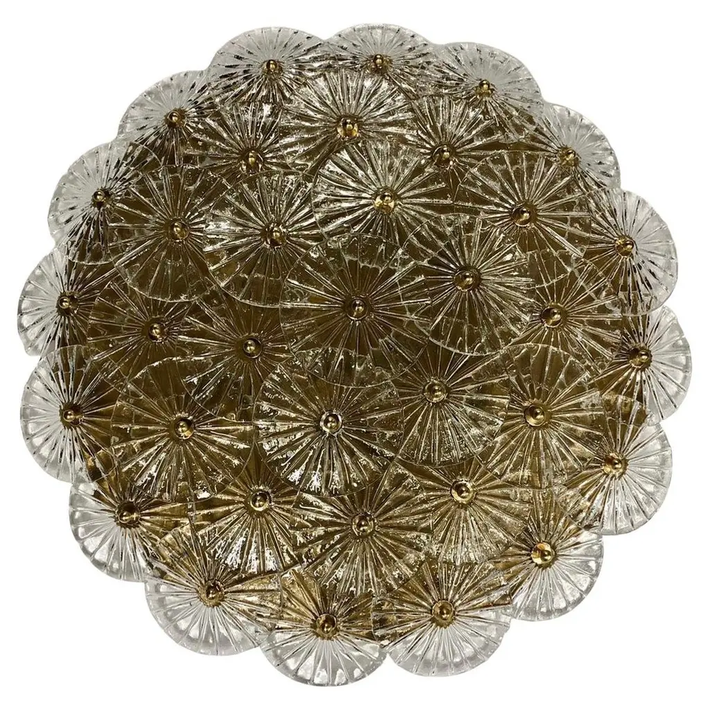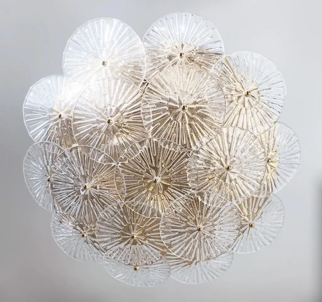 Italian flush mount with layered textured clear Murano glass discs mounted on 24 karat gold finish metal frame, designed by Fabio Bergomi for Fabio Ltd / Made in Italy6 lights / E12 or E14 type / max 40W eachMeasures: Diameter 21.5 inches, height 6 inchesOrder only / This item ships from ItalyOrder reference #: FABIOLTD C825