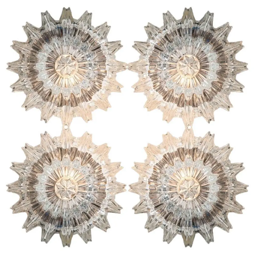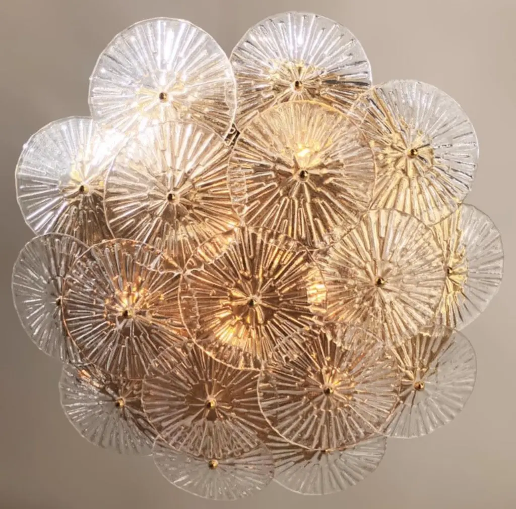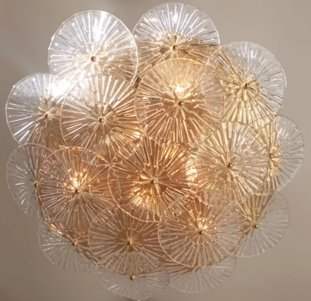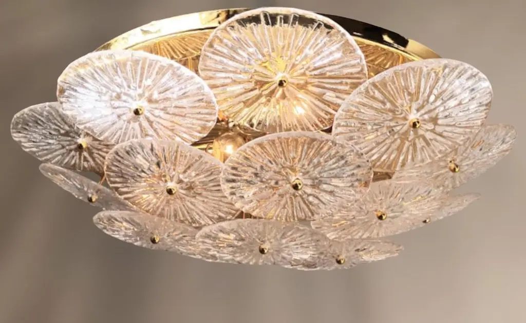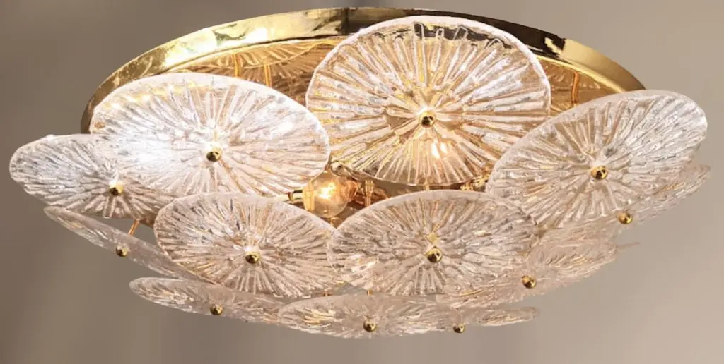 Italian flush mount with layered textured clear Murano glass discs mounted on 24 karat gold finish metal frame, designed by Fabio Bergomi for Fabio Ltd / Made in Italy6 lights / E12 or E14 type / max 40W eachMeasures: Diameter 21.5 inches, height 6 inchesOrder only / This item ships from ItalyOrder reference #: FABIOLTD C825