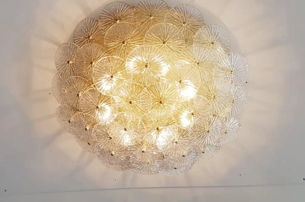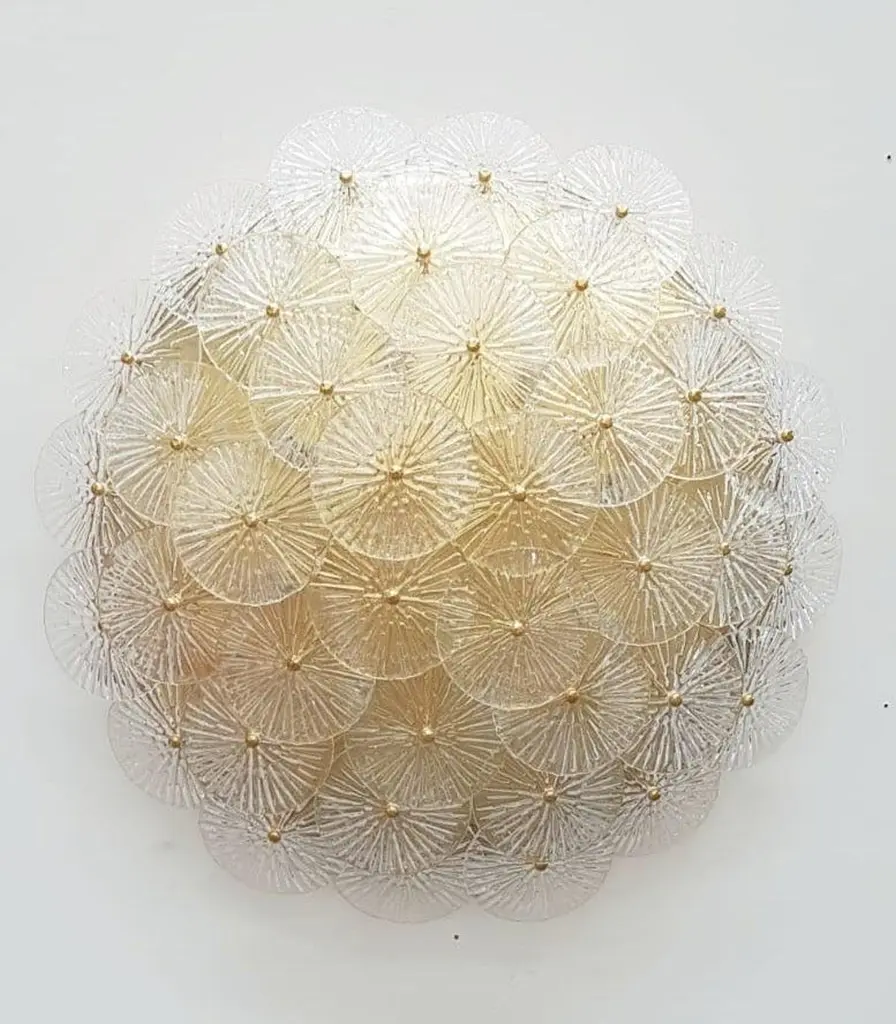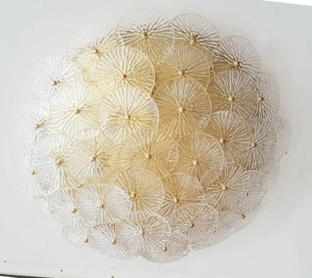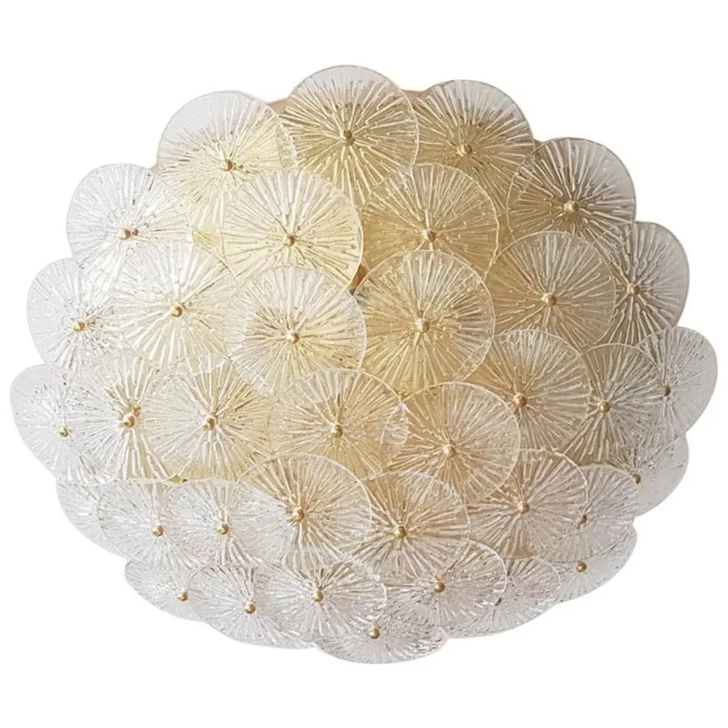 Impressive Italian flushmount with layered textured clear Murano glass discs mounted on solid brass frame in polished lacquered finish, designed by Fabio Bergomi for Fabio Ltd / Made in Italy8 lights / E12 or E14 type / max 40W eachMeasures: Diameter 33.5 inches, height 11 inchesOrder only / This item ships from ItalyOrder reference #: FABIOLTD C658 CLEAR
