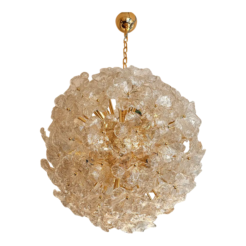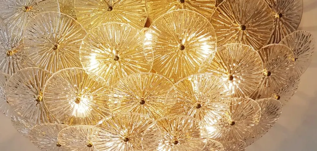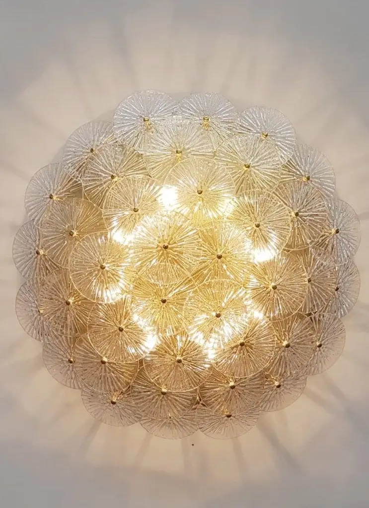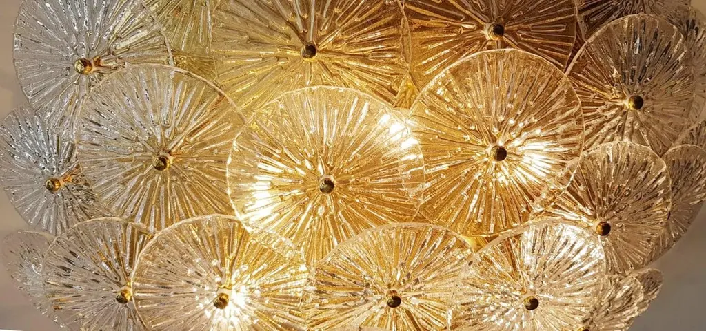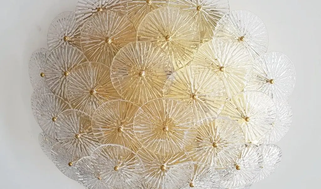 Impressive Italian flushmount with layered textured clear Murano glass discs mounted on solid brass frame in polished lacquered finish, designed by Fabio Bergomi for Fabio Ltd / Made in Italy8 lights / E12 or E14 type / max 40W eachMeasures: Diameter 33.5 inches, height 11 inchesOrder only / This item ships from ItalyOrder reference #: FABIOLTD C658 CLEAR