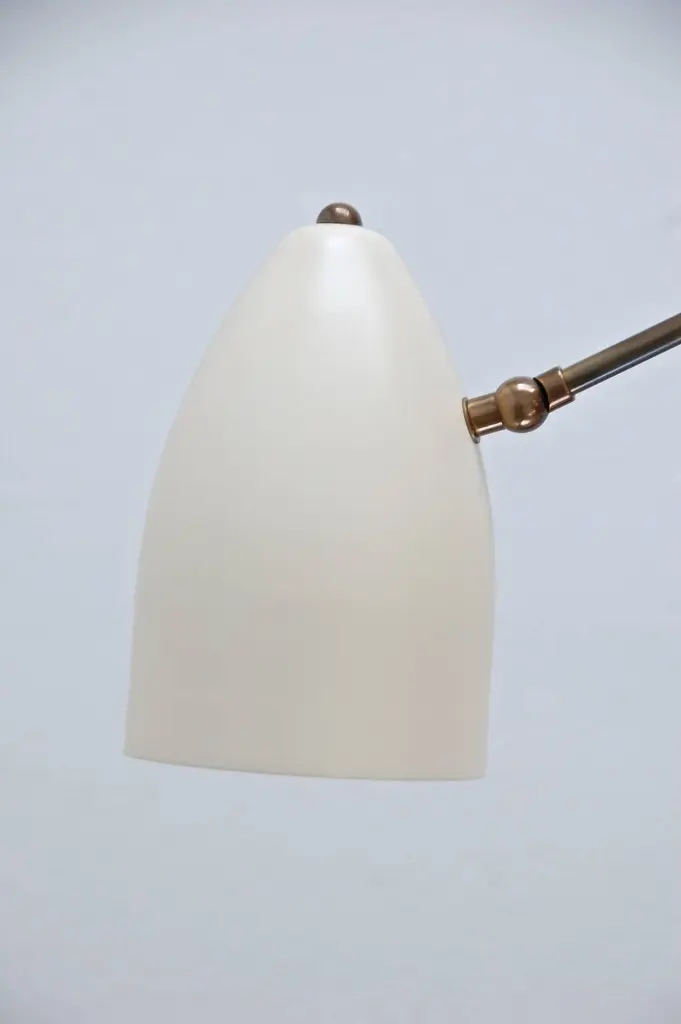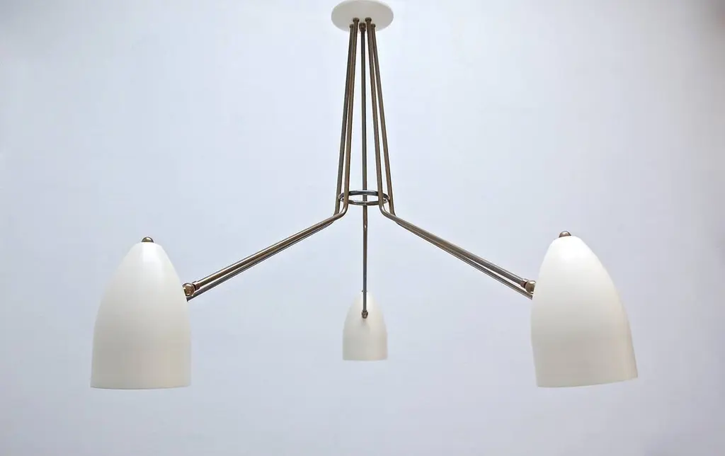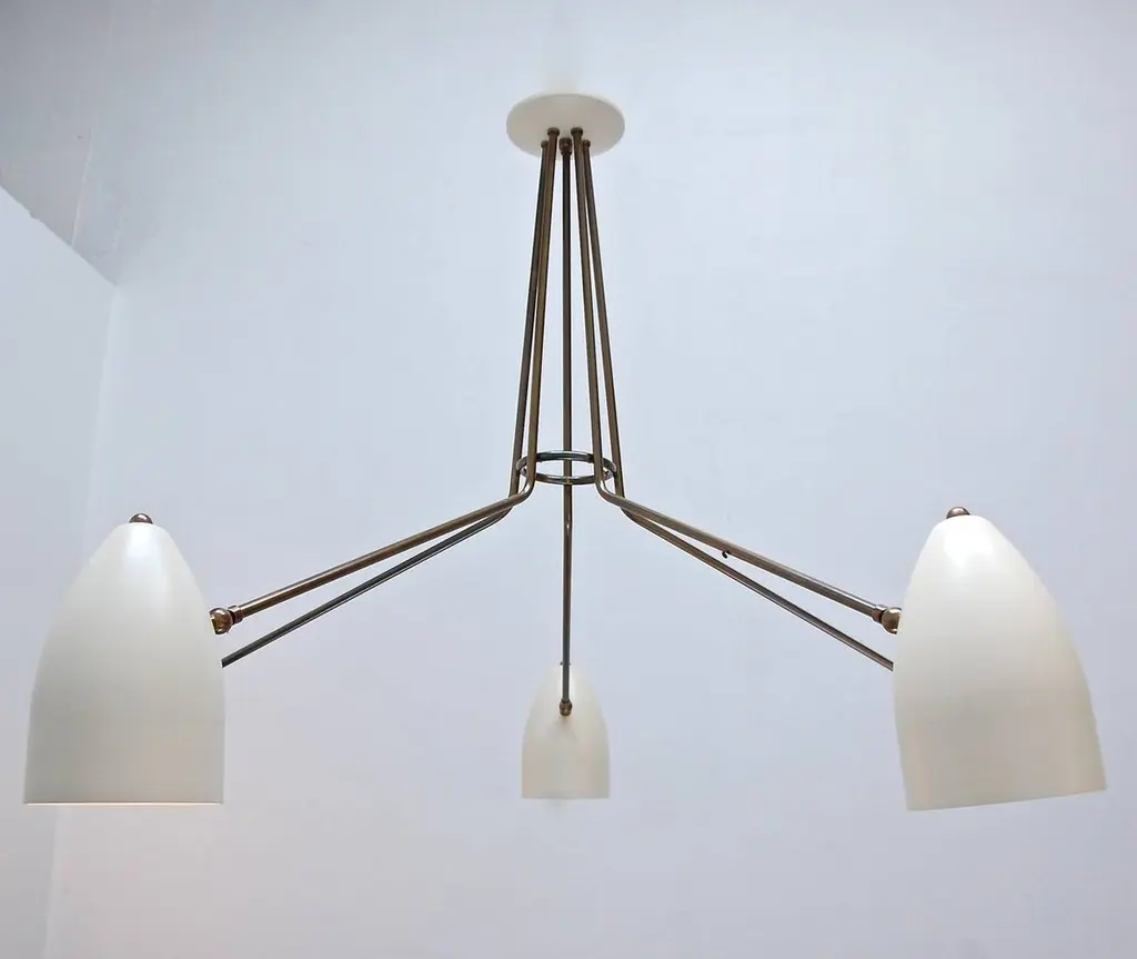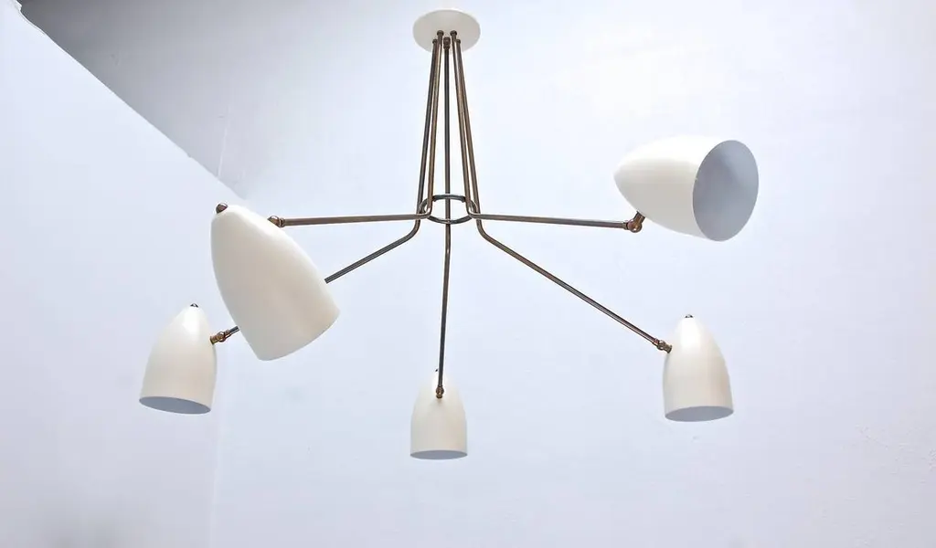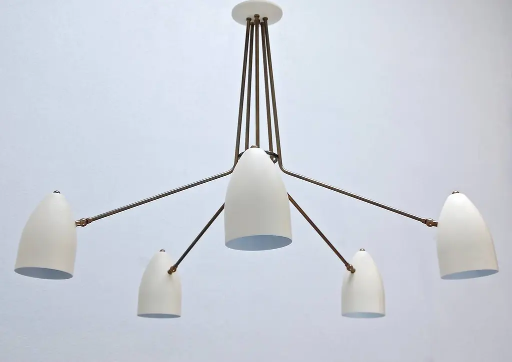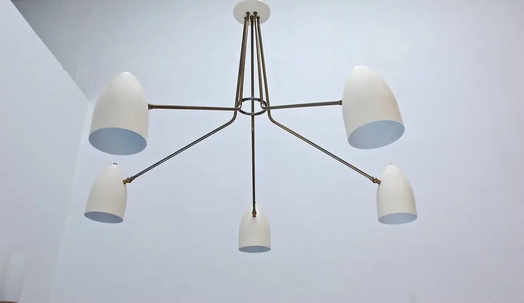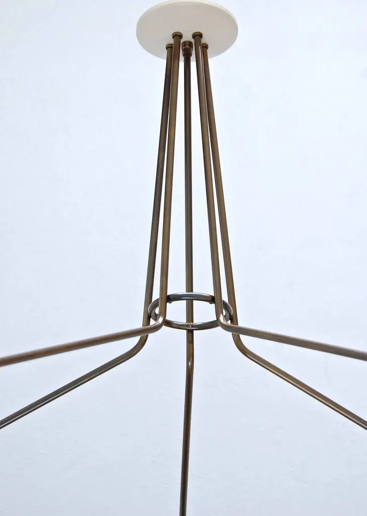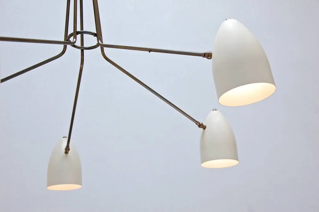 Beautiful Minimalist five-arm flush mount chandelier with five cone shades that pivot up and down for varied lighting. Light brass patina finish and painted aluminum.E26 based socket per shade.