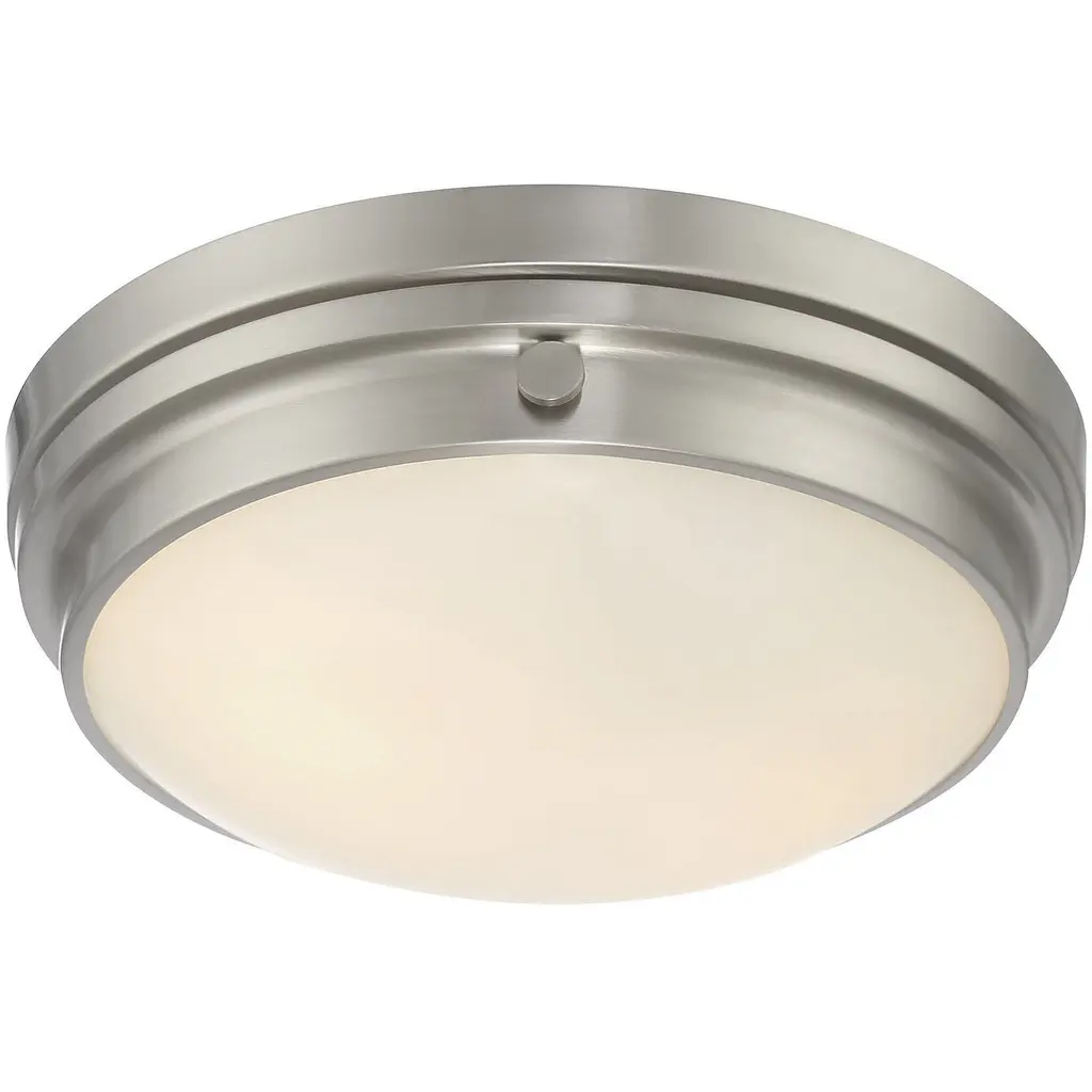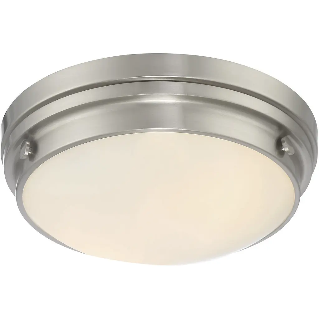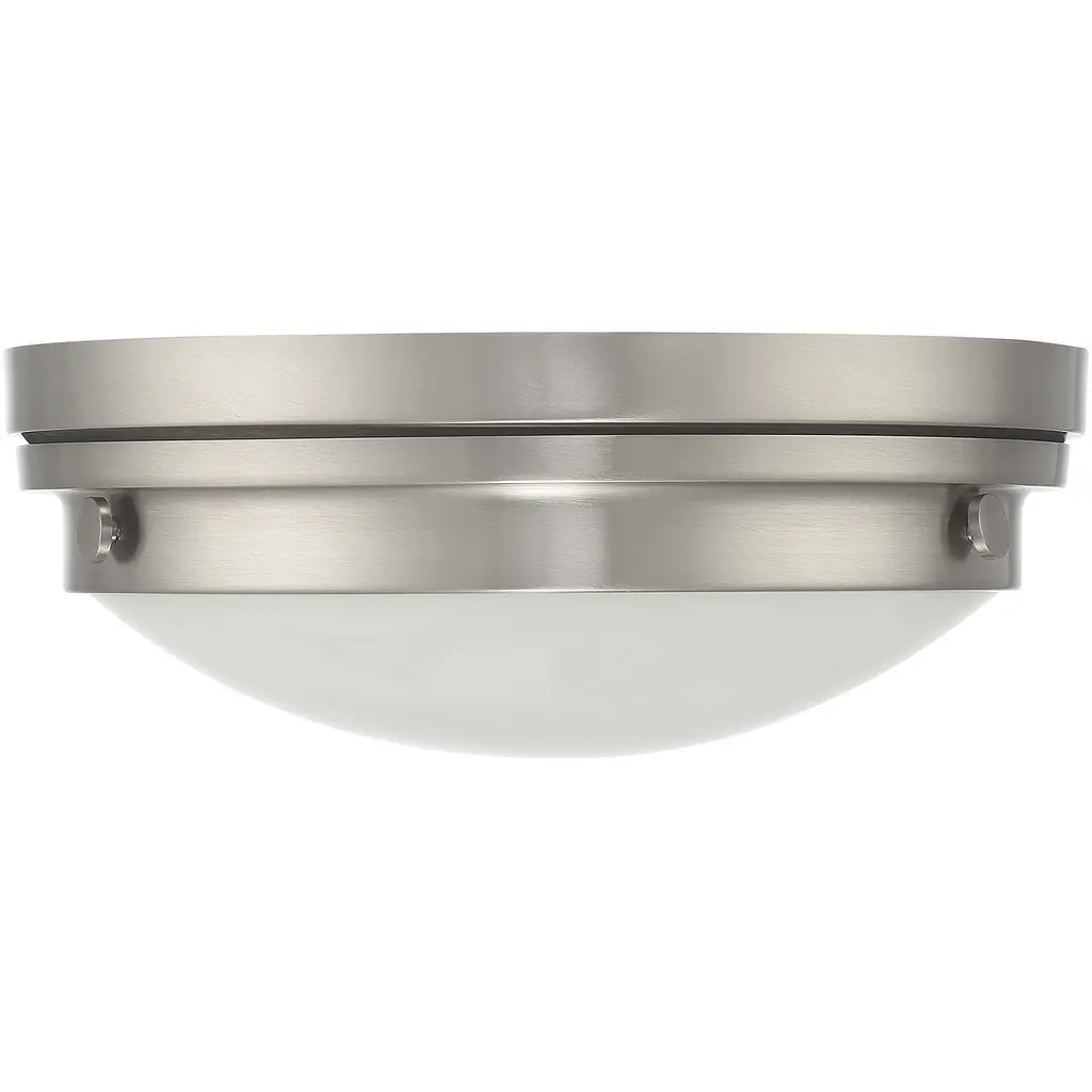 The Savoy House Lucerne 2-light ceiling flush mount is sure to bring sleek metallic style to any space A white glass shade makes Lucerne an ideal choice for comfortable, useful light. Finished in sleek satin nickel. Flush mounts can be used on the ceiling of pretty much any interior room, including foyers, hallways, stairways, closets, bathrooms, bedrooms, kitchens and more Bulbs not included. The satin nickel finish can be paired with nickel hardware or mixed with hardware in other finishes. Pep up the light and style of any room with Lucerne. When you choose a Savoy House lighting fixture, you can be certain you've selected a piece that will withstand the test of time.