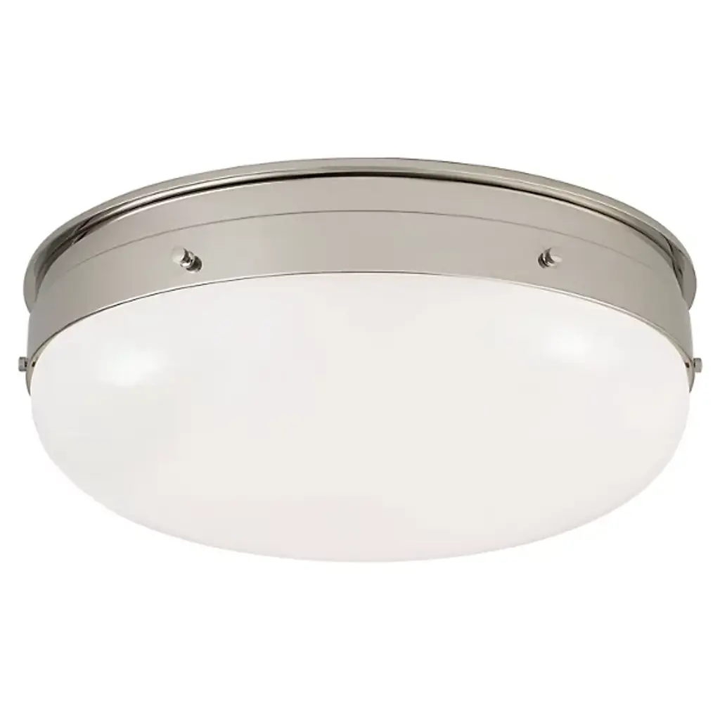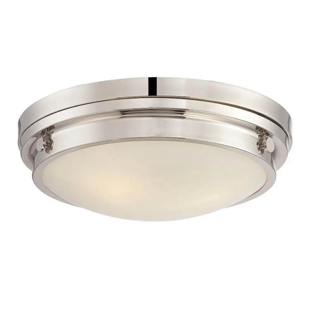 With its sleek, contemporary aesthetic, the Lucerne Flushmount by Savoy House blends beautifully in almost any living space. Its low-profile silhouette consists of a high quality metal frame (available in several different finishes) and a pronounced White glass shade. Once on, light permeates the shade and plays off the surrounding metal for a warm, shimmering ambiance.