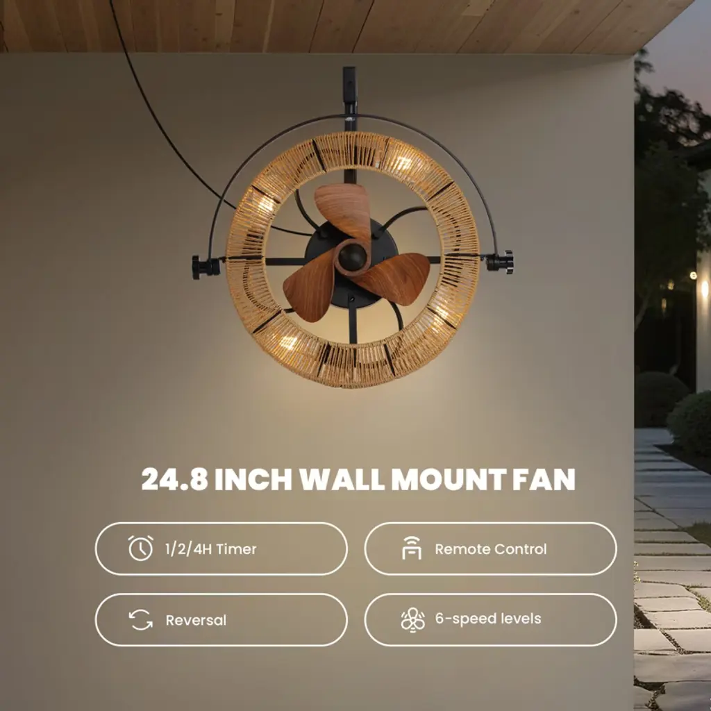 Ludomide 25 In. Boho Wall Mounted Ceiling Fan With Lights And Remote, Woven Caged Fan With Lights For Indoor Covered Outdoor
