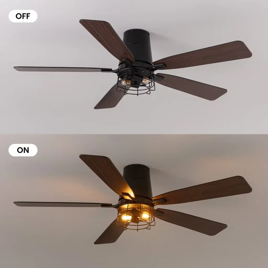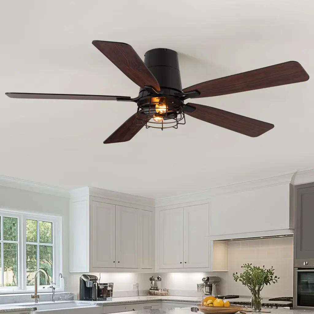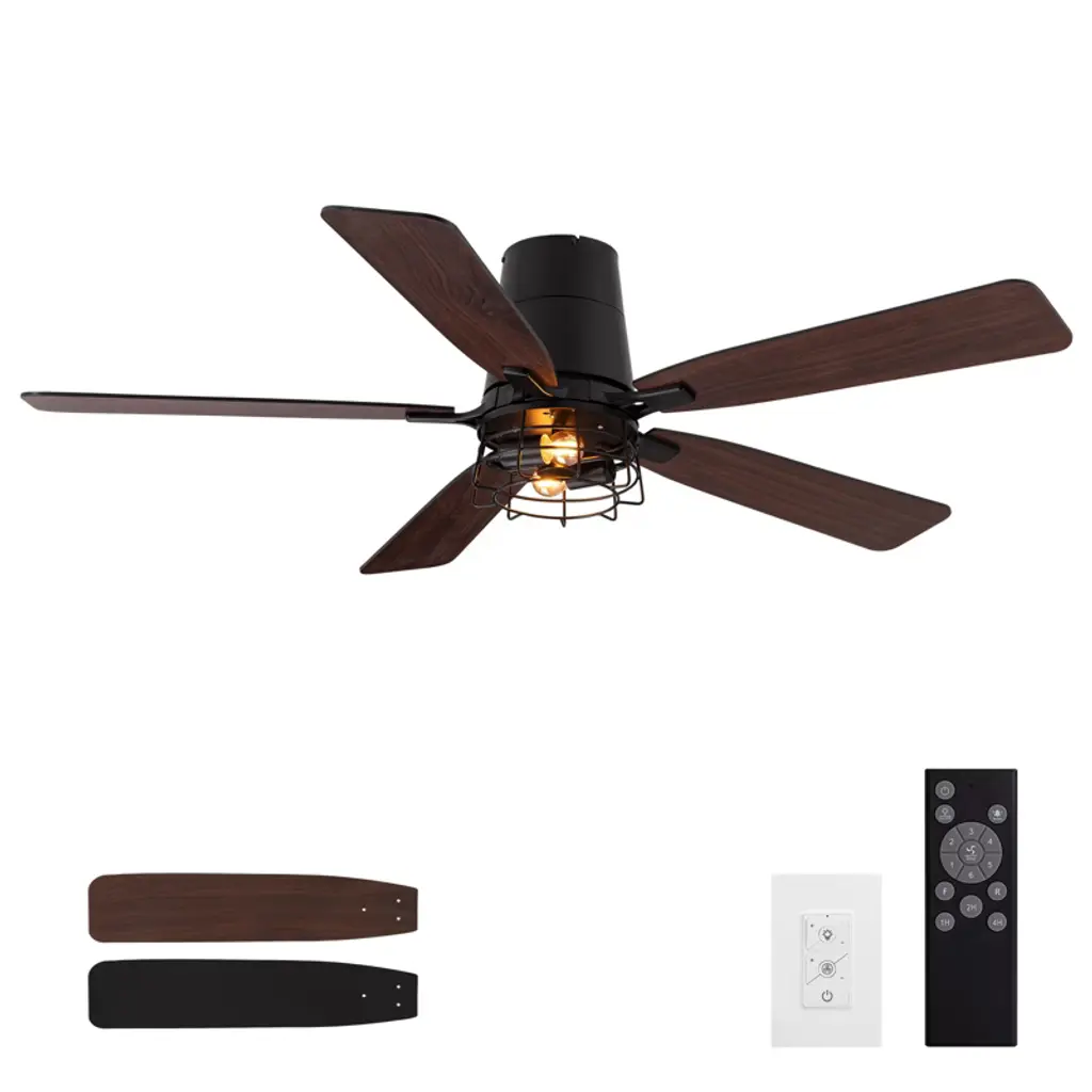 This 52-inch farmhouse-inspired ceiling fan combines rustic charm with modern style, featuring a dual-tone black and walnut finish and a stylish cage that suits any décor. Equipped with a remote control and wall switch, it offers 6 fan speeds, light control, and a 1/2/4-hour timer for added convenience, all powered by a quiet, efficient reversible DC motor. The fan includes two E26 bulb sockets compatible with incandescent, CFL, and LED bulbs, with a metal cage that enhances aesthetics and protects the bulbs. Its flush mount design ensures easy installation and fits seamlessly in rooms with low ceilings. Ideal for kitchens, living rooms, bedrooms, dining areas, and porches, its versatile style complements both rustic and modern interiors.