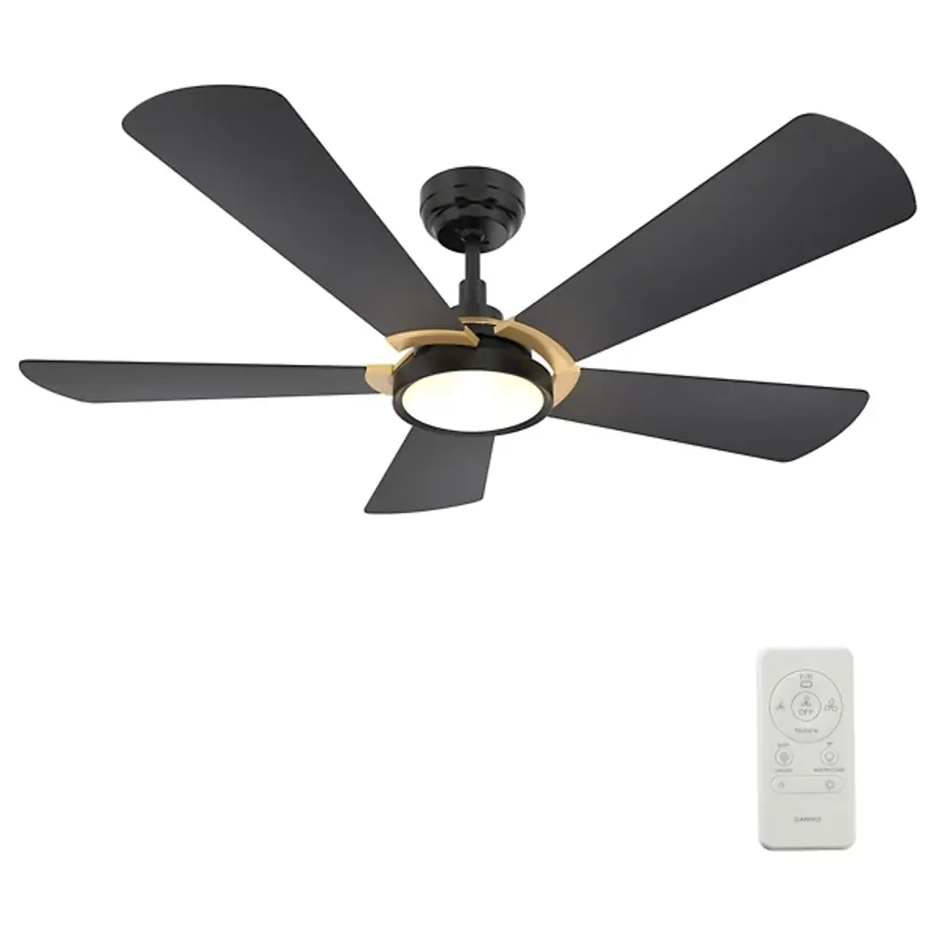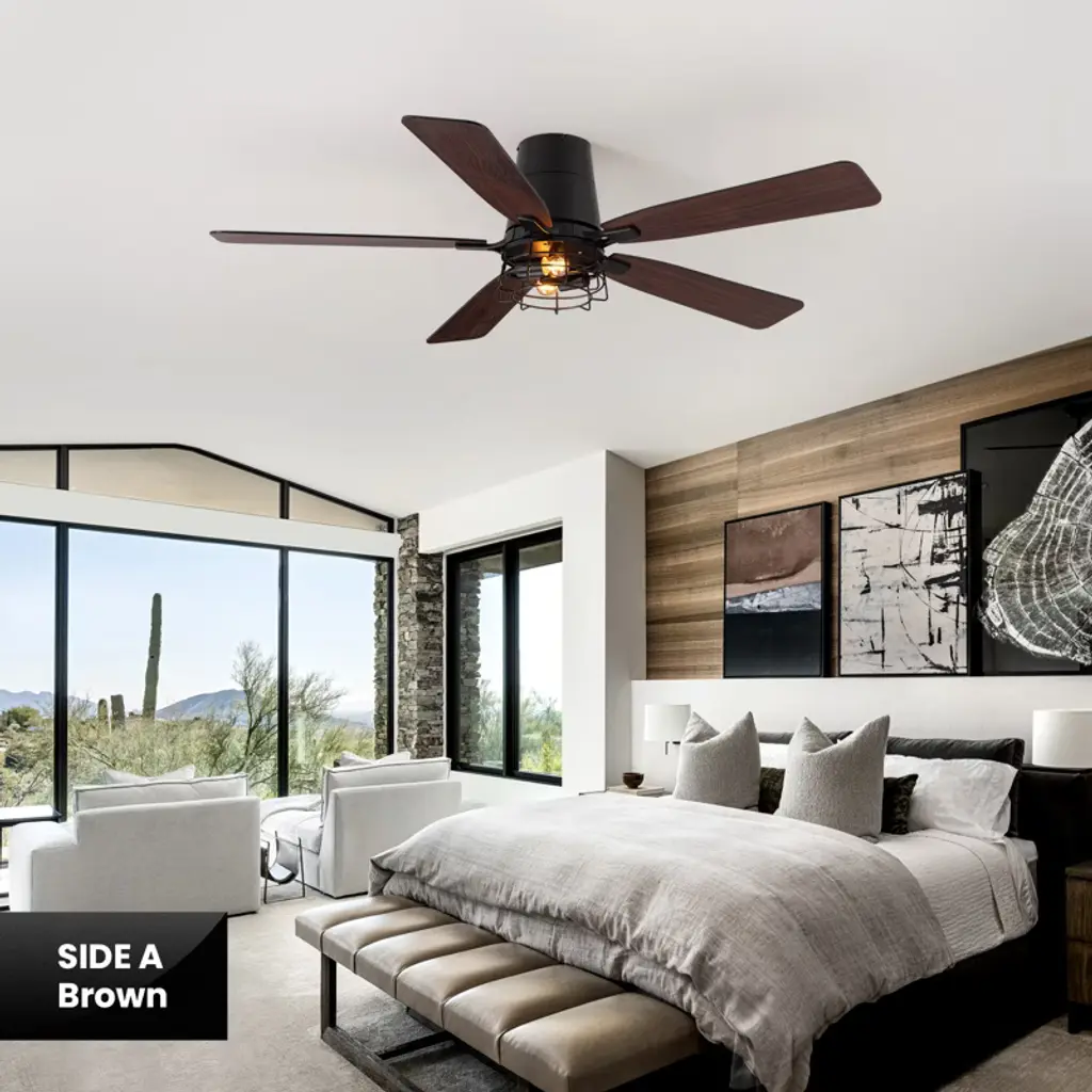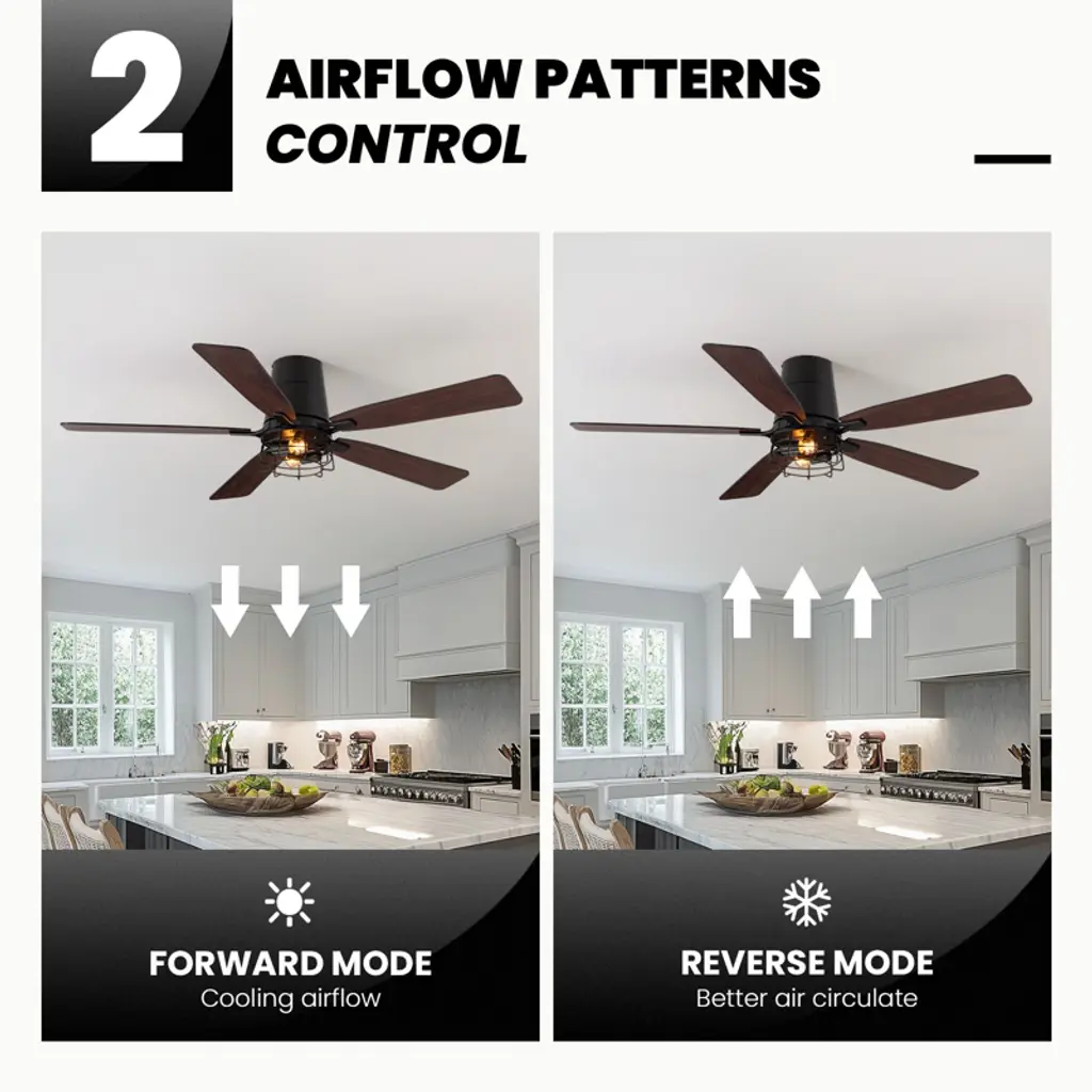 This 52-inch farmhouse-inspired ceiling fan combines rustic charm with modern style, featuring a dual-tone black and walnut finish and a stylish cage that suits any décor. Equipped with a remote control and wall switch, it offers 6 fan speeds, light control, and a 1/2/4-hour timer for added convenience, all powered by a quiet, efficient reversible DC motor. The fan includes two E26 bulb sockets compatible with incandescent, CFL, and LED bulbs, with a metal cage that enhances aesthetics and protects the bulbs. Its flush mount design ensures easy installation and fits seamlessly in rooms with low ceilings. Ideal for kitchens, living rooms, bedrooms, dining areas, and porches, its versatile style complements both rustic and modern interiors.