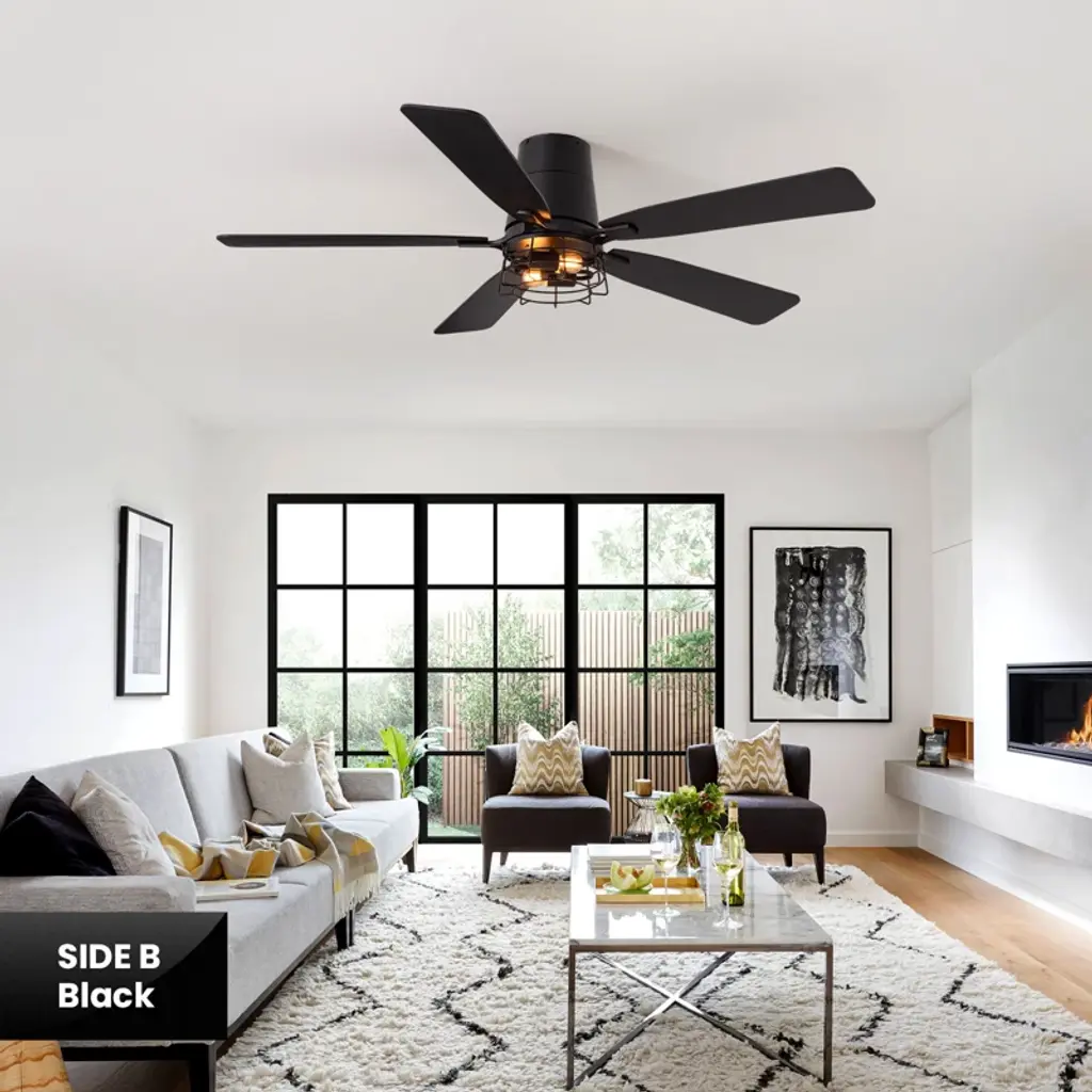 Ludomide 52 Inch Black Low Profile Ceiling Fan With Light, Modern Flush Mount Small Caged Ceiling Fan With Remote And Wall Switch