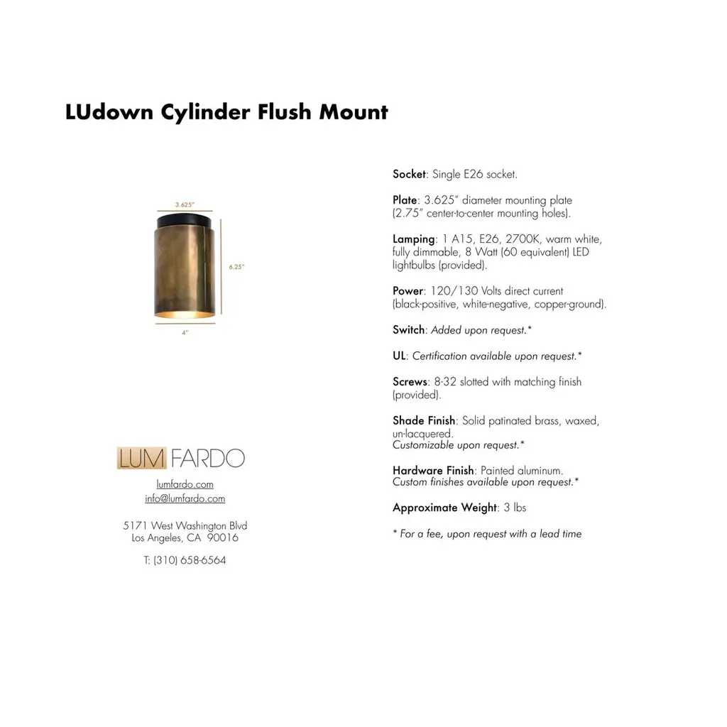 The LUdown cylinder flush mount AS fixture by Lumfardo Luminaires is part of our contemporary collection. Available in aged silver and steel with (1) E26 medium based socket. Light bulb included with order.Measurements:Fixture height: 6.25”Diameter: 4”.