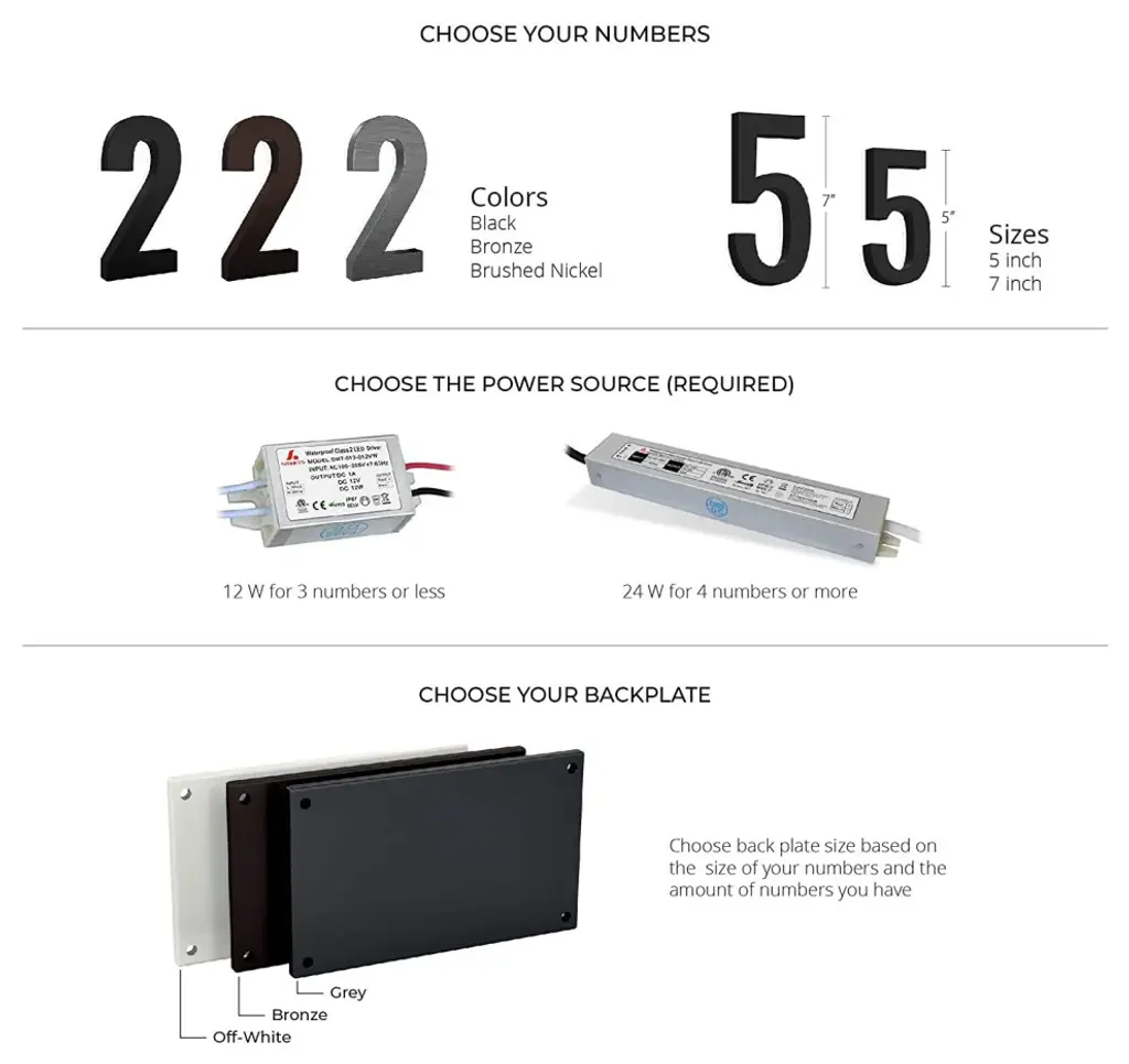 Brighten your house exterior with our modern 10-inch Backlit LED Address Numbers. Make it easy for guests, delivery personnel or emergency services to find your home at any time of the day. Our clean, contemporary house numbers are specifically designed with LED backlighting to make your address clearly visible at night.Each 10-inch address number is made from heavy-duty metal and beautifully handcrafted with a high-quality finish for a sleek, modern look that provides instant curb appeal. Our long-lasting numbers are extremely durable and weather resistant.Elegant backlit numbers are ideal for both residential (homes) and commercial (office buildings, store fronts, etc.) use. Product Details:3D LED Backlit House Numbers gives off a floating appearanceLight is emitted from behind the numbers, softening the outputAdjust brightness with �" and �" spacers included with each number, or mount flush to further reduce lightAll numbers come protected with a 2-year warrantyAvailable in three finishes: Black, Bronze, Brushed NickelProduct Specifications:Height: 10"Material: MetalLED Color: 6000KPower Supply: 12V DC Driver (not included) Mounting Hardware and Installation instructions includedPlease Note: Due to the nature of metal and the hand-finish we provide, unique variations will occur.Note: An LED driver may be required to supply power to our address numbers.