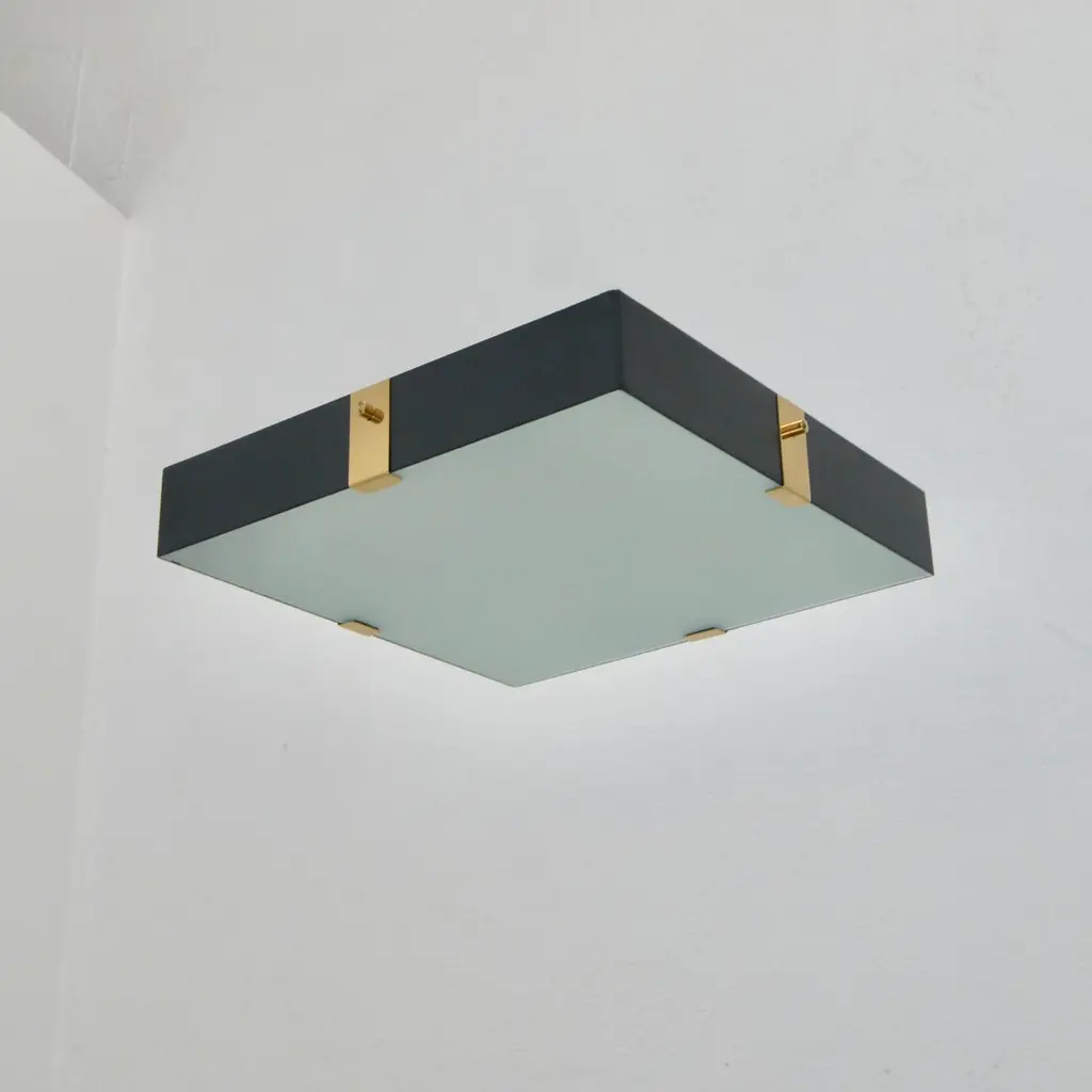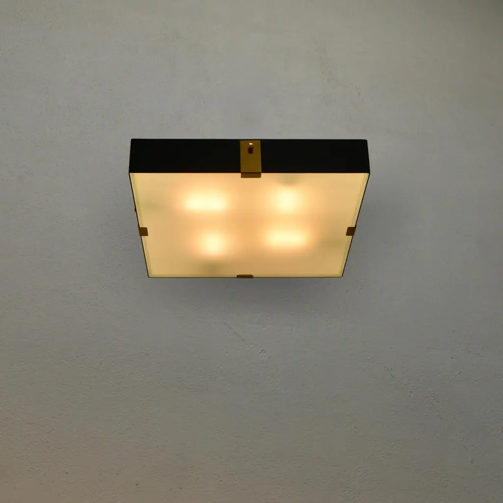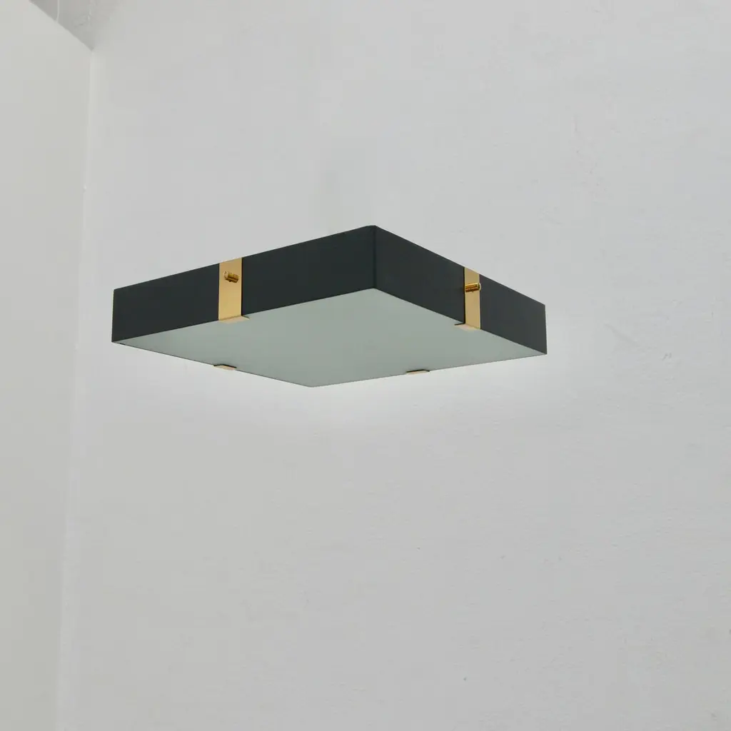 Part of Lumfardo Luminaires contemporary collection, the LUsquare flush mount fixture is made to order. Multiples available. The fixture is made from painted steel, brass and glass. The light is wired with four E26 medium based sockets and can be wired for use anywhere in the world. Light bulbs included with order. Measurements:Diameter 15” x 15”Fixture height 2.5”.
