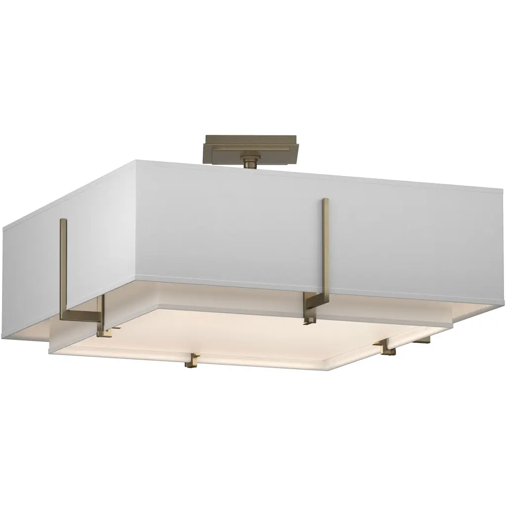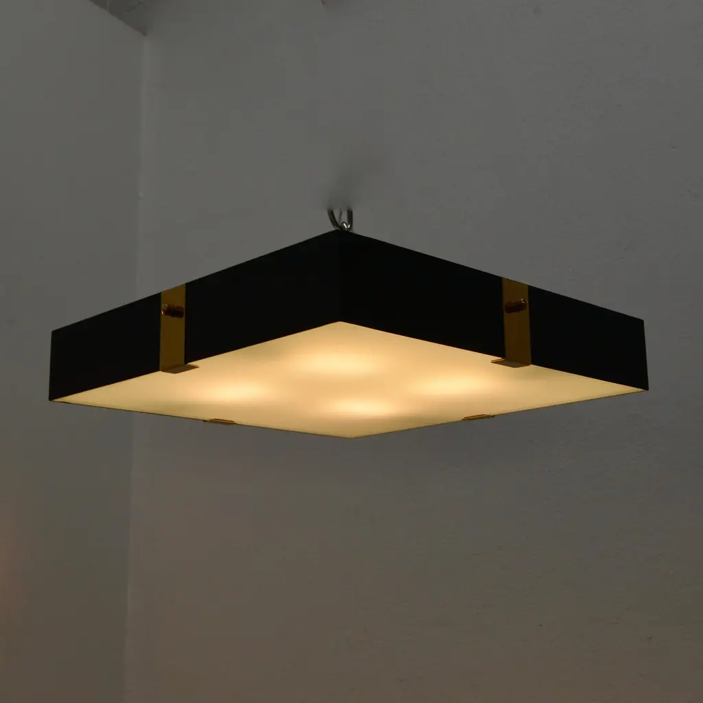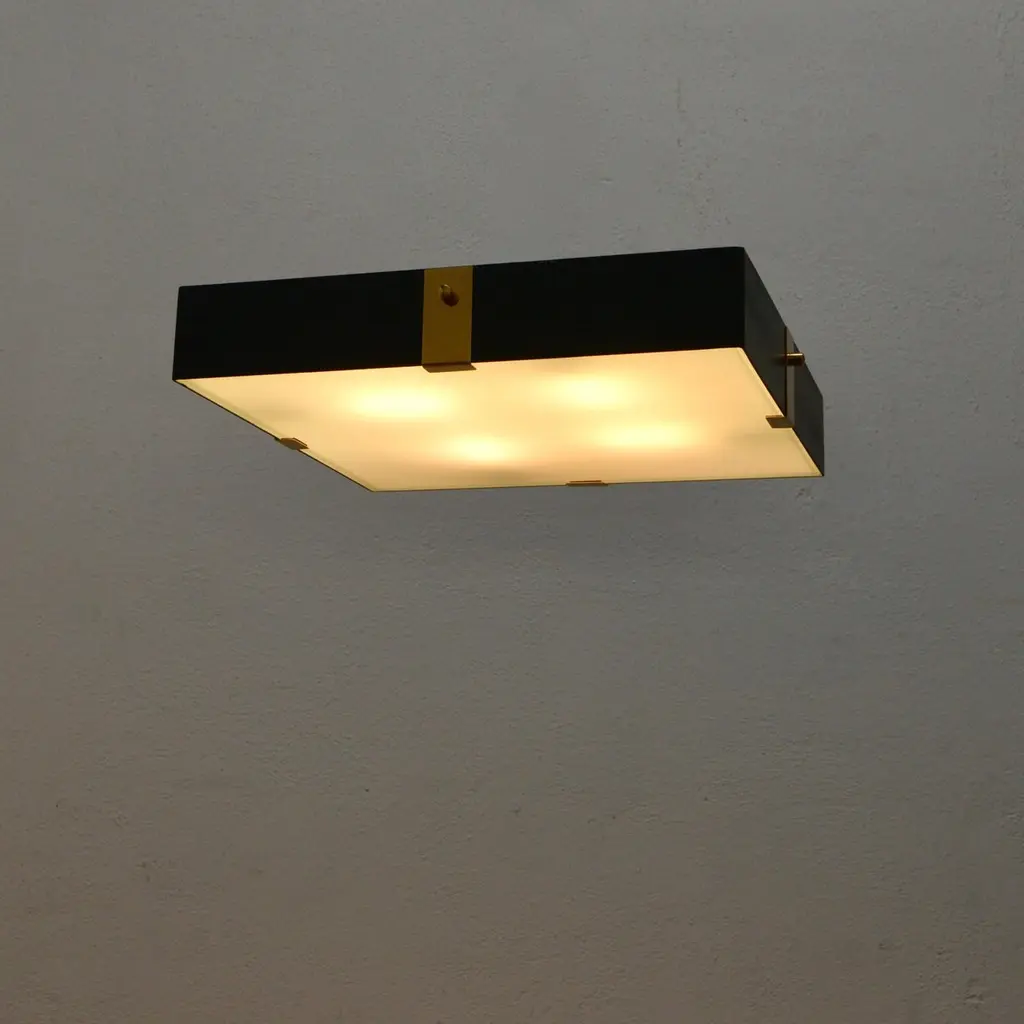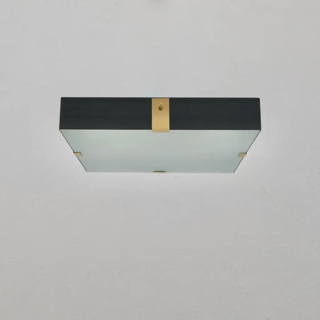Part of Lumfardo Luminaires contemporary collection, the LUsquare flush mount fixture is made to order. Multiples available. The fixture is made from painted steel, brass and glass. The light is wired with four E26 medium based sockets and can be wired for use anywhere in the world. Light bulbs included with order. Measurements:Diameter 15” x 15”Fixture height 2.5”.