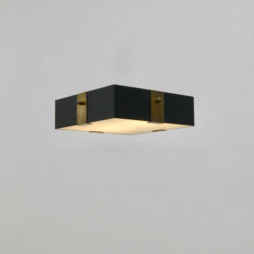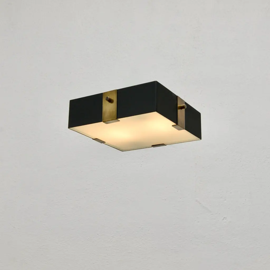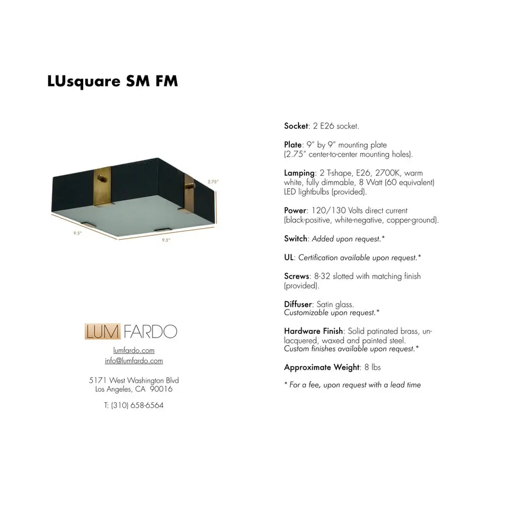 Part of Lumfardo Luminaries contemporary collection, the LUsquare SM FM is a small flush mount fixture in a Classic mid century modern design made to order. Crafted from steel, brass and glass, this fixture can be wired for any worldwide standard. Wired with 2 E26 medium based socket. Multiples available to order. Lightbulbs included with order. Lead times may vary from 4-14 weeks.Measurements:Length: 9.5” Height: 2.75”Width: 9.5”.
