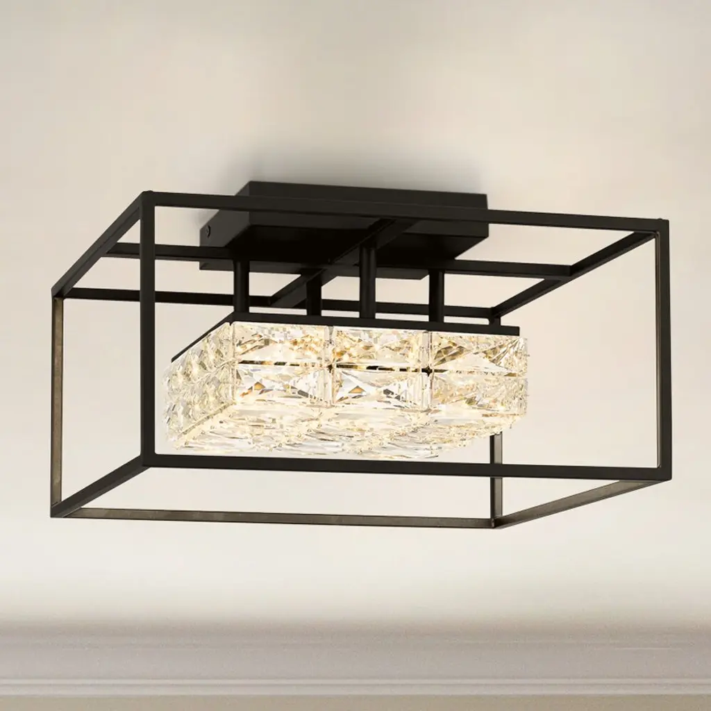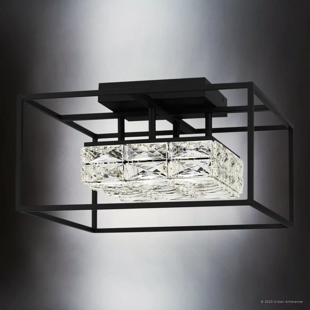 THE MENDEN COLLECTION:The Menden collection of light fixtures comes in a dazzling geometric design, featuring a rectangular or square outer frame with clean lines, encapsulating a smaller, interior cube-like or elongated cuboid structure densely filled with clear, crystalline elements. These crystal elements refract light to create a sparkling effect, much like faceted diamonds, while the open frame enhances the clean, modern lines that accent the arrangement of clear bevel-cut crystal glass. The Menden collection is constructed with a metal frame, either finished in a soft gold color to exude a contemporary and luxurious appearance or in matte black, which contrasts with the bright, sparkling appearance of the inner crystals. The inner part is made of glass-like material designed to resemble crystals. Within the crystal-filled cube, there is an integrated light source, obscured by the crystal elements. This light source is diffused and refracted by the crystals, creating a dispersed light effect that catches the eye. The Menden pendants and chandeliers suspend from the ceiling via one or two matching metal rods that connect to a rectangular ceiling canopy, which is consistent with the overall geometric design. The ceiling light, on the other hand, features a flush mount design, making it ideal for rooms with lower ceilings where a pendant or chandelier might not be suitable. These fixtures use integrated LED to deliver a harmonious blend of functionality and aesthetic appeal, making the Menden collection a perfect choice for those seeking a touch of elegance in their lighting fixtures. Available in a matte finish, either in soft gold or black, the Menden collection delivers a modern and minimalist aesthetic in variations of indoor chandeliers, pendant lights, and ceiling lights. PRODUCT INFORMATION:MODEL NUMBER: BWQ4684, UQL4684PRODUCT COLLECTION: MendenINSTALL LOCATION: IndoorFIXTURE TYPE: Ceiling LightFINISH: Matte BlackCONSTRUCTION MATERIAL: SteelABOUT THE DESIGN:DESIGN FEATURES: Candle Box,Unique GlassSHADE CHARACTERISTICS: Clear Crystal GlassFIXTURE FORM/SHAPES: Rectangular, SquareFINISH TONES: BlacksELECTRICAL AND INSTALLATION:FIXTURE BODY: 9.25''H x 15.75''W x 15.75''DHANGING HEIGHT: N/ACEILING OR WALL PLATE DIMS: 7.50"W X 7.50"LFIXTURE WEIGHT (IN LBS): 12.10 lbsLOCATION RATING: Dry LocationsSLOPED CEILING COMPATIBLE: N/AREVERSIBLE (UP/DOWN) OPTION: NoVOLTAGE: 110/120 VNUMBER OF BULBS: RECOMMENDED BULB SHAPE: Integrated LEDCOMPATIBILITY: LED and Dimmable BulbsSTYLE INFLUENCES:COSMOPOLITAN: A sophisticated and urban style that blends modern and traditional elements, often featuring chic, refined decor.MID CENTURY MODERN: Characterized by clean lines, organic forms, and minimal ornamentation, with a focus on functionality and simplicity from the mid-20th century.MINIMALIST: Emphasizes simplicity and functionality, with a focus on space, light, and form, often using monochromatic color schemes.MODERN: Focuses on simplicity and functionality with clean lines and minimal ornamentation. Geometric, oversized shapes break up otherwise airy spaces.