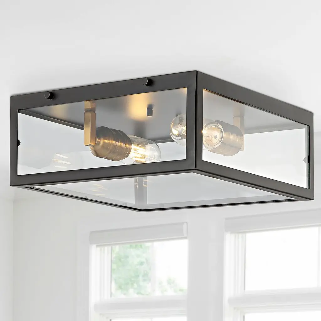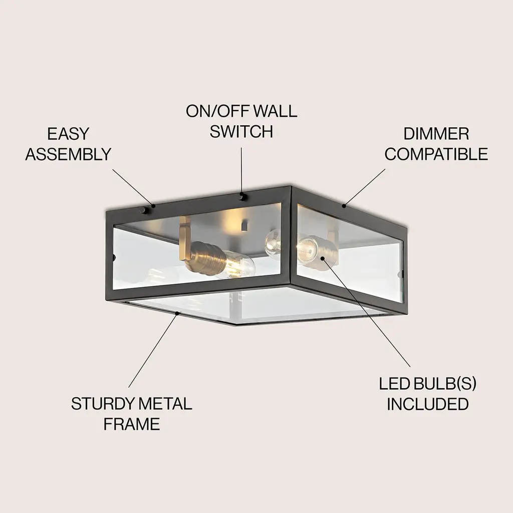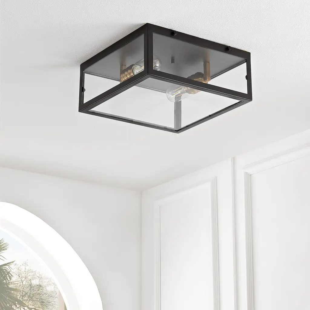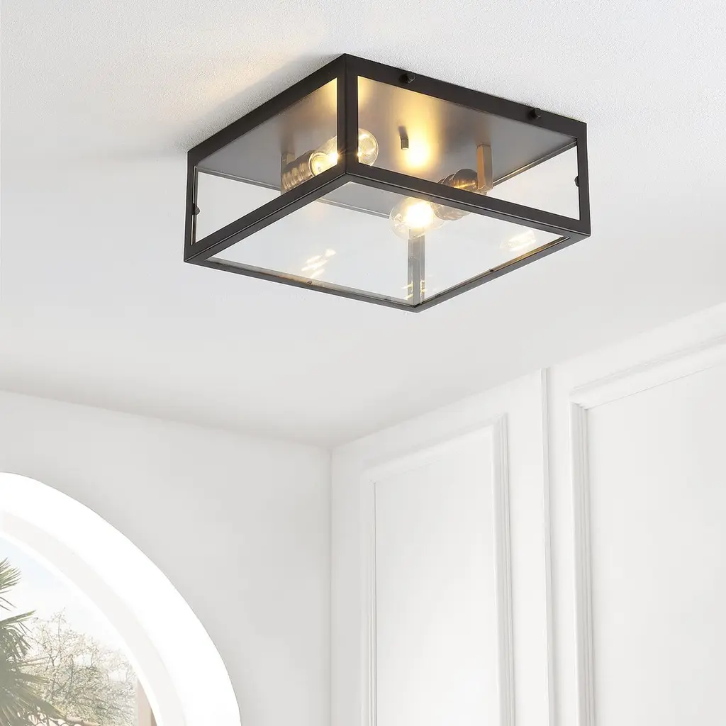 Our unique farmhouse flush mount lighting fixture is an industrial addition to any space. Its metal frame is inspired by minimalist and traditional decor. This fixture elevates hallways, living rooms and entryways alike.