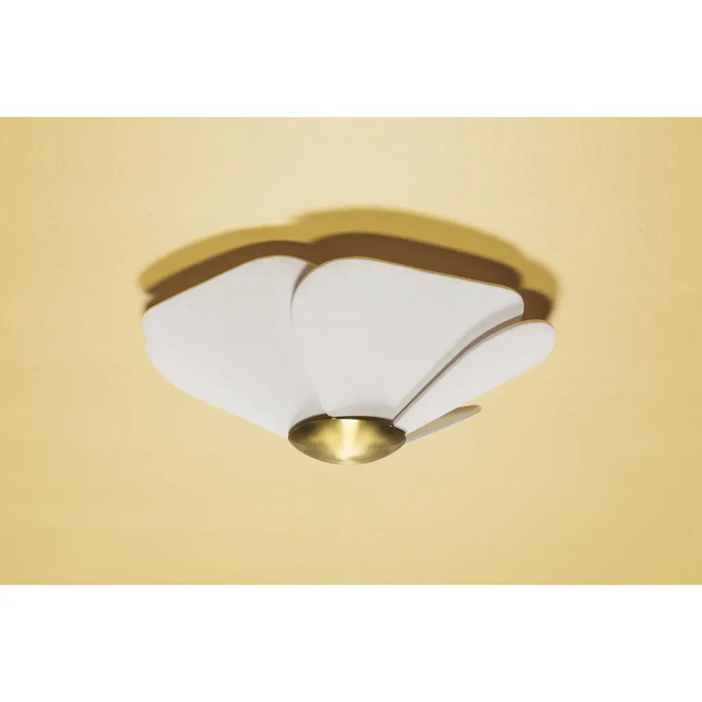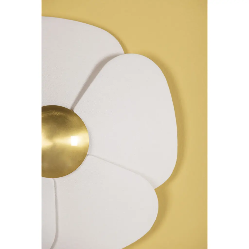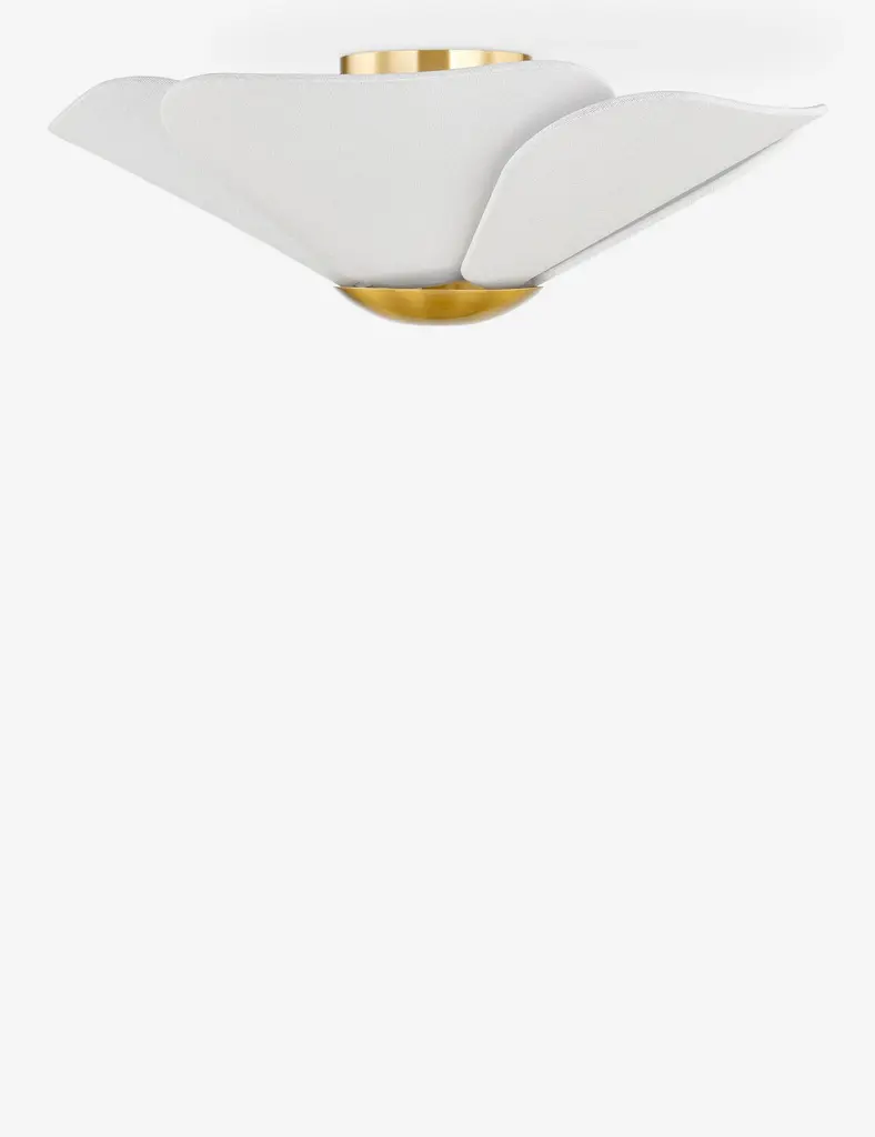 Flowing, petal-shaped, off-white linen shades and Aged Brass accents add a subtle natural style overhead that feels chic. The flush mount lights the shade from within, while light fills the metal bowl and shines upward to illuminate the pendant's linen shades from underneath. Part of our Home Ec. x Mitzi Tastemakers collection.