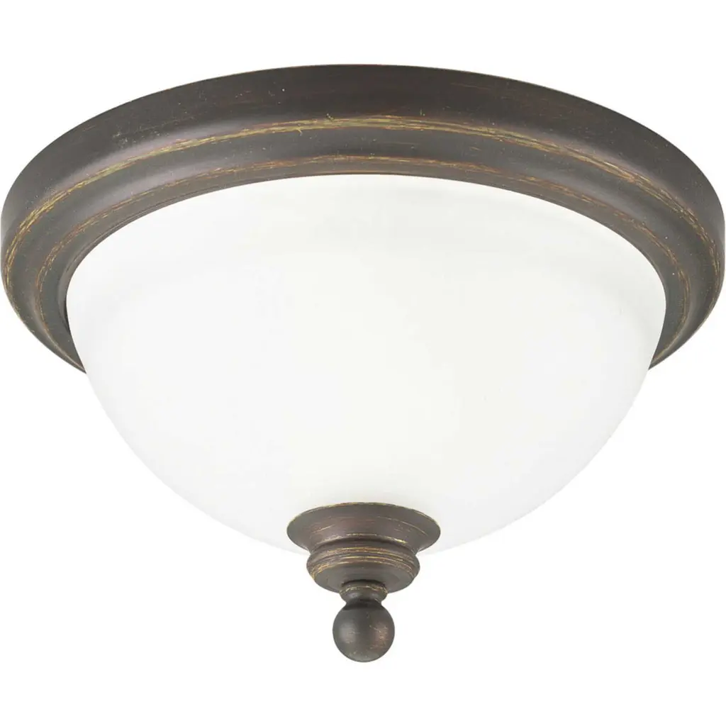 The Madison collection features etched glass with transitional elements. Simplified vintage style. One-light 12" close-to-ceiling fixture. Brushed Nickel finish.