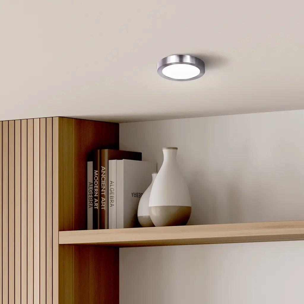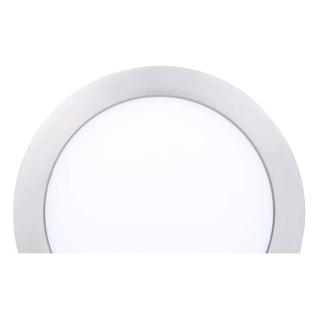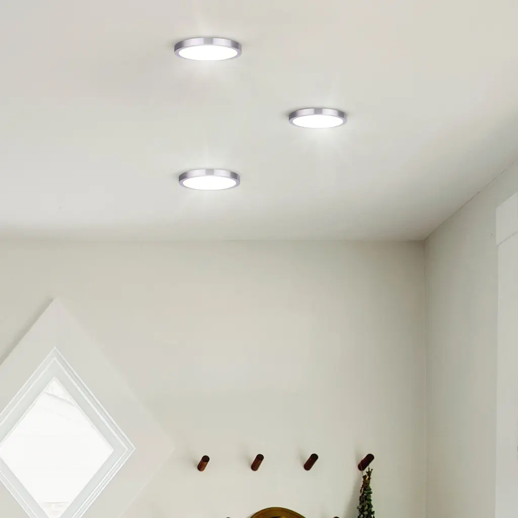 Add a touch of modern elegance to your space with the 5" LED Round Disk Light in brushed nickel. This versatile fixture is designed for both residential and commercial settings, offering a sleek and minimalistic look while providing efficient and customizable lighting. The 5CCT switch allows you to adjust the color temperature from a warm 2700K to a crisp 5000K, ensuring the perfect ambiance for any room. Despite its compact size, this fixture delivers up to 700 lumens with just 10W of power, making it an energy-efficient choice. With a high color rendering index (CRI) of 90+, this light ensures accurate color representation. The disk light is built to last with a 50,000-hour lifespan and features a slim profile of just 7/8, making it ideal for low ceilings or small spaces. Its easy installation process allows for wall or ceiling mounting, adding to its versatility.