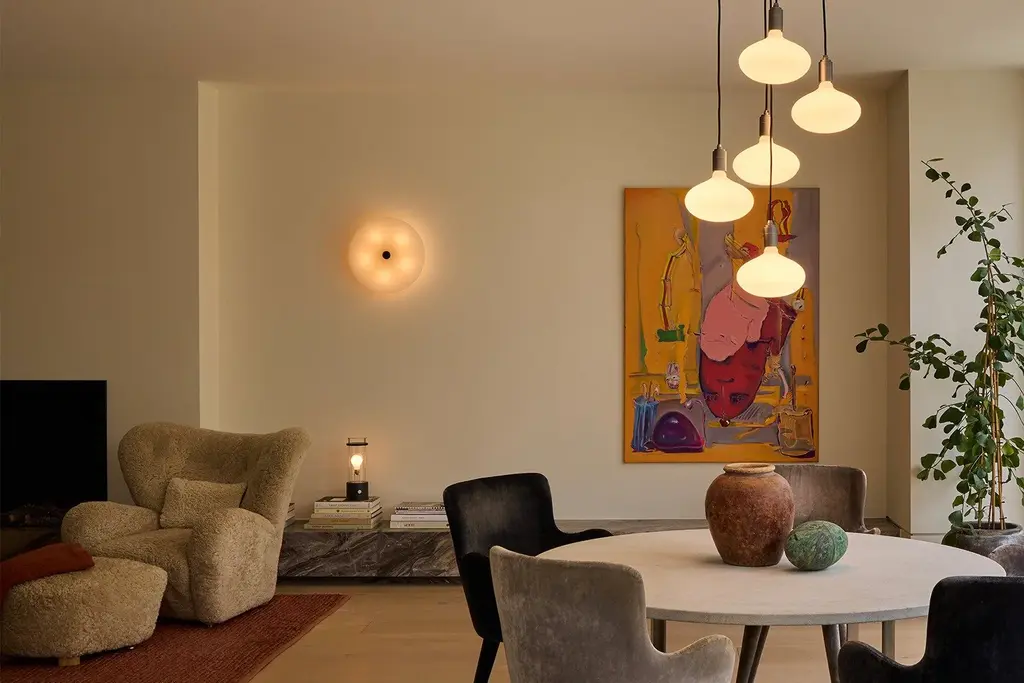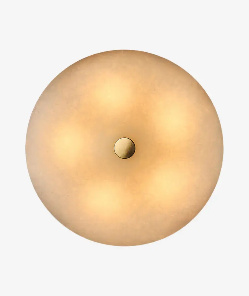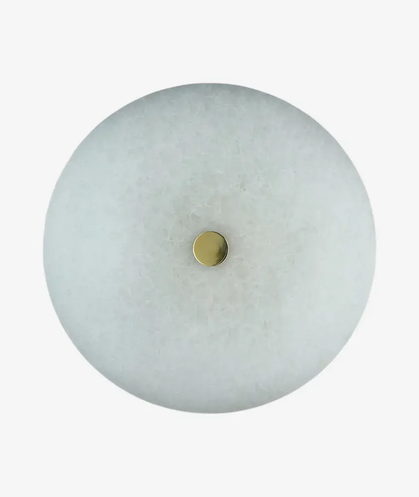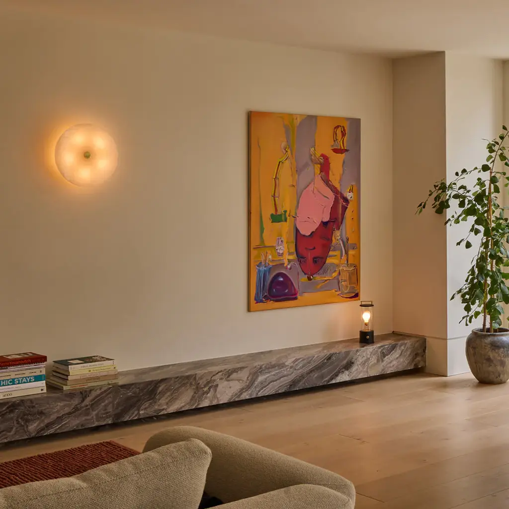 Magma is an innovative light series by Tala, noted for its decorative glass disc diffuser made from upcycled solar panels. Surface-mounted for an elegant and subtle profile, the Magma Flush Mount features a solid brass frame and five, matte white G70 bulbs. Shielded behind a 16.7in diameter glass disc, the diffused light creates a subtle ambiance in liminal spaces.