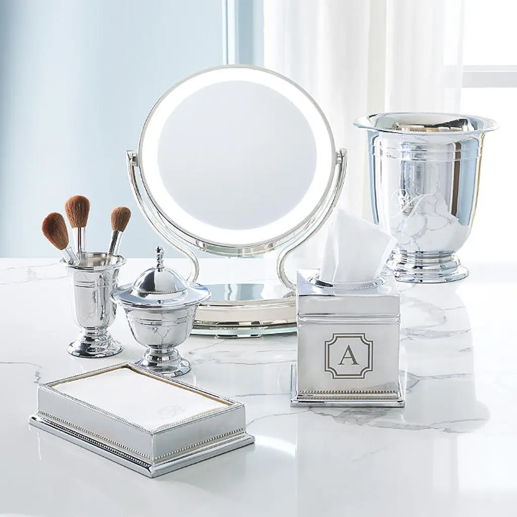 Inspired by a vintage mint julep cup that we thought was much too pretty for a once-a-year indulgence, our Maison Countertop Collection brings that elegance into the bath. Impeccably crafted of solid brass with intricate beading and classic banding. Thick-gauge solid brass construction with intricate detailing Resistant to rust and corrosion Monogram available on Soap Dispenser, Tissue Cover and Wastebasket Slightly higher profile that complements luxury faucets In Chrome, Brushed Nickel and Brushed Brass Clean with a soft, damp cloth For best results, periodically flush Soap Dispenser pump with water Imported. Please note: Personalized items are non-returnable. At Frontgate, our primary focus is quality. We guarantee that every product we sell will stand up to the supreme test – our customers' satisfaction. To learn more about our policies, visit our Shipping & Processing, Returns & Exchanges and Warranty & Price Guarantee pages.