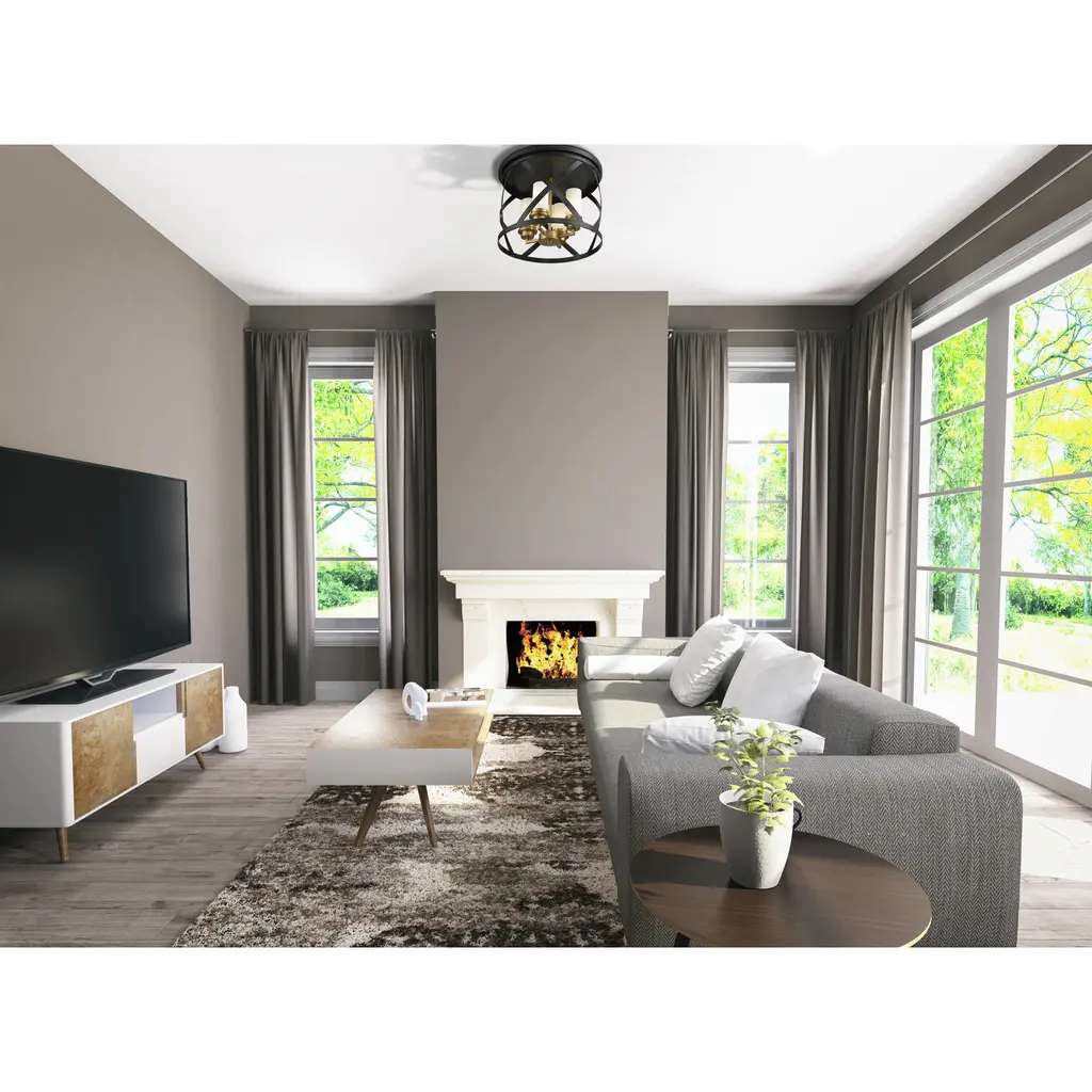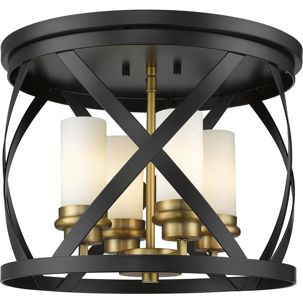 Enhance your home lighting with the eclectic charm of this two-tone four-light flush mount light. It features a combination matte black and olde brass finish in a stylish round design highlighted by an X-cross pattern. You and yours will enjoy the immediate upgrade in ambiance this light brings to any hallway, bedroom, dining room, or living room.