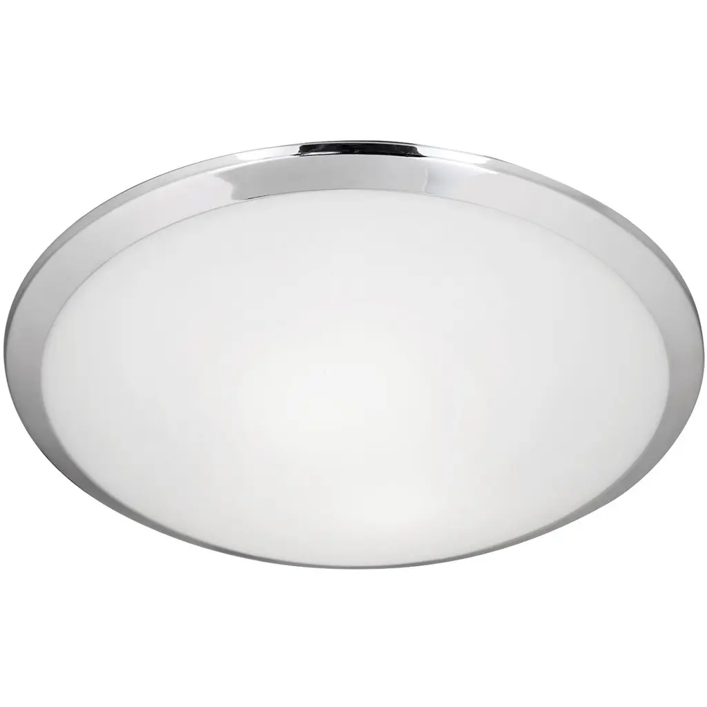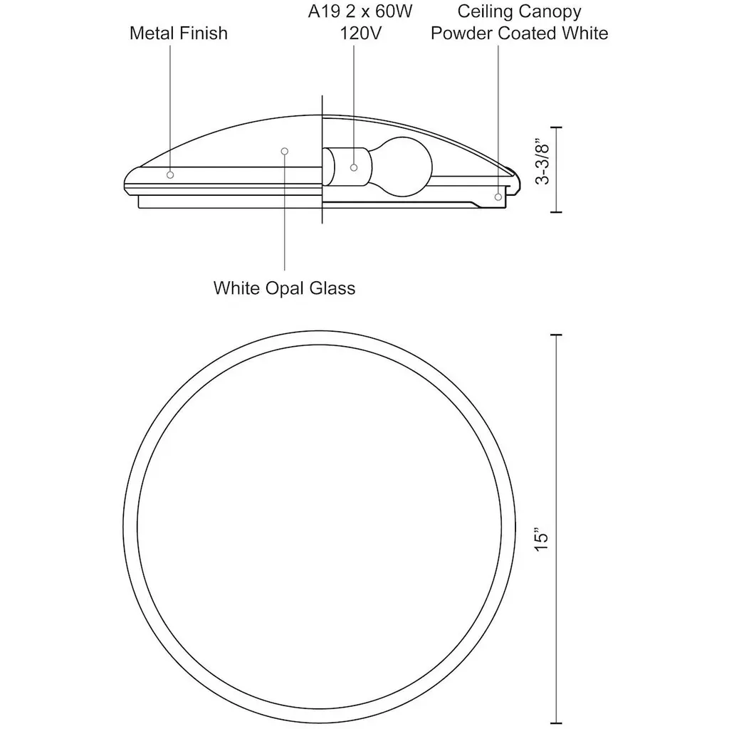 Two lamp flush mount ceiling fixture with white opal glass and your choice of brushed nickel or chrome metal finish.