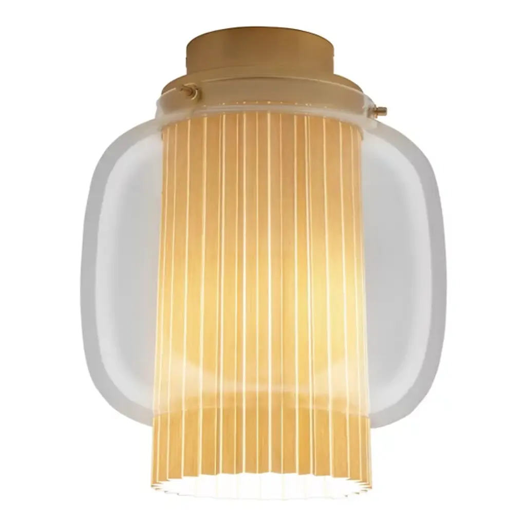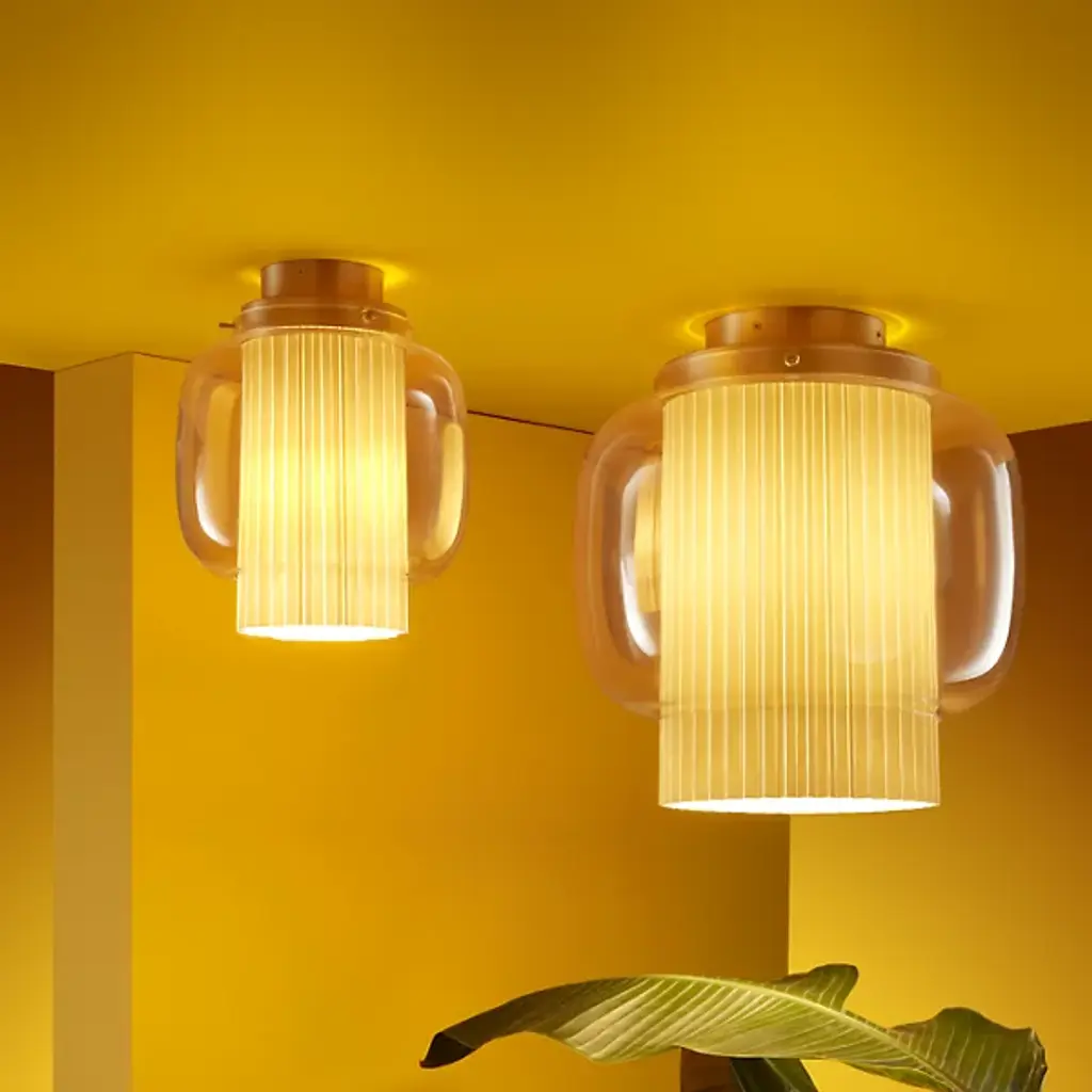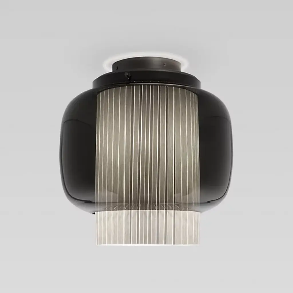 The Manila C Flushmount from Parachilna transforms its environment with a welcoming artisanal touch. An elegant blend of artisanal blown glass with a plissé-textured diffuser, its two-tone design descends from a stepped circular ceiling mount. Designed by Sebastian Herkner, it takes its name from the Spanish "Mantón de Manila," a silk shawl utilized by flamenco dancers. The fixture has a sense of motion, even when standing still, evoking the twirls and swirls of motion.