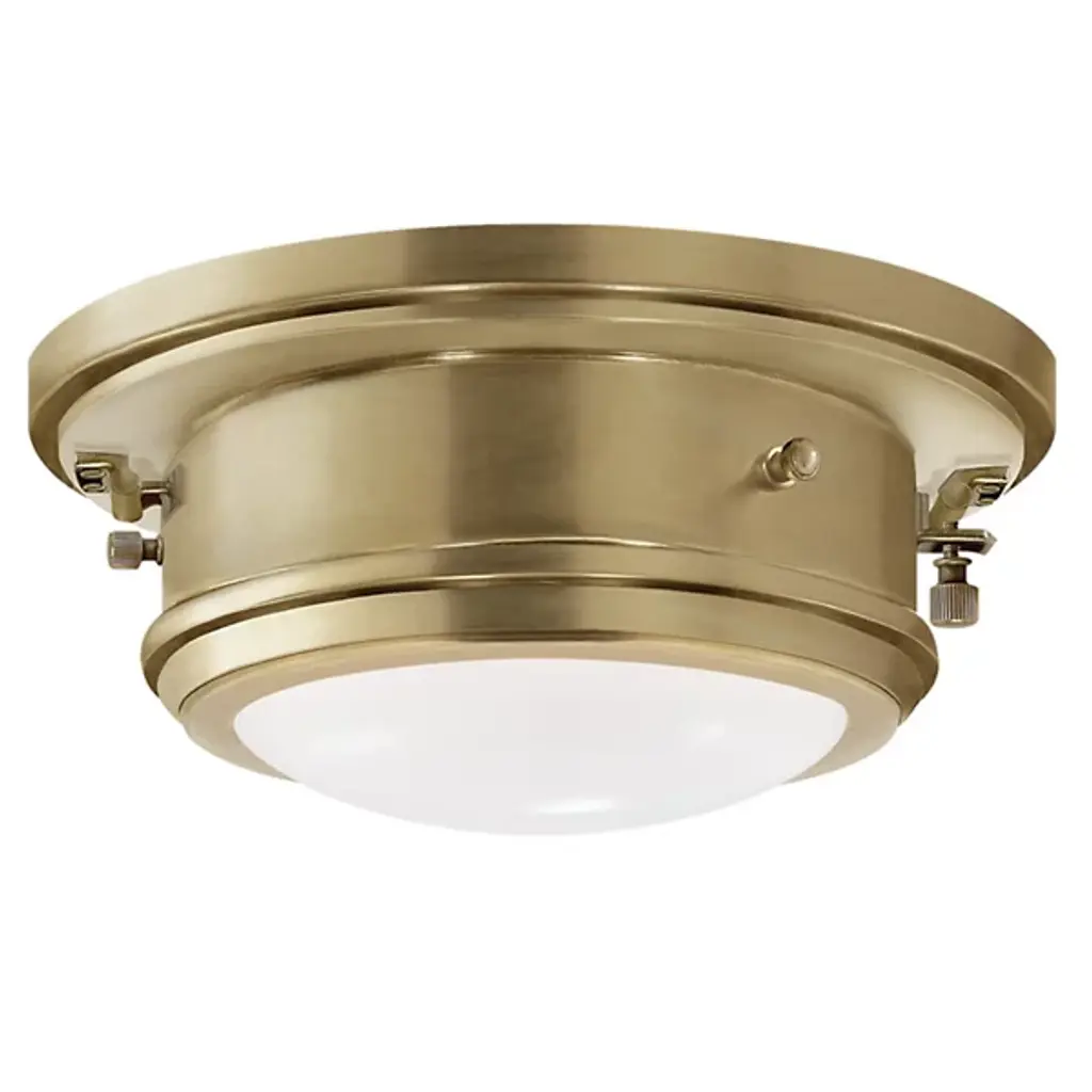 Bring a soothing and even layer of light to your modern home with the Marine Port Flushmount from Visual Comfort Signature, formerly known as Visual Comfort, Small in stature and familiar in form, this piece adds a soft and enchanting glow that elevates the guides the way and shapes the ambiance. A rounded frame made of smooth metal gracefully extends from the ceiling, ending with a frosted glass shade that lowers further, giving ample room to the pair of bulbs within. The bright glow from the bulbs fills the shade and diffuses out into a welcoming, tasteful layer.