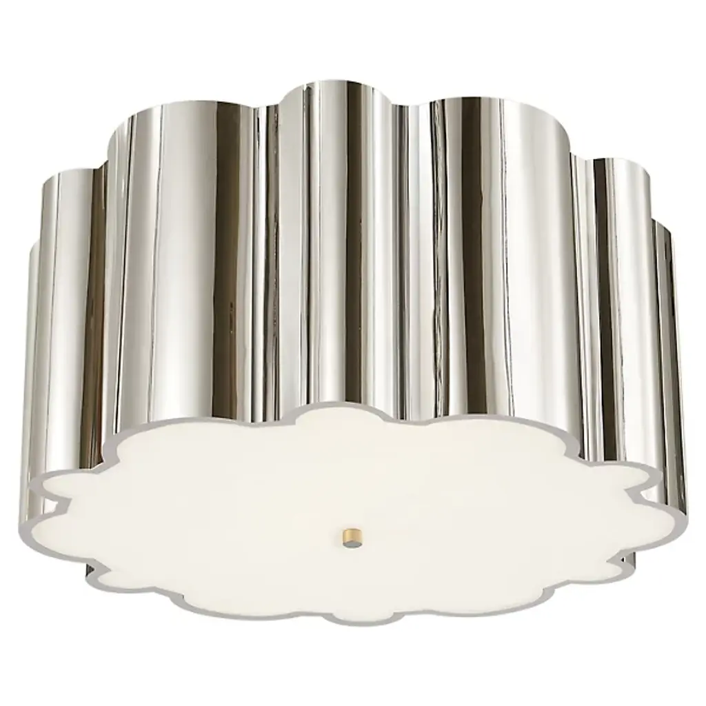 Give your living space a decorative flourish with the Markos Flushmount by Visual Comfort Signature, formerly known as Visual Comfort, Its design features a sleek metal frame that flows in curved peaks and valleys around a Frosted Acrylic shade (with subtle finial accent). Though seemingly distinct, these materials blend well in the warm light provided by internal sources, creating a warm, soothing ambiance with a hint of luxurious shimmer.