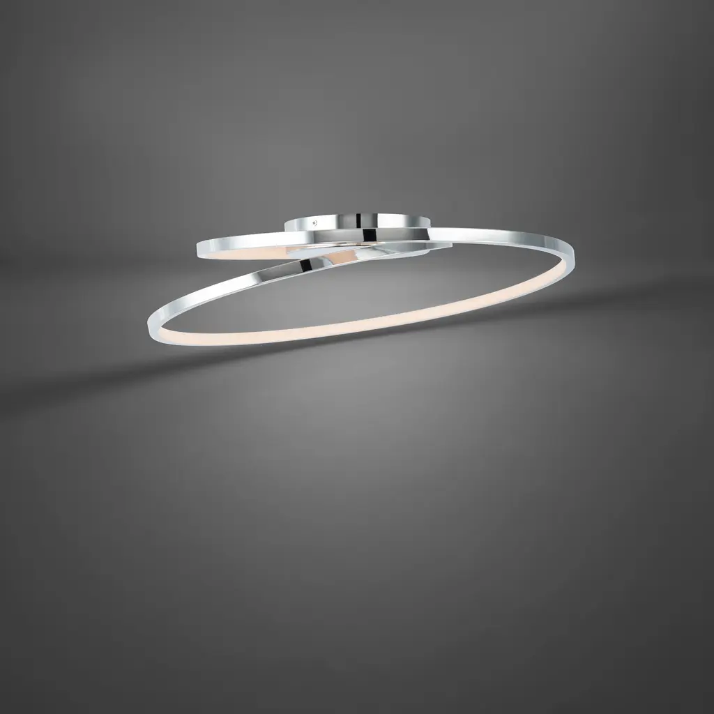 Modern halos of light complement in tandem, juxtaposed in positions evoking celestial movement. The 22-inch LED flush mount is available in three stunning architectural finishes of brushed nickel, black, and chrome. The LED luminaire conceals a 120 volt driver and may be mounted on either the ceiling or wall. The light is dimmed with an electronic low voltage or TRIAC dimmer. High quality LEDS offer a soft white 3000K color temperature at a high 90 color rendering index and a long 50,000 hour life. This LED luminaire uses just 41 watts and delivers over 1100 lumens. The MARQUES indoor flush mount, a modern halo of light.