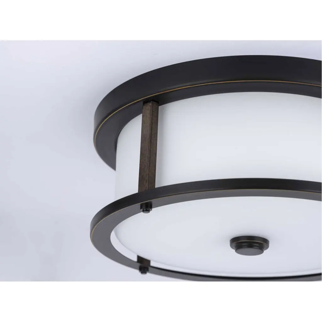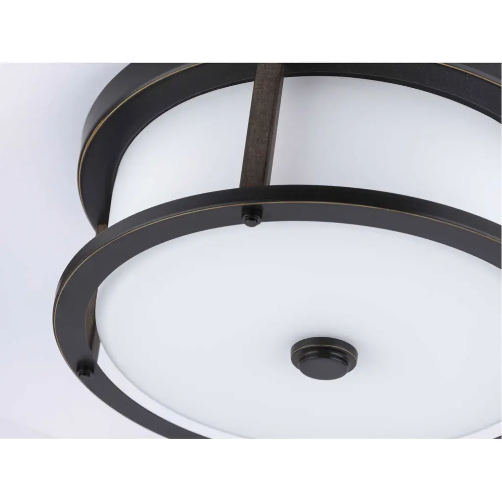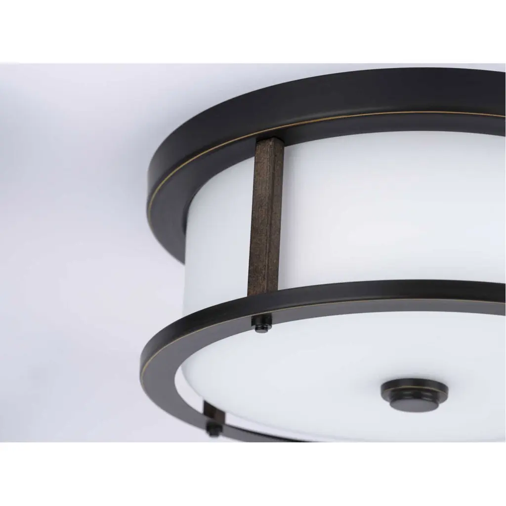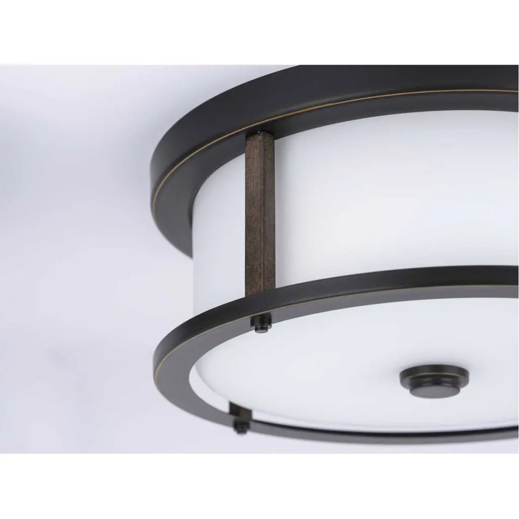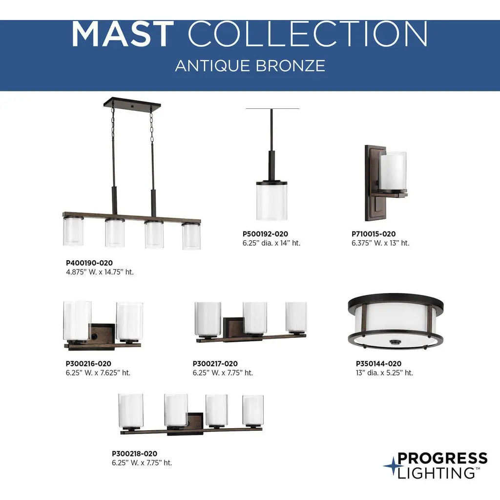 Create a haven for relaxation under the soothing glow of the Mast two-light flush mount. A fitting piece for providing overhead lighting in a bathroom, living room, or bedroom in any coastal or modern farmhouse interior. A circular, Antique Bronze frame accented by faux wood secures an etched glass shade ready to offer a soft, gentle glow.