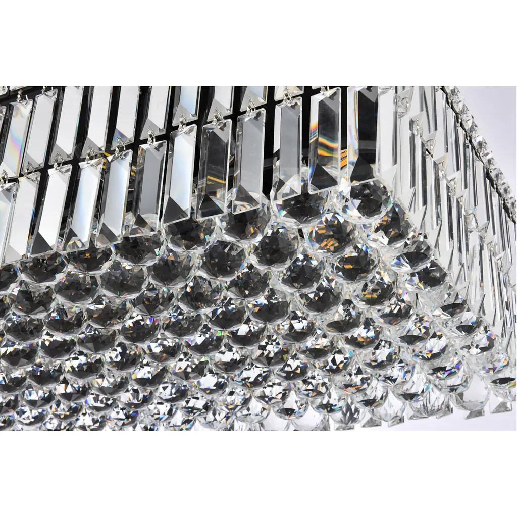 A riot of shapes and textures, Maxime collection flush mounts sparkle in a mosaic of crystal tiles. Square and rectangular precision-cut crystals form the flamboyant exterior while faceted crystal balls create a bubbled effect for light to shine through beneath. Available in a black or chrome finish with clear crystals, these lamps are a luxurious addition to a kitchen, stairwell, foyer, or living room.