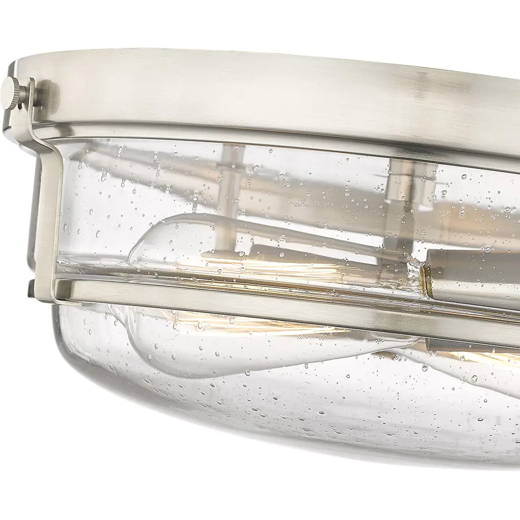 Utilitarian, flushmount lighting is taken to the next level with the Mayson Collection. Industrial-style design elements are elevated with brushed nickel or matte black finishes and enhanced with clear, seedy glass for a vintage look.