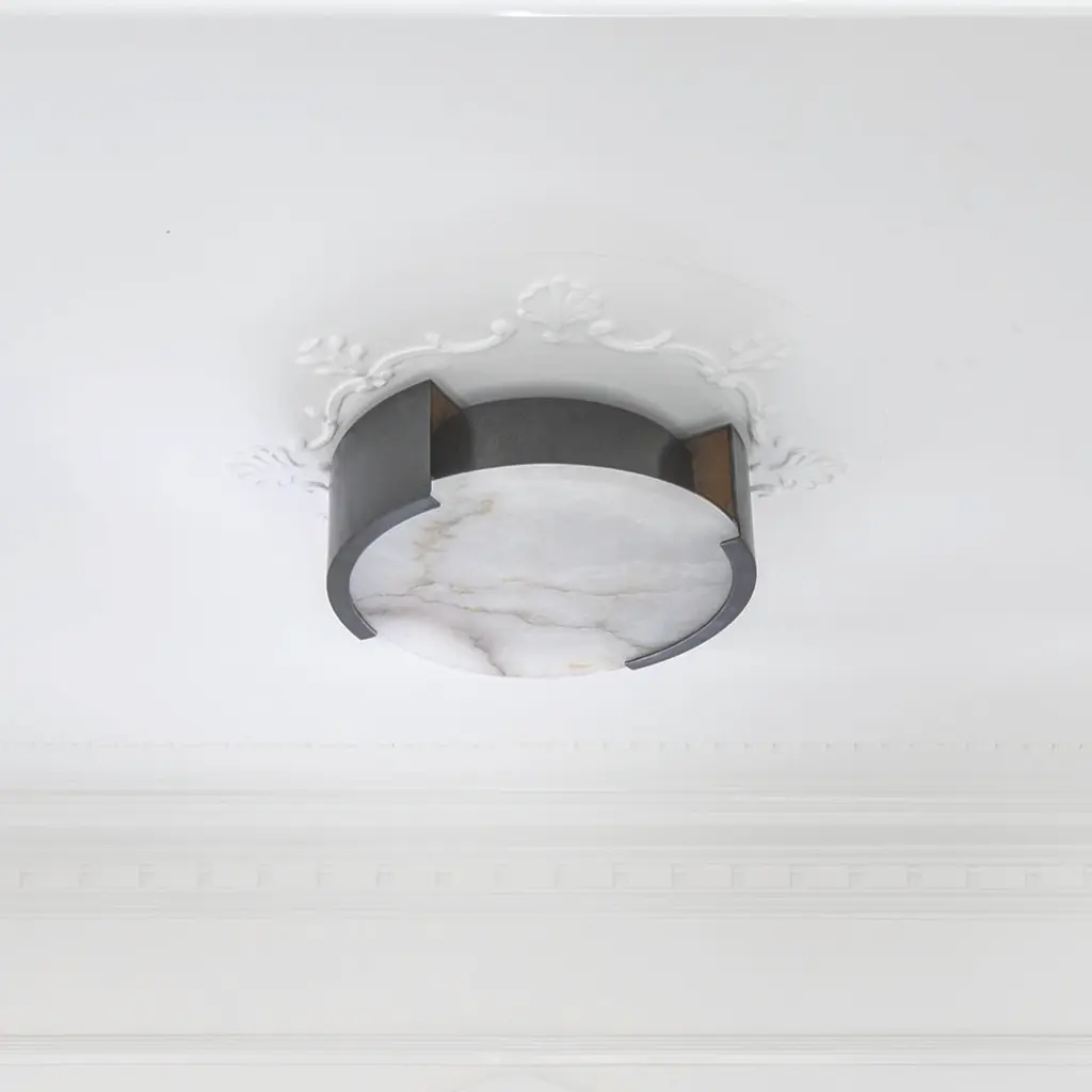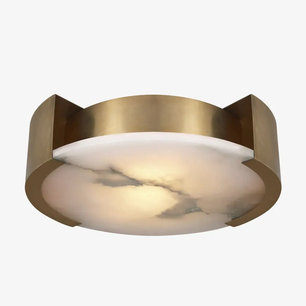 Effortlessly pairing natural alabaster and sleek metal detailing in a streamlined geometric form, the Melange Large Flush Mount exudes a modern refinement while emphasizing the beauty of natural stone. This fixture features hand-carved natural alabaster with either Burnished Brass, Bronze or Polished Nickel detailing and is rated for damp locations. LED Note: Due to the natural characteristics of our alabaster, each fixture is unique. Please use LED bulbs only to prevent discoloration and to ensure your alabaster remains beautiful. International Orders: Lead times and availability vary for non-US 120V fixtures. Please contact us for all international inquiries.