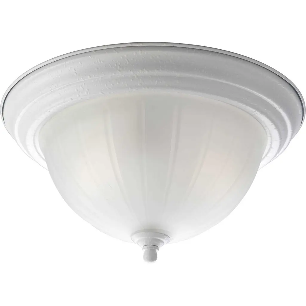 Two-light close-to-ceiling with etched ribbed melon glass with center lock up in Brushed Nickel finish.