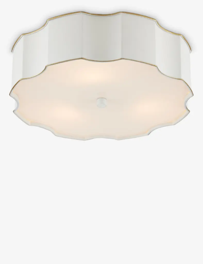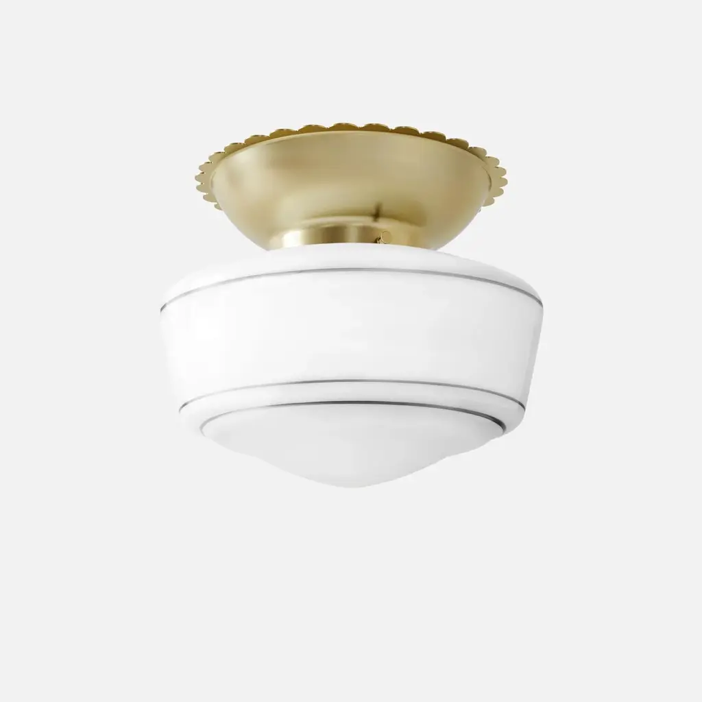 Polish a small-space style with the Mendez flush mount. This refined design features a metal collar with scalloped detailing and a matching finial for a versatile yet distinctive ceiling light fixture. The opaque glass diffuser offers a generous pool of ambient light throughout the room.