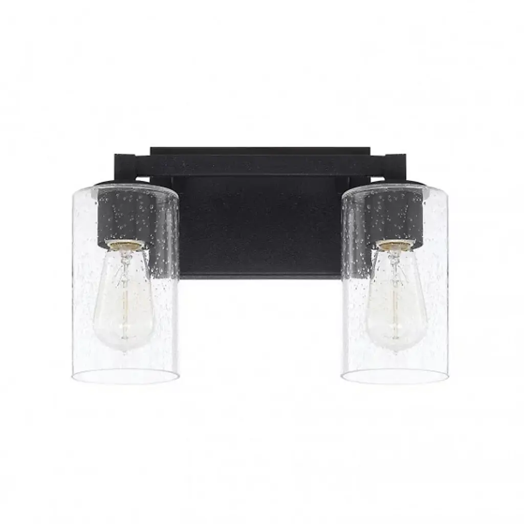 Bring stylish illumination into your space with the Golden Lighting Mercer 2-light Flush Mount in Matte Black. Featuring a glass shade and a matte black frame, it creates a warm and inviting atmosphere.The seeded glass shade features tiny air bubbles, giving a vintage appeal that beautifully diffuses light, creating an inviting ambiance.With a matte black finish that is both timeless and versatile, this fixture suits various decor styles. Ideal for low ceilings in hallways, bathrooms, or closets, it is damp location rated for spaces with occasional moisture.The overall dimensions are 14.5"W x 6"H x 14.5"D, requiring 2 E26 medium base bulbs (not included), with a maximum wattage of 60 per bulb.Elevate your home with this chic flush mount that blends functionality with aesthetic appeal.