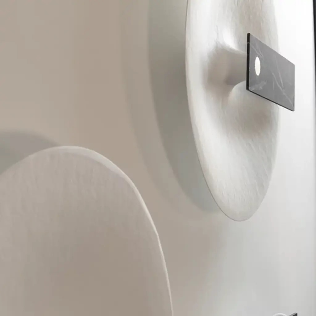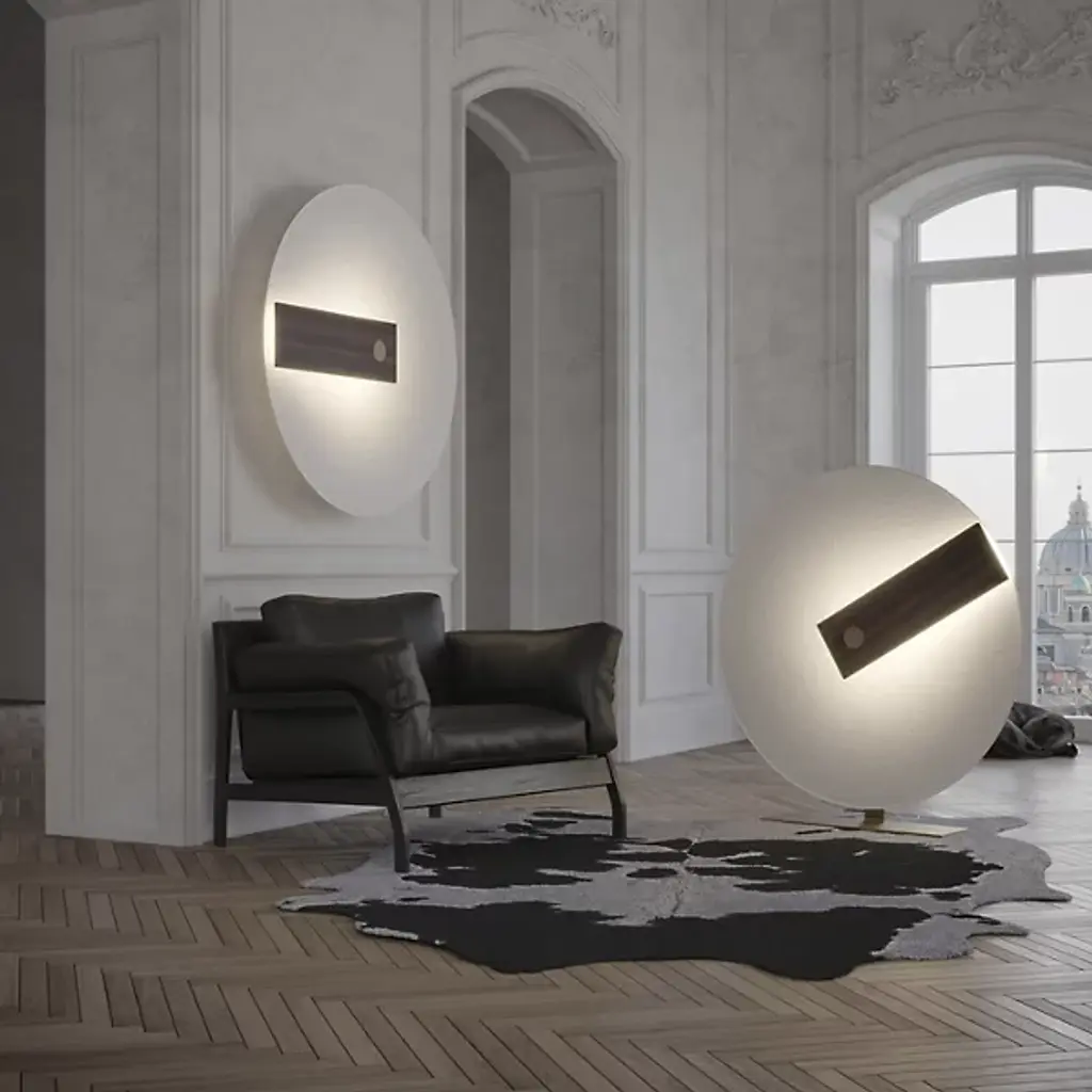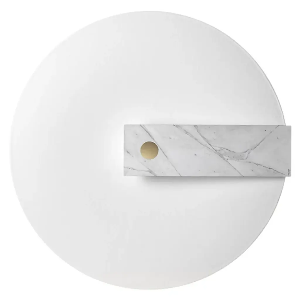 The Meridiana LED Wall / Flushmount by Hind Rabii features a captivating design inspired by the sundial. A large disk, symbolizing the sun, casts light through a clock-hand-like panel, creating a stunning contrast of light and shadow. Handcrafted by skilled artisans in Verviers, Belgium, each piece is carefully crafted and undergoes multiple inspections to ensure the highest quality. This unique design brings artistic flair and beautiful illumination to any space, making it a sophisticated lighting solution.
