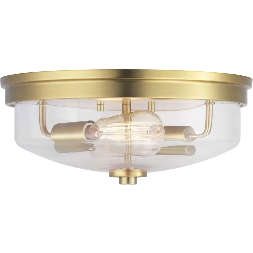 Inspired by modern architecture, Merit wo-light flush mount fixtures feature handsome details for variety of interior design styles. Clear glass highlights the lamp source and is finished in Brushed Bronze.
