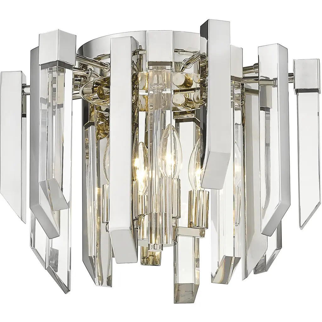 Elegance abounds with the Mersesse collection. Cut crystal surrounded with laser cut rectangular frames set in square and rectangular fixtures. Finished in Brushed Nickel, the Mersesse collection is a jewel for any home.