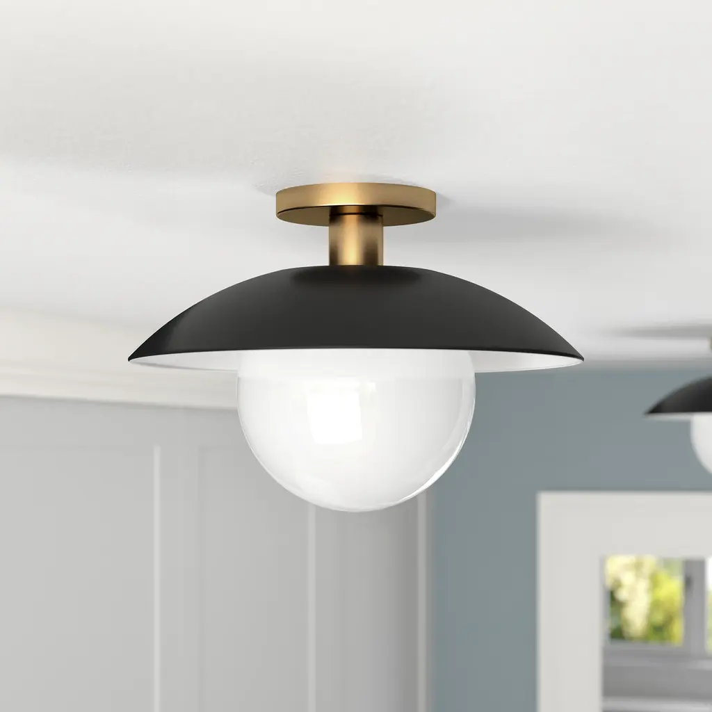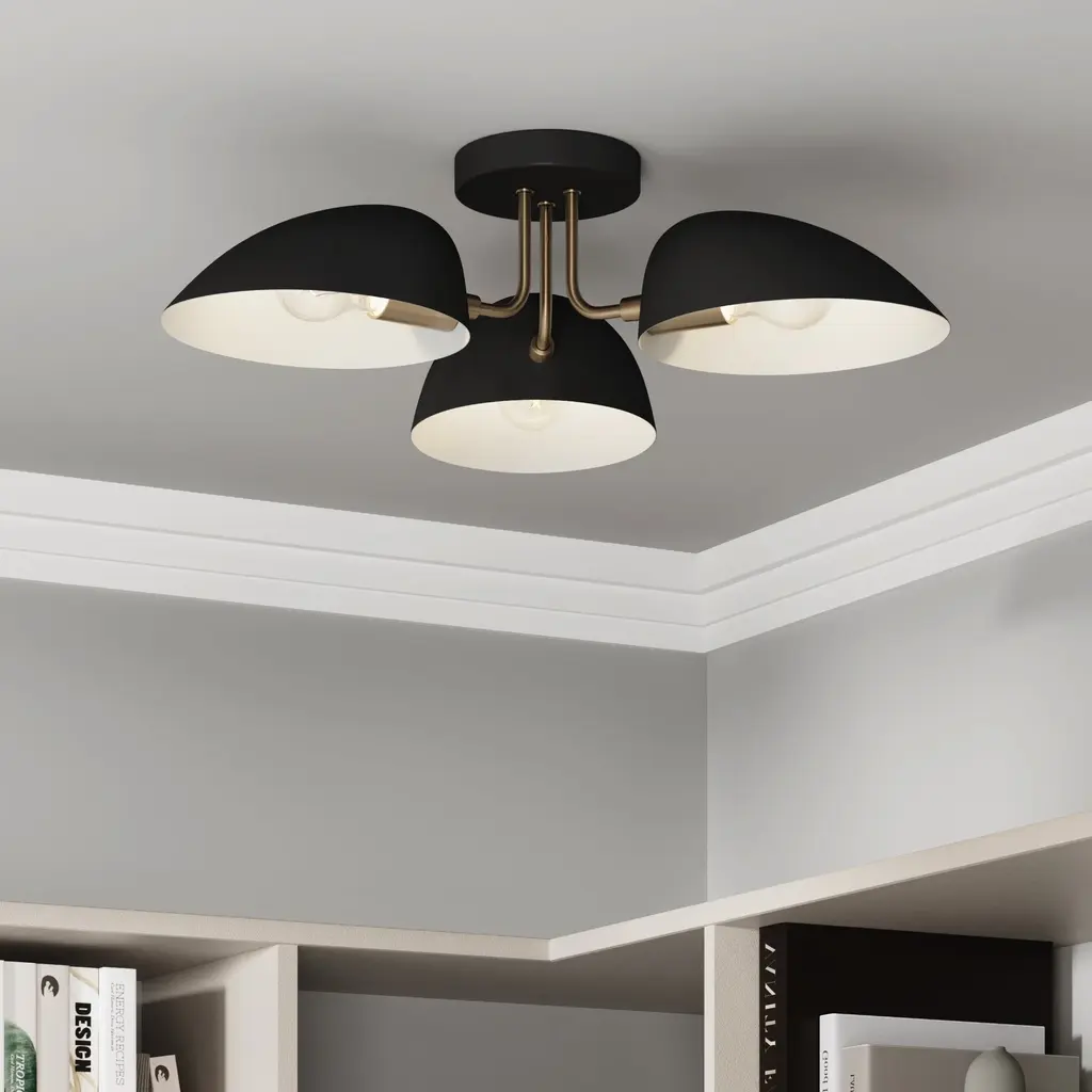 Our Argo Flush Mount features three individual arms with three shades in a stunning two tone finish of vintage brass and black. Gracefully illuminate your bedroom, hallway, or entryway (our location of choice!) with this modern retro design. Its rounded curves provide the perfect focal point of intrigue and sophistication. Adjust the shades to direct upwards for a soft lighting effect or adjust the shades facing down to provide ample light and style to any room.