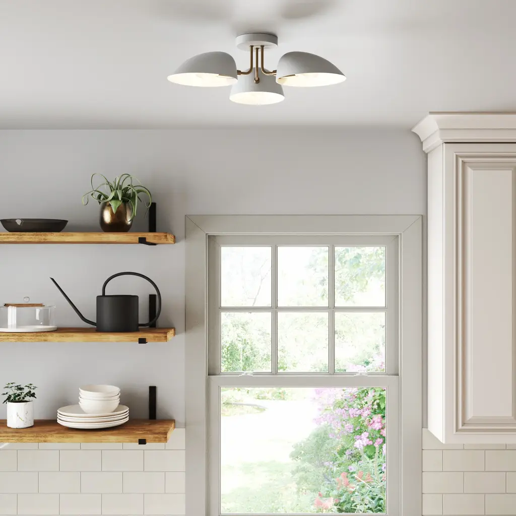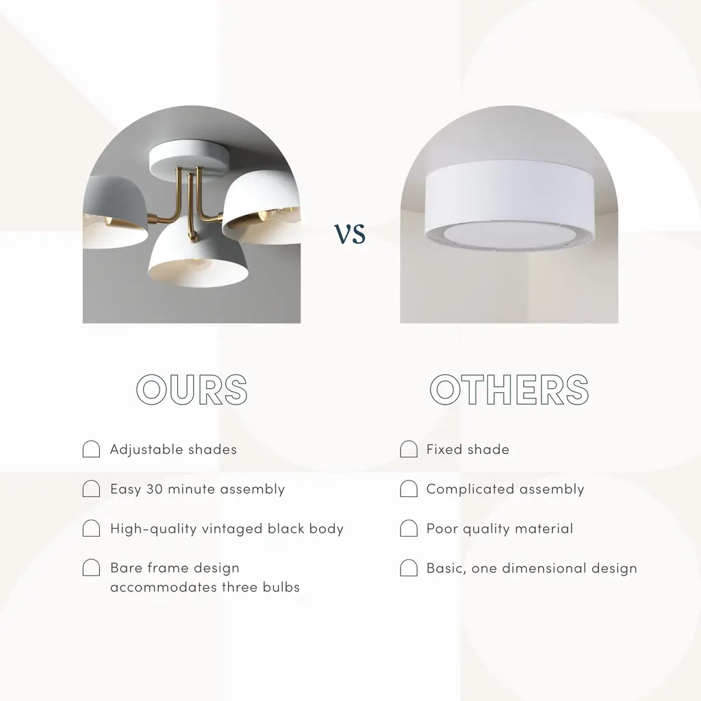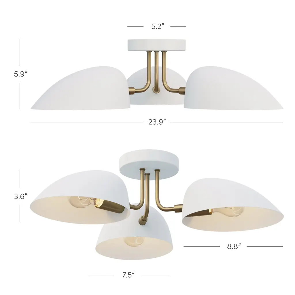 Our Argo Flush Mount features three individual arms with three shades in a stunning two tone finish of vintage brass and white. Gracefully illuminate your bedroom, hallway, or entryway (our location of choice!) with this modern retro design. Its rounded curves provide the perfect focal point of intrigue and sophistication. Adjust the shades to direct upwards for a soft lighting effect or adjust the shades facing down to provide ample light and style to any room.