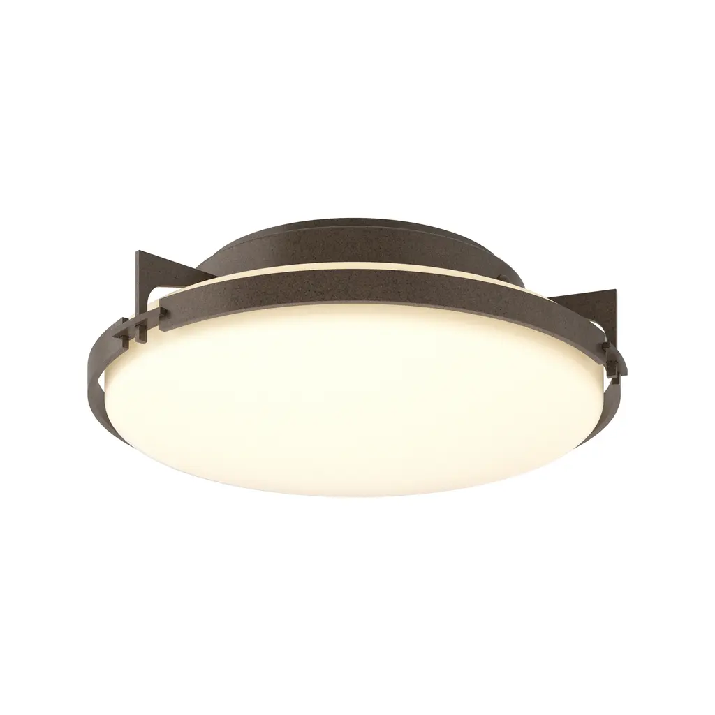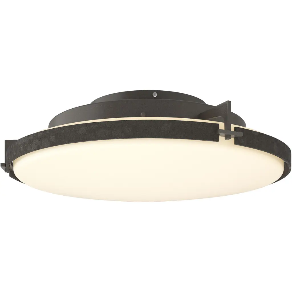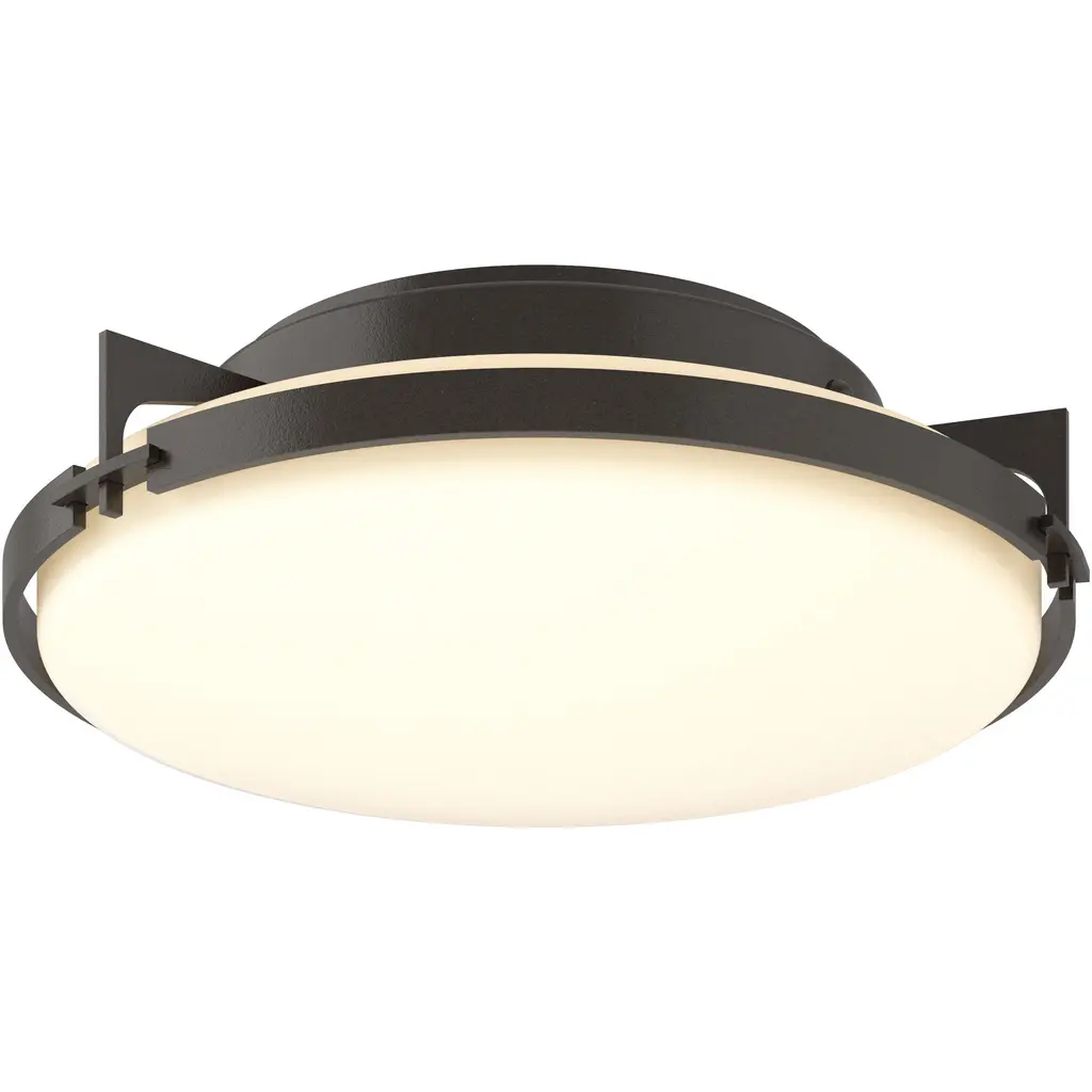 The Metra Large LED Flushmount by Hubbardton Forge adds a smooth and classic touch to living spaces. An Opal Glass shade is hand blown into a disk-like shape to provide an evenly diffused light with a minimalistic silhouette. A hand forged wrought Iron body begins with a round canopy that tiers downward with thin arms, connecting to a metal band that encircles the glass shade. Simple rivet detailing completes the look of this fixture, which matches well with a variety of décor.
