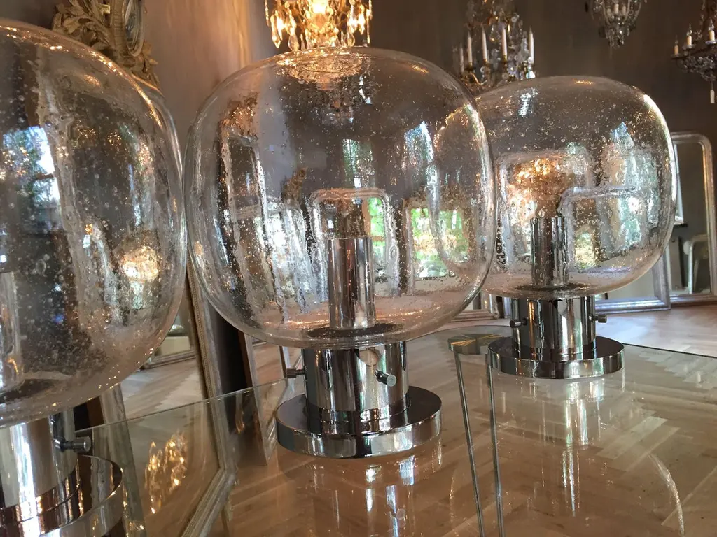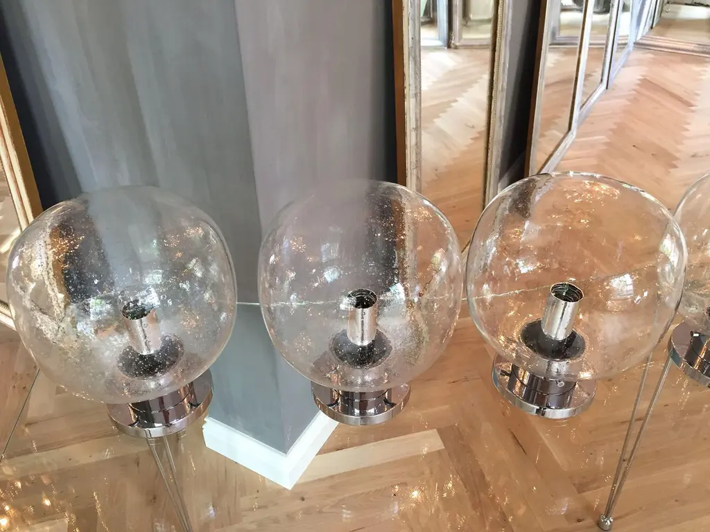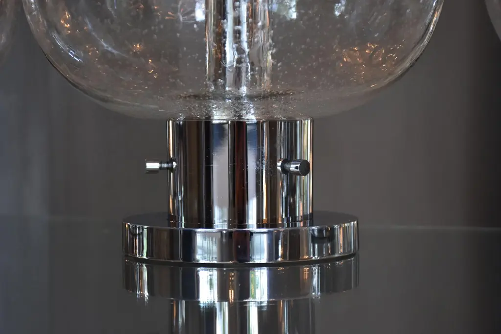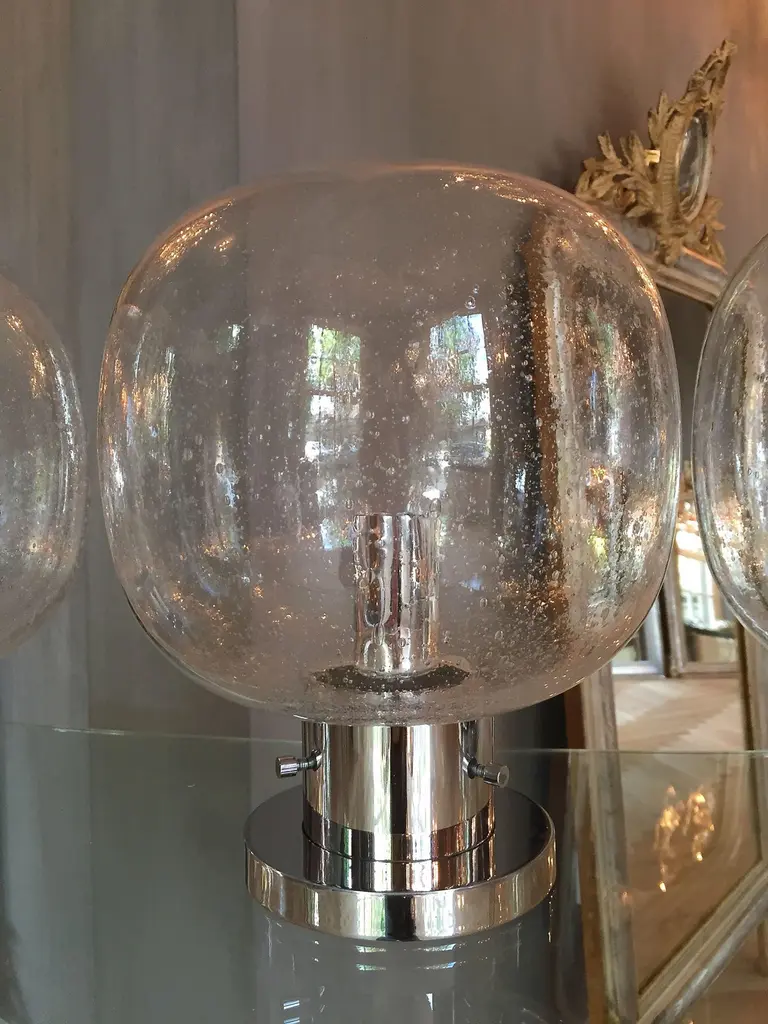 A beautiful ceiling lamp/ pendant from RAAK Amsterdam.Clear glass handblown ball lamp with 'teardrops' inside the glass and a chromed and polished steel frame.Condition-very good, high quality beautiful finish!Price is per piece. 4 pieces available.RAAK- Amsterdam is a Dutch lamp factory founded in 1954 by Carel O. Lockhorn, formerly working at Philips Netherlands in Eindhoven. RAAK designed innovative light objects, often in understated design. Characteristic for RAAK are the beautiful and well-finished materials. The Globe lamp (designed in 1961) is a well-known object. The bulb of the lamp was made of clear or smoked glass and was from the German Pfeil & Putzler.