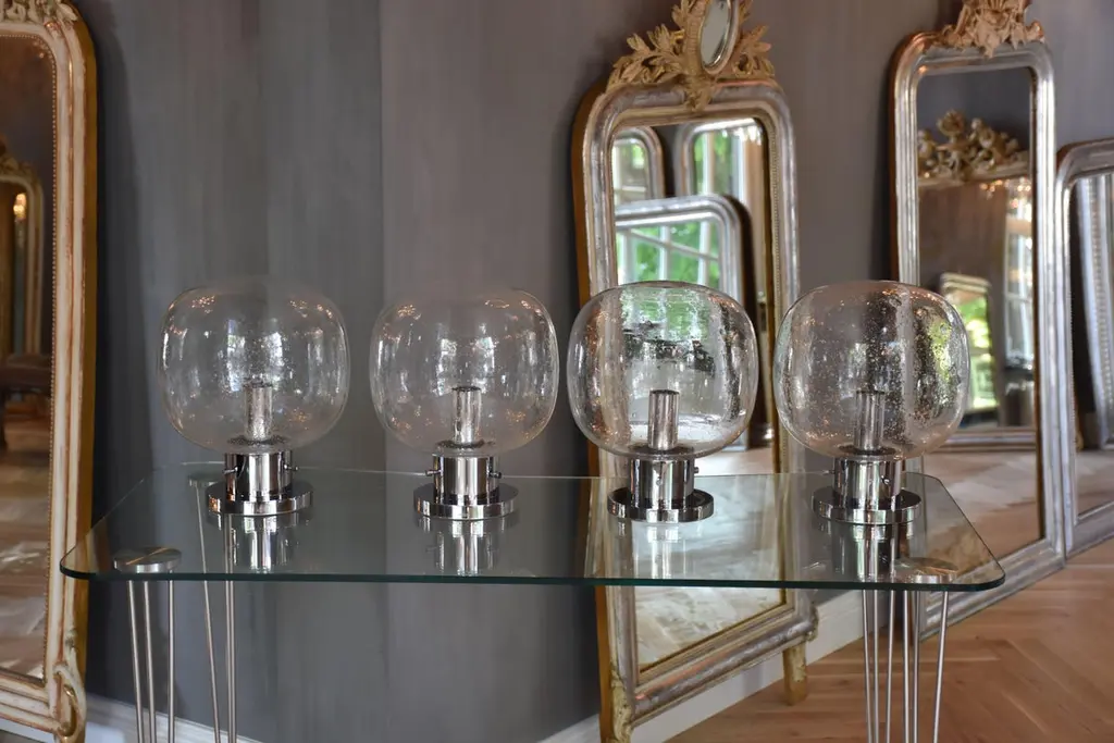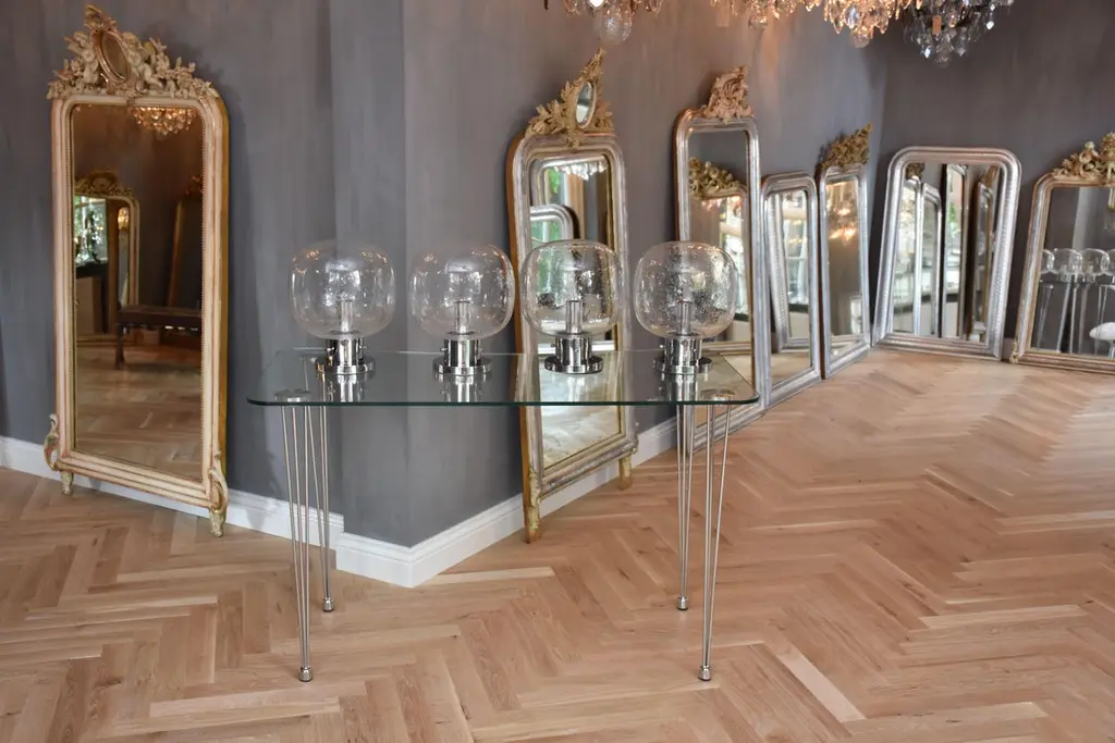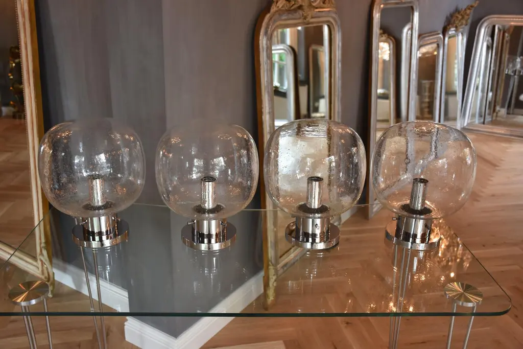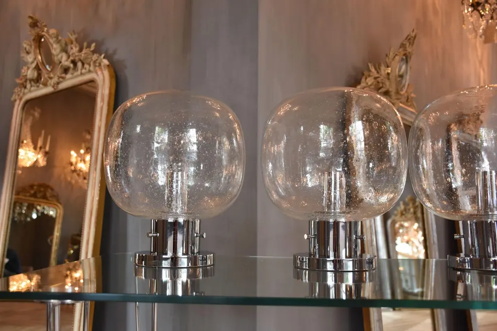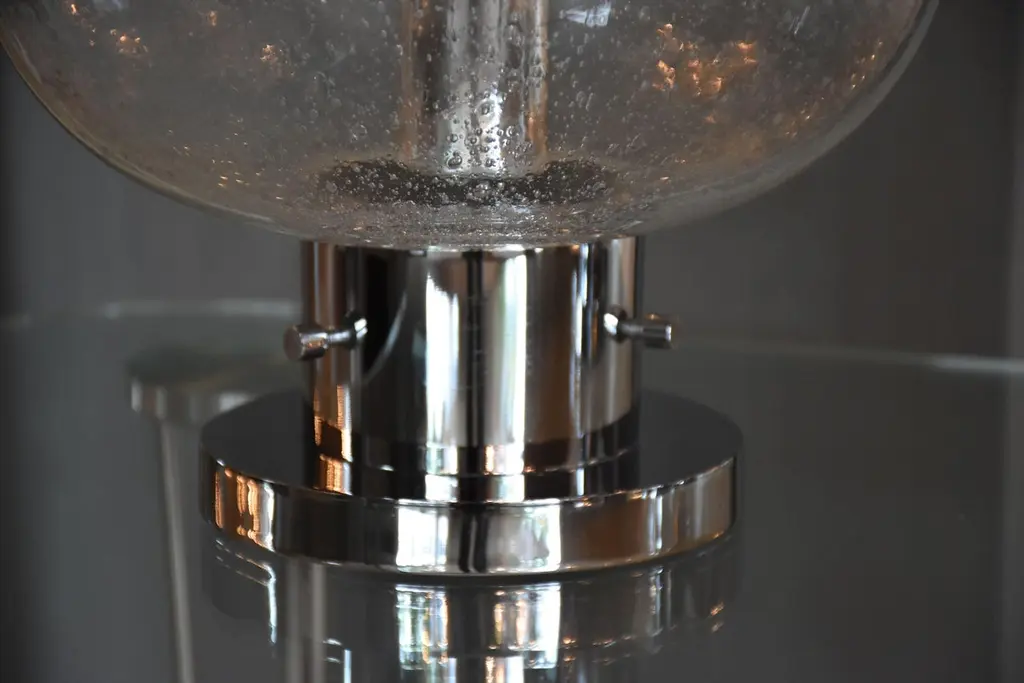 A beautiful ceiling lamp/ pendant from RAAK Amsterdam.Clear glass handblown ball lamp with 'teardrops' inside the glass and a chromed and polished steel frame.Condition-very good, high quality beautiful finish!Price is per piece. 4 pieces available.RAAK- Amsterdam is a Dutch lamp factory founded in 1954 by Carel O. Lockhorn, formerly working at Philips Netherlands in Eindhoven. RAAK designed innovative light objects, often in understated design. Characteristic for RAAK are the beautiful and well-finished materials. The Globe lamp (designed in 1961) is a well-known object. The bulb of the lamp was made of clear or smoked glass and was from the German Pfeil & Putzler.